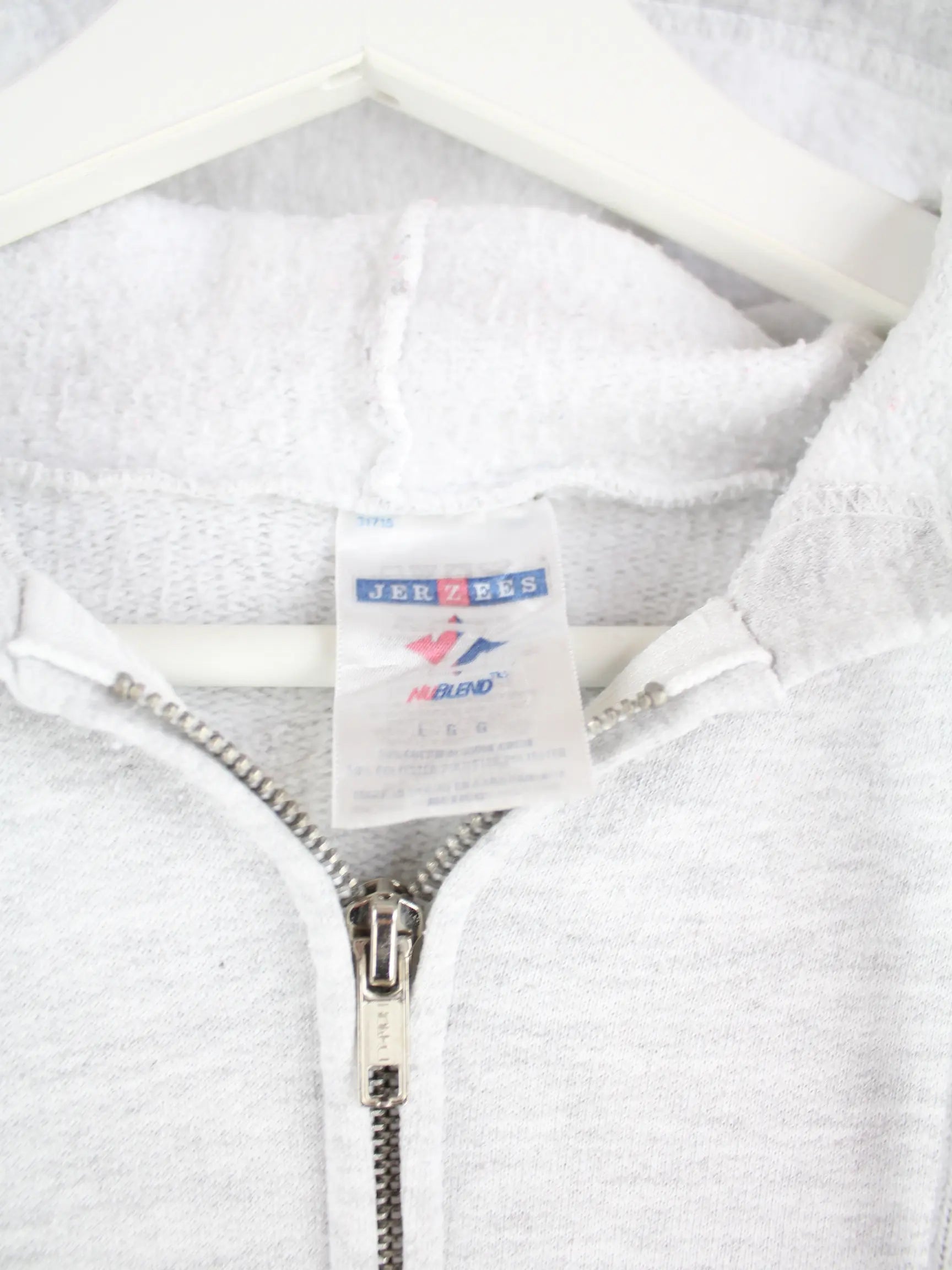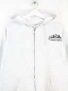Grauer Hoodie mit durchgehendem Reißverschluß der Marke Jerzees in Größe L. Er ist aus einer Baumwollmischung produziert. Den Zustand würden wir als 'In Ordnung' bezeichnen (vergl. Bilder).