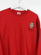 Roter Sweater mit gesticktem Logo auf der Brust.