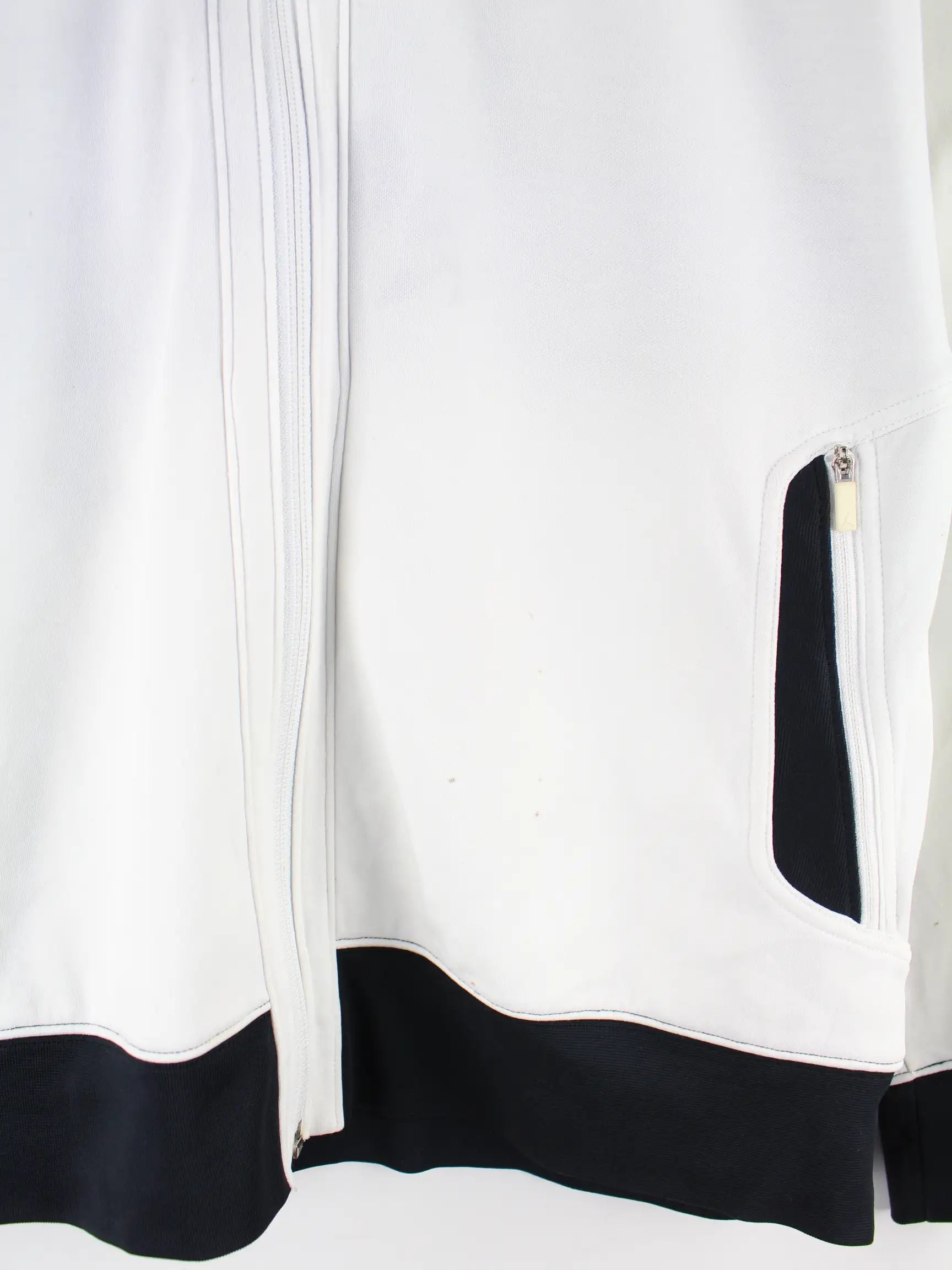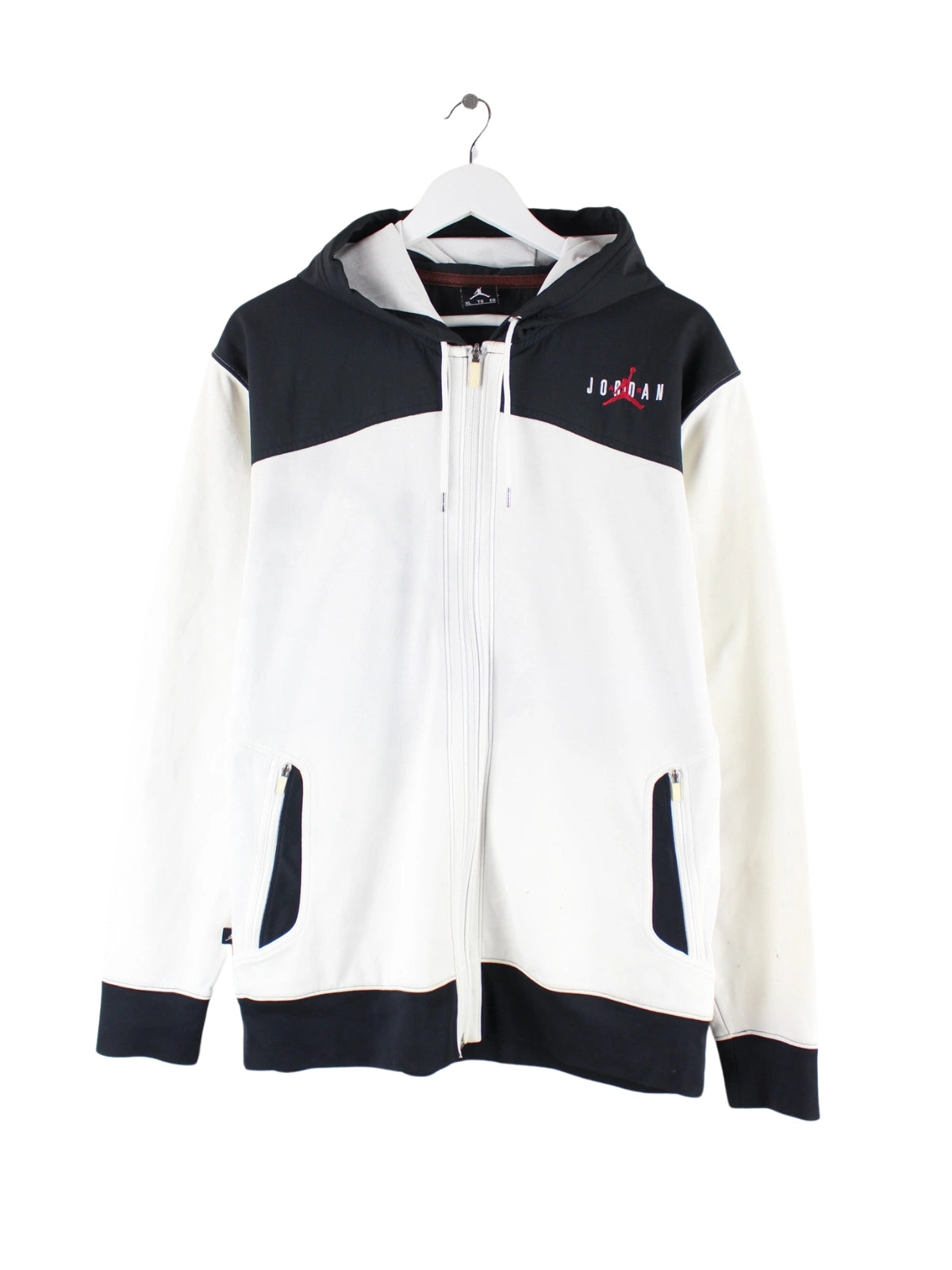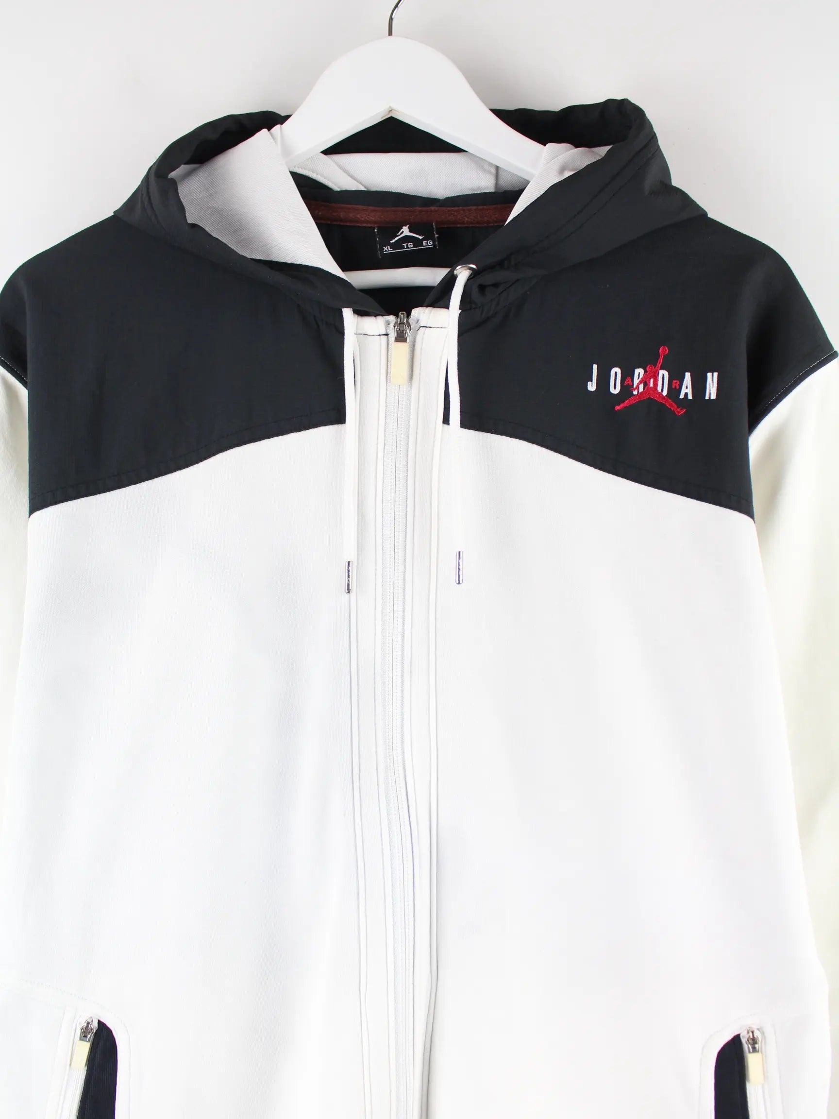 Hoodie aus dem Hause Jordan mit gestickten Motiven und durchgehendem Reißverschluß in Größe XL. Er ist aus Synthetik angefertigt und in Weiß im Bestand.