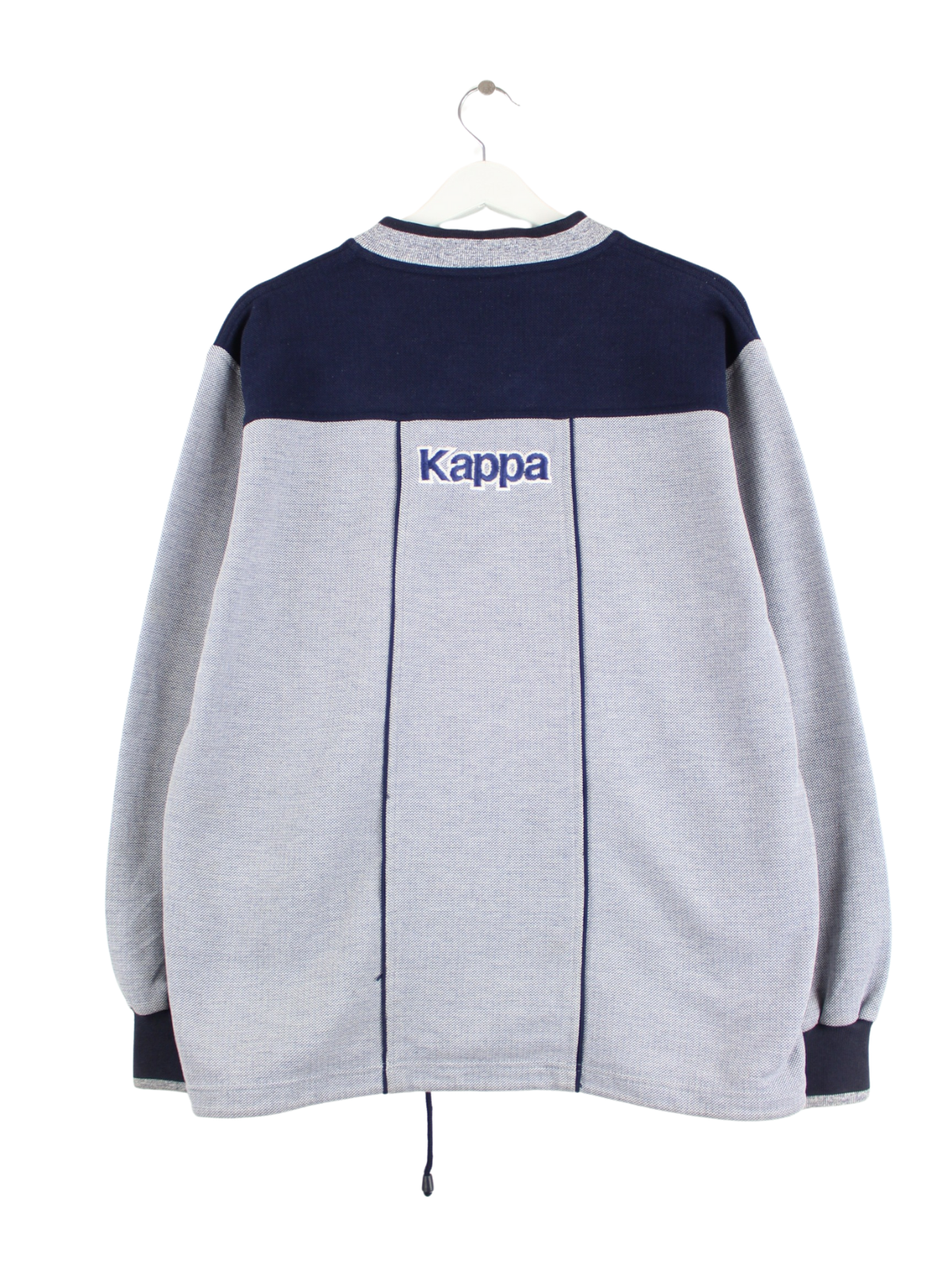 Grauer Sweater mit Stick vom Brand Kappa aus den 90'ern in Größe M. Er ist aus einer Baumwollmischung gefertigt und in sehr gutem Zustand auf Lager.