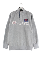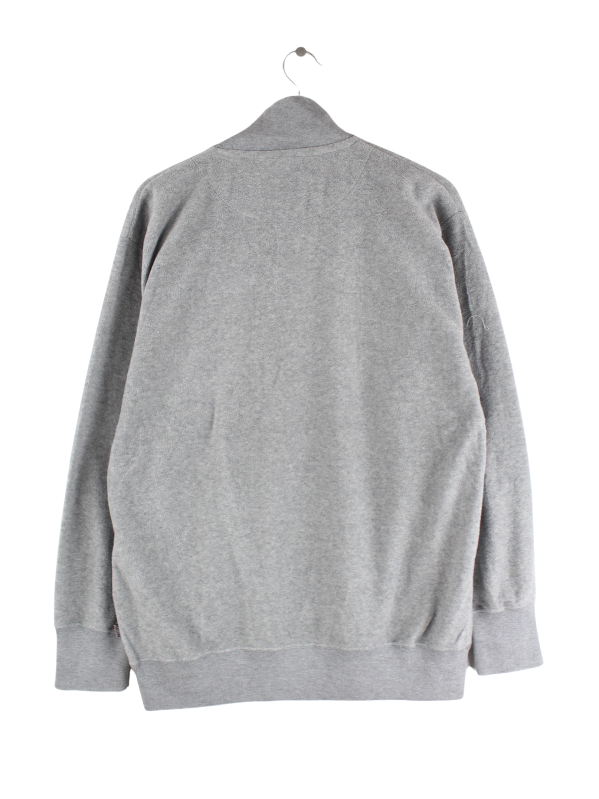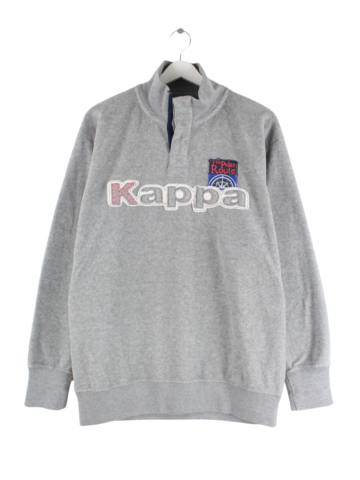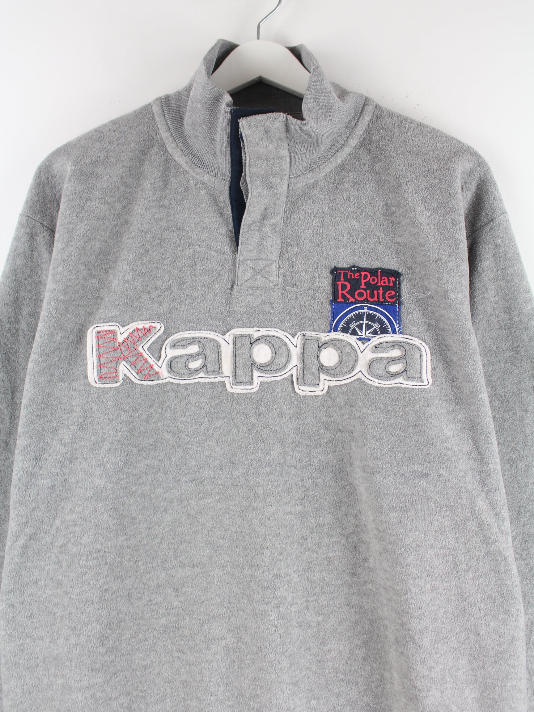 Grauer Sweater mit Stick vom Brand Kappa in Größe L. Er ist aus gemütlichem Fleece und in sehr gutem Zustand zu haben.