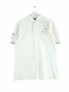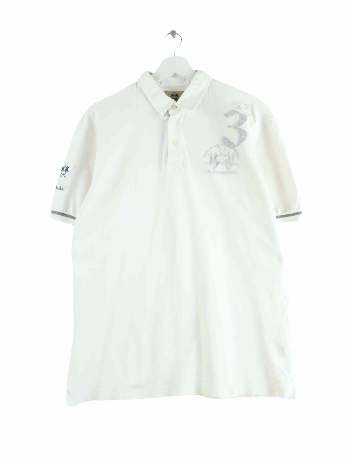 Weißes Poloshirt mit gestickten Motiven vom Label La Martina in Größe L. Es ist aus Baumwolle gemacht und in gutem Zustand im Bestand.