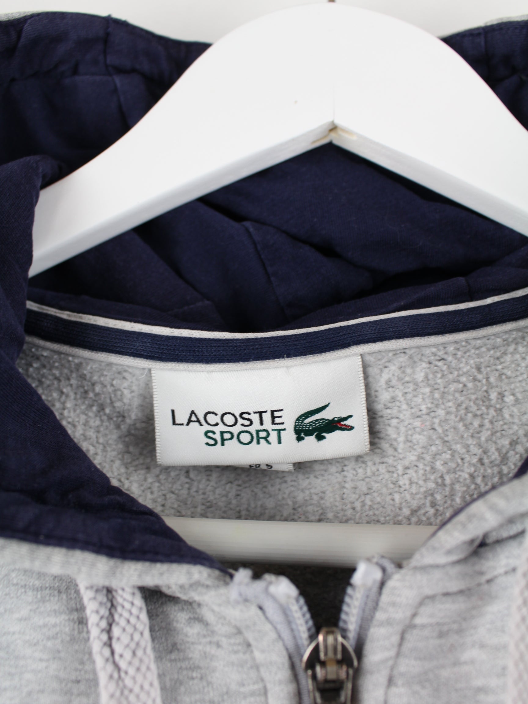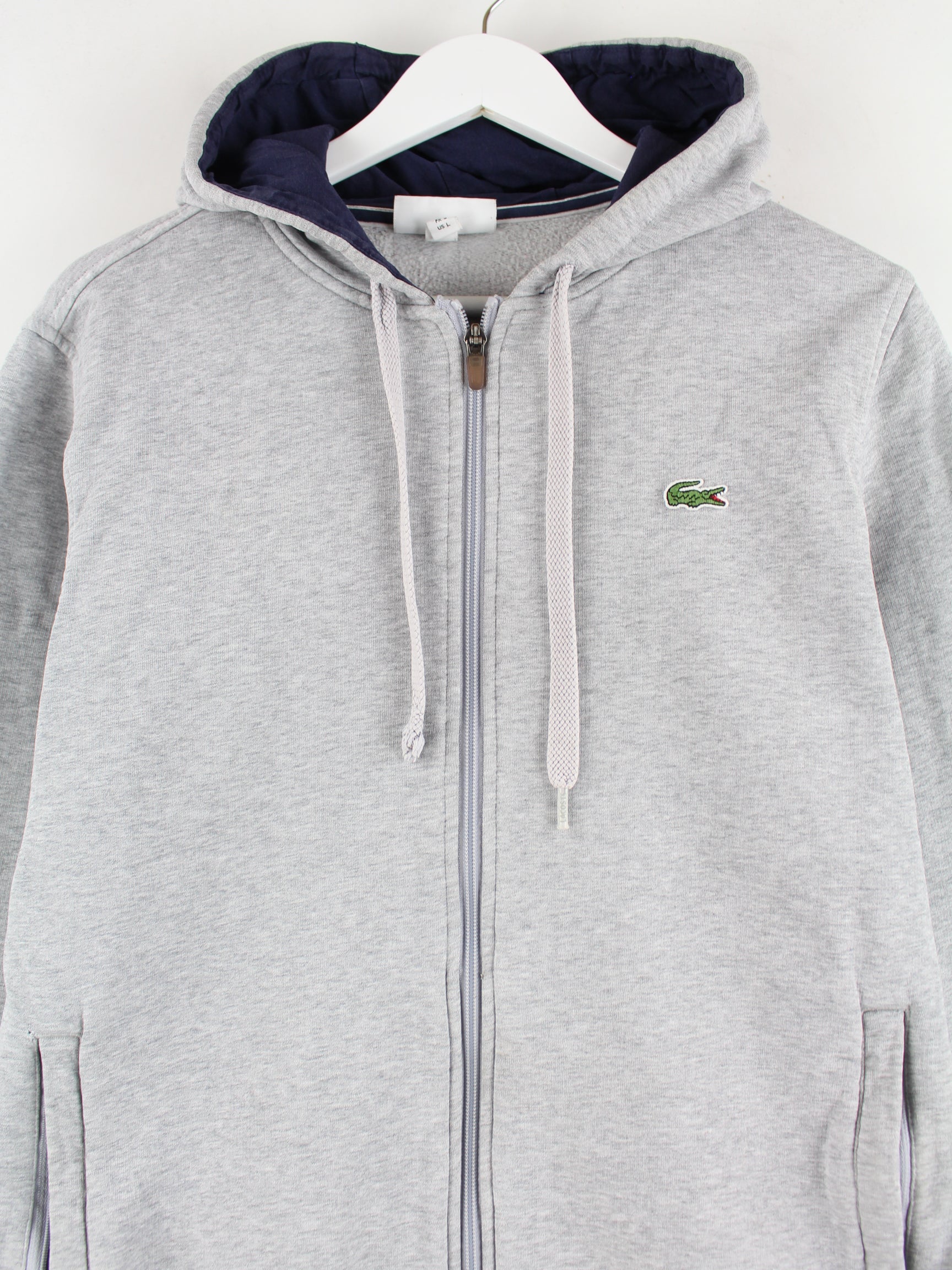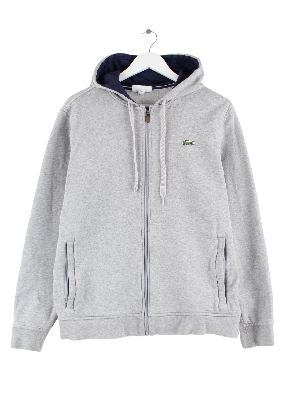 Grauer Hoodie mit langem Reißverschluß vom Label Lacoste in Größe S. Er ist aus einer Baumwollmischung gemacht und in gutem Zustand bei uns zu bekommen.