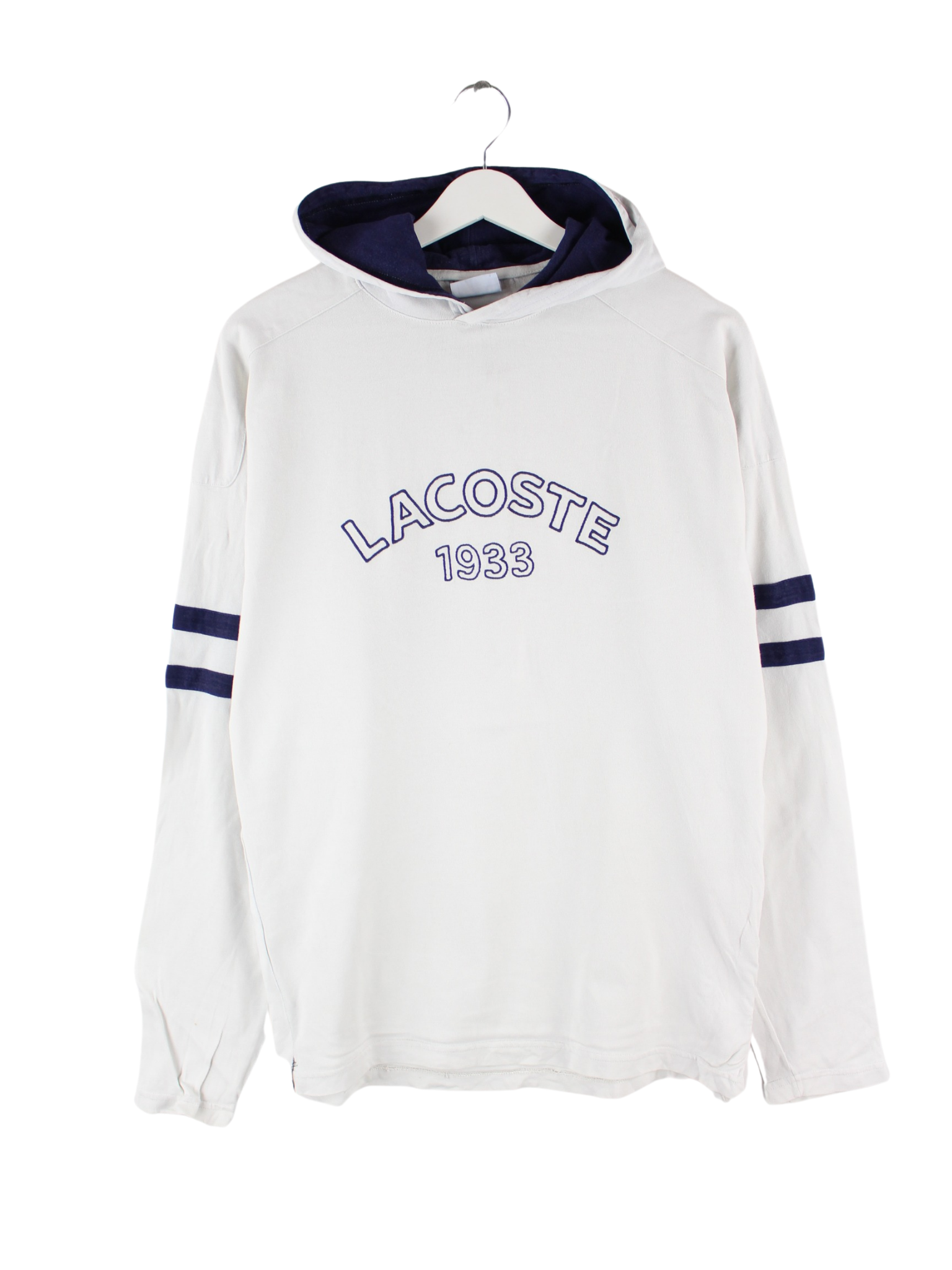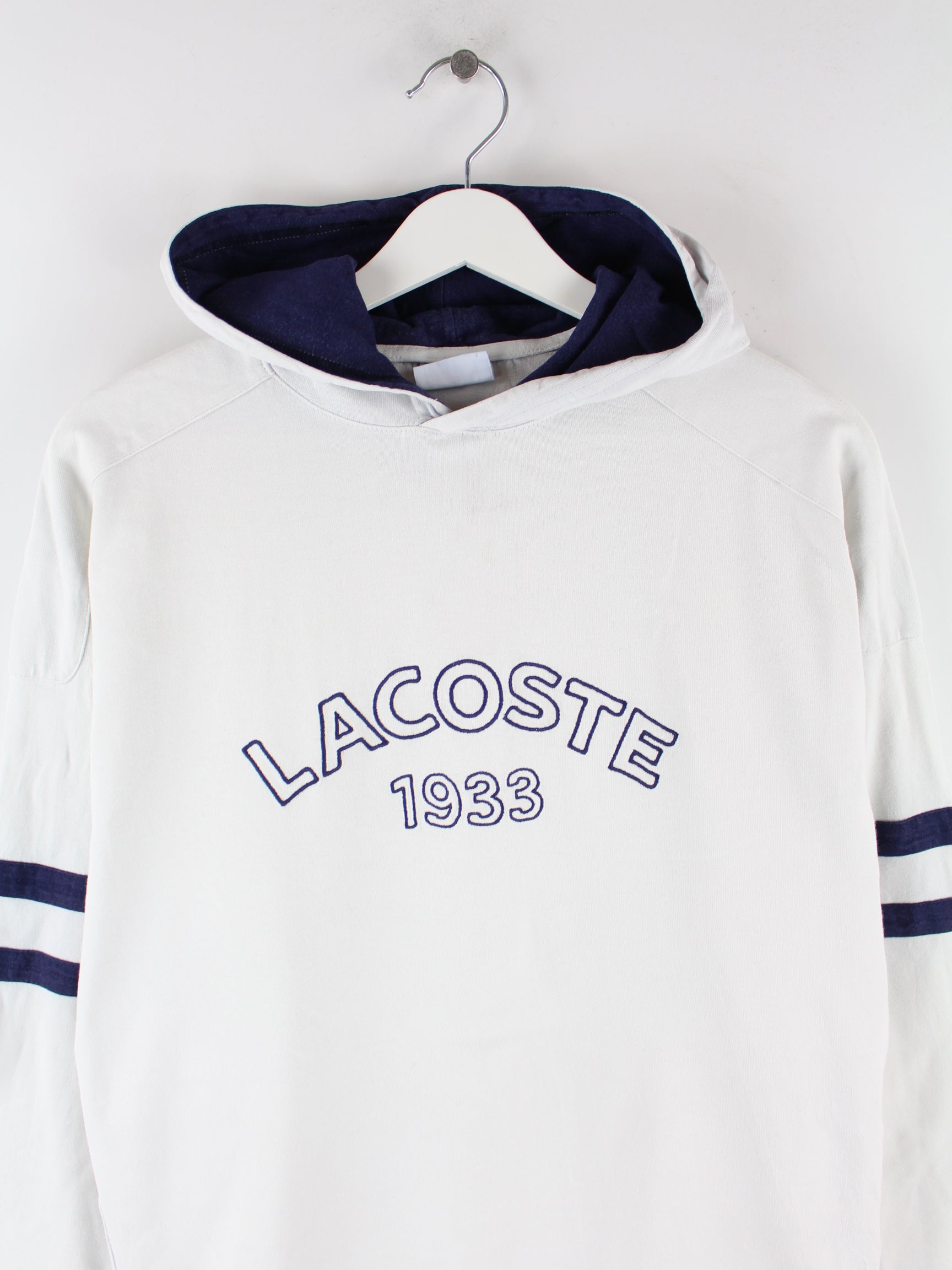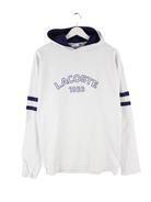 Hoodie des Labels Lacoste mit Stickereien in Größe L. Er ist aus einer Baumwollmischung hergestellt und in Weiß bei uns vorrätig.