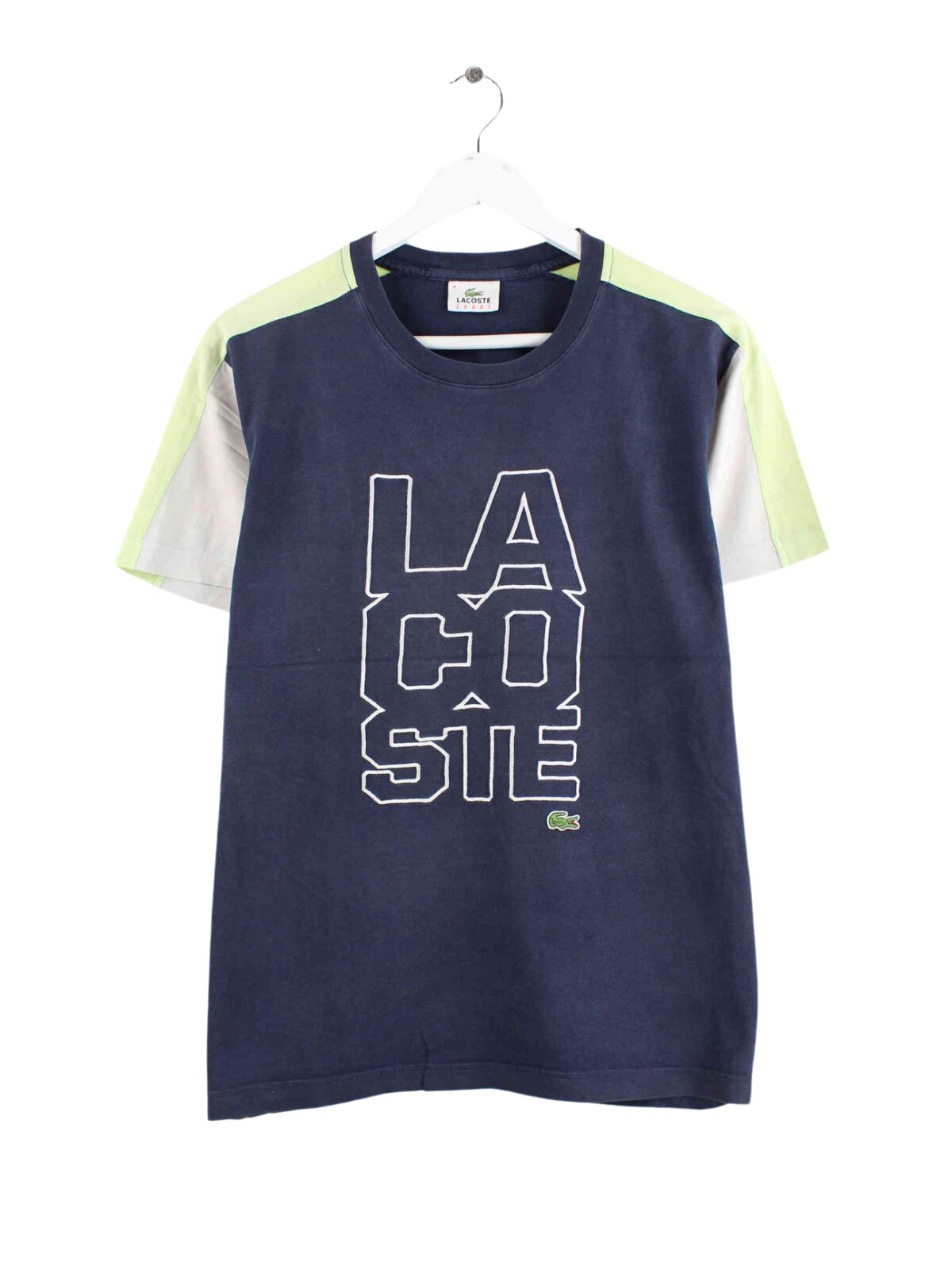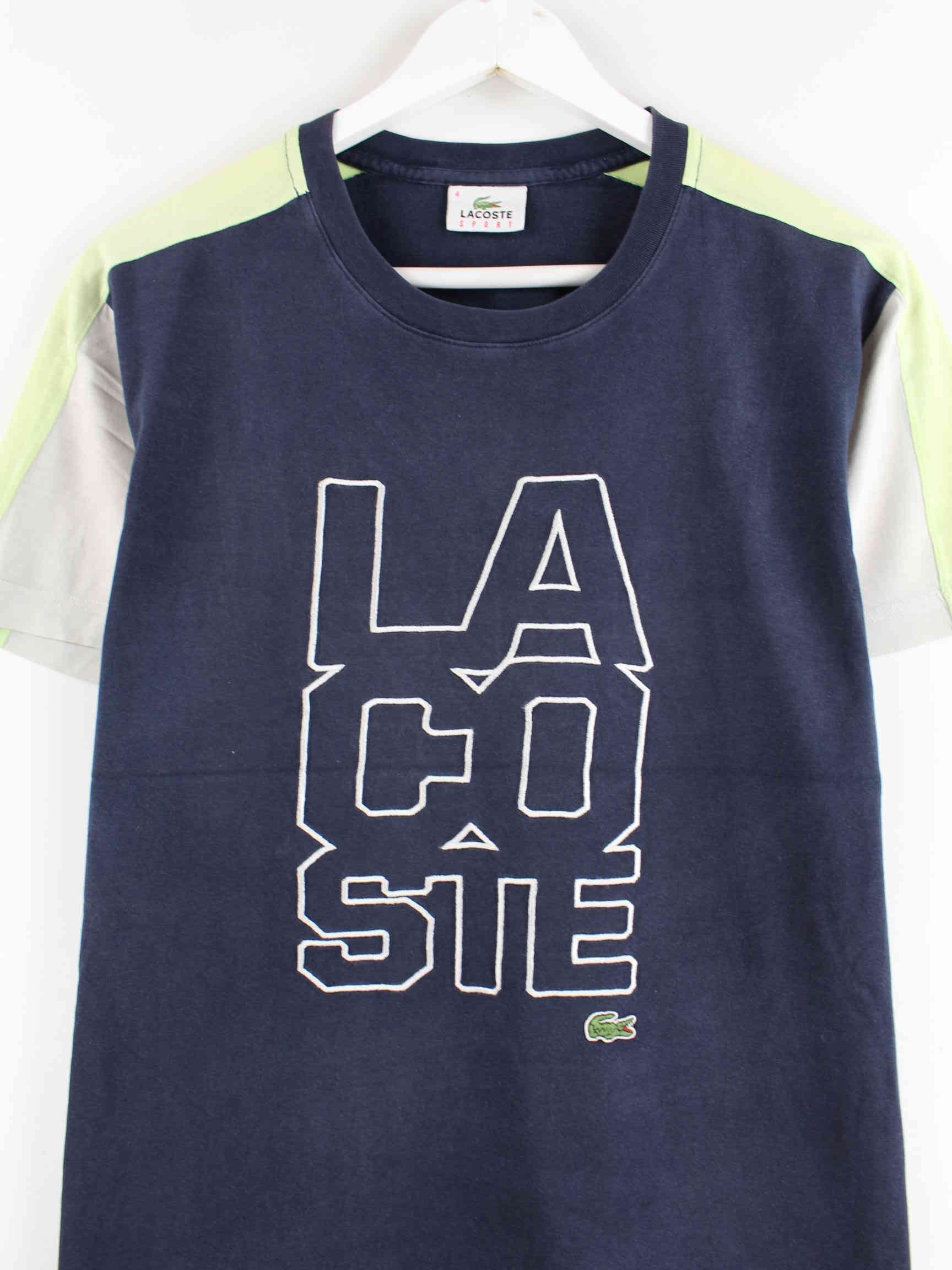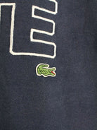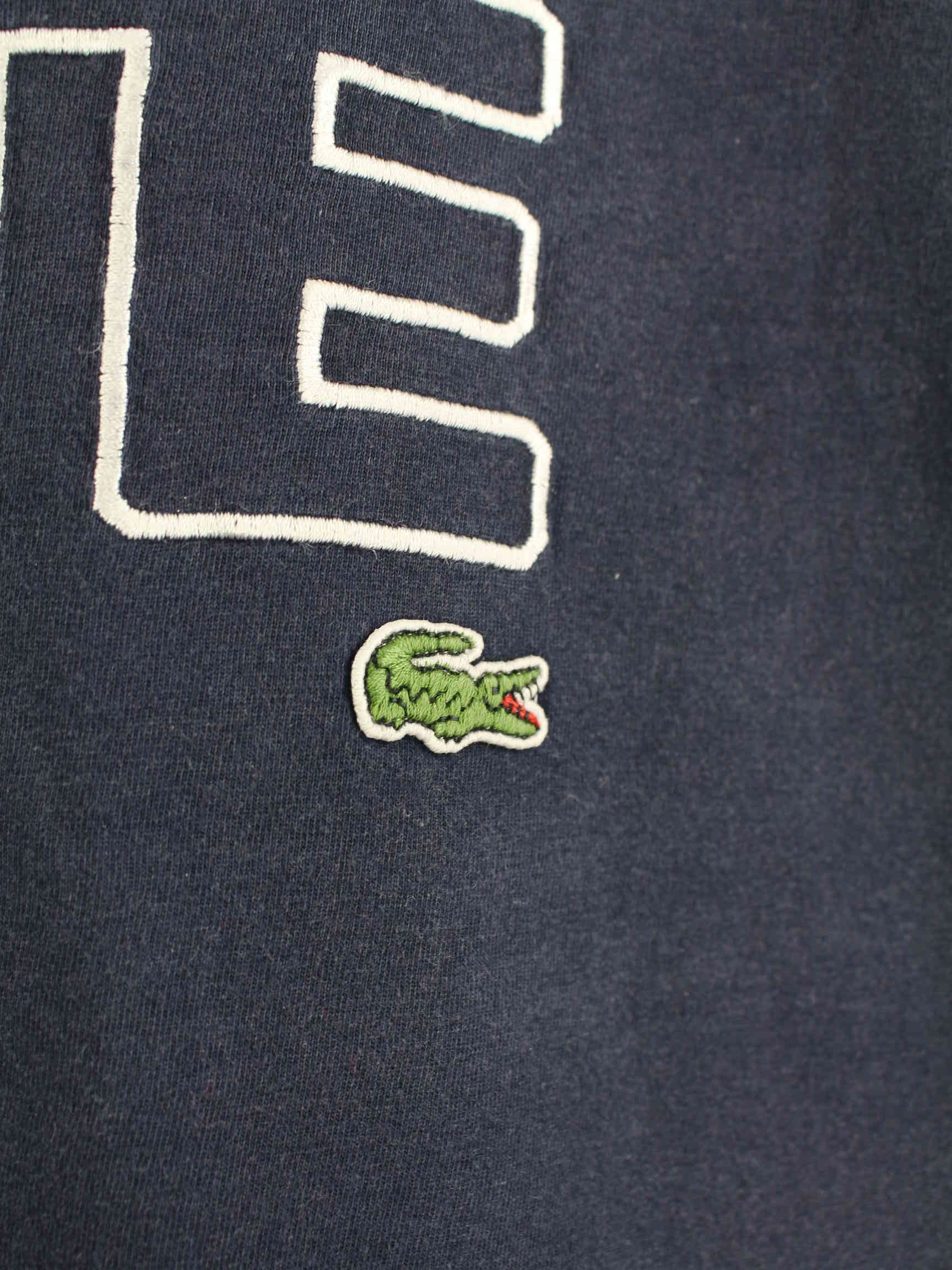 Schwarzes T-Shirt mit gestickten Mustern vom Brand Lacoste in Größe S. Es ist aus Baumwolle gefertigt und in sehr gutem Zustand auf Lager.