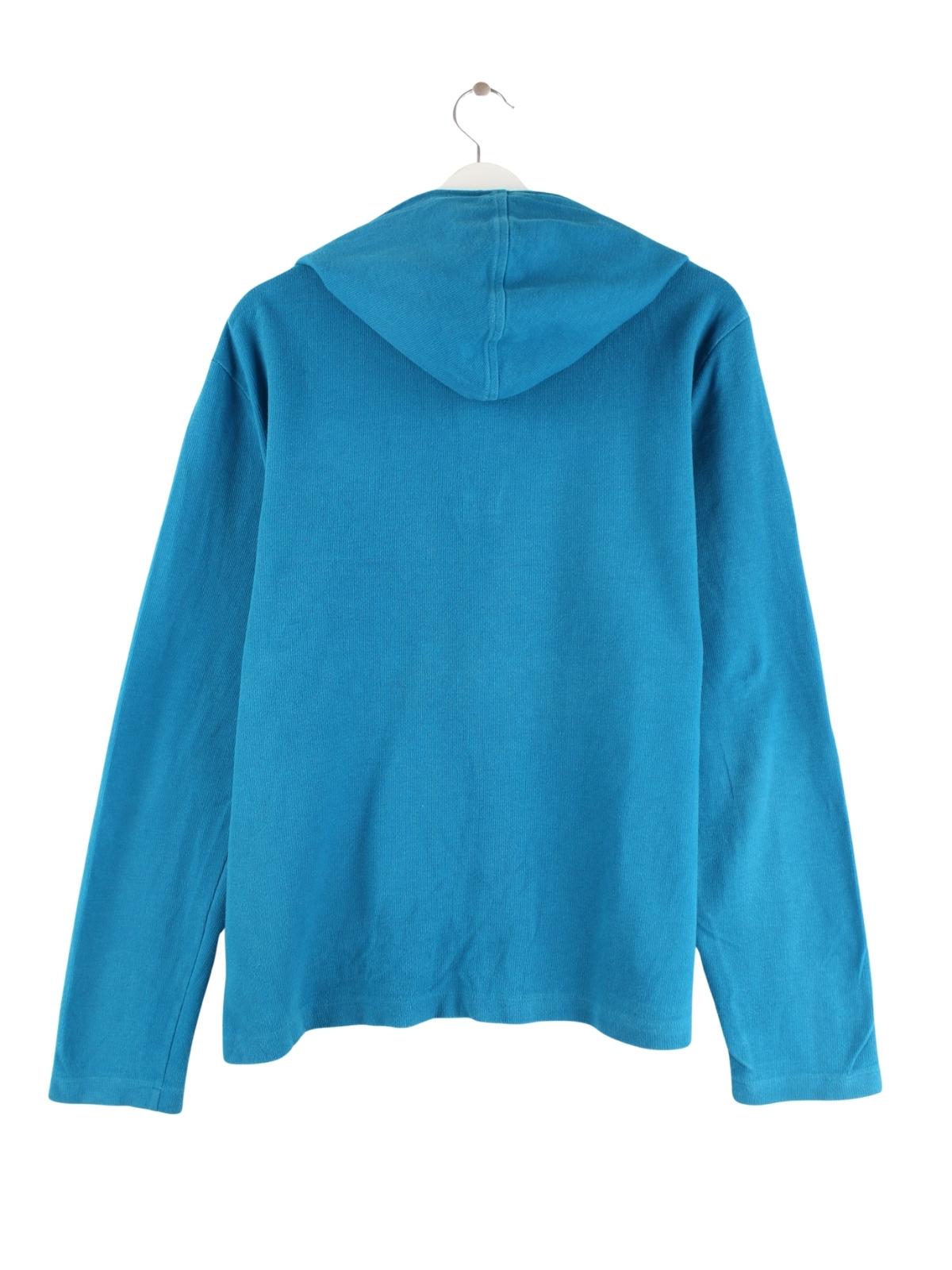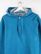 Kapuzenpullover der Marke Lacoste in Größe 5 / M, mit kleinem Logo. Er ist aus einer Baumwollmischung gemacht und in Blau in Stock.