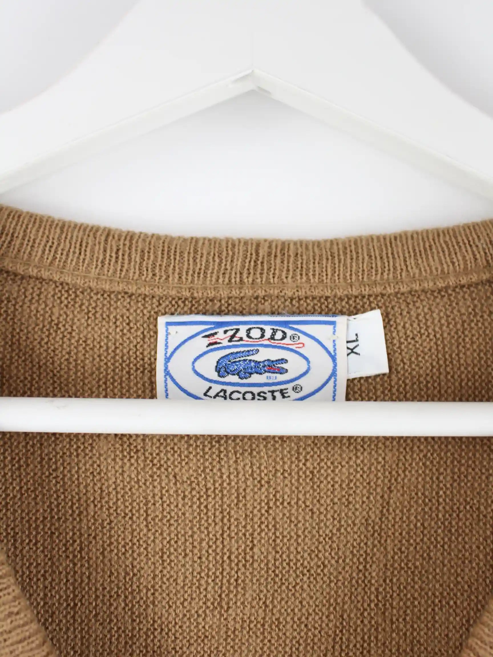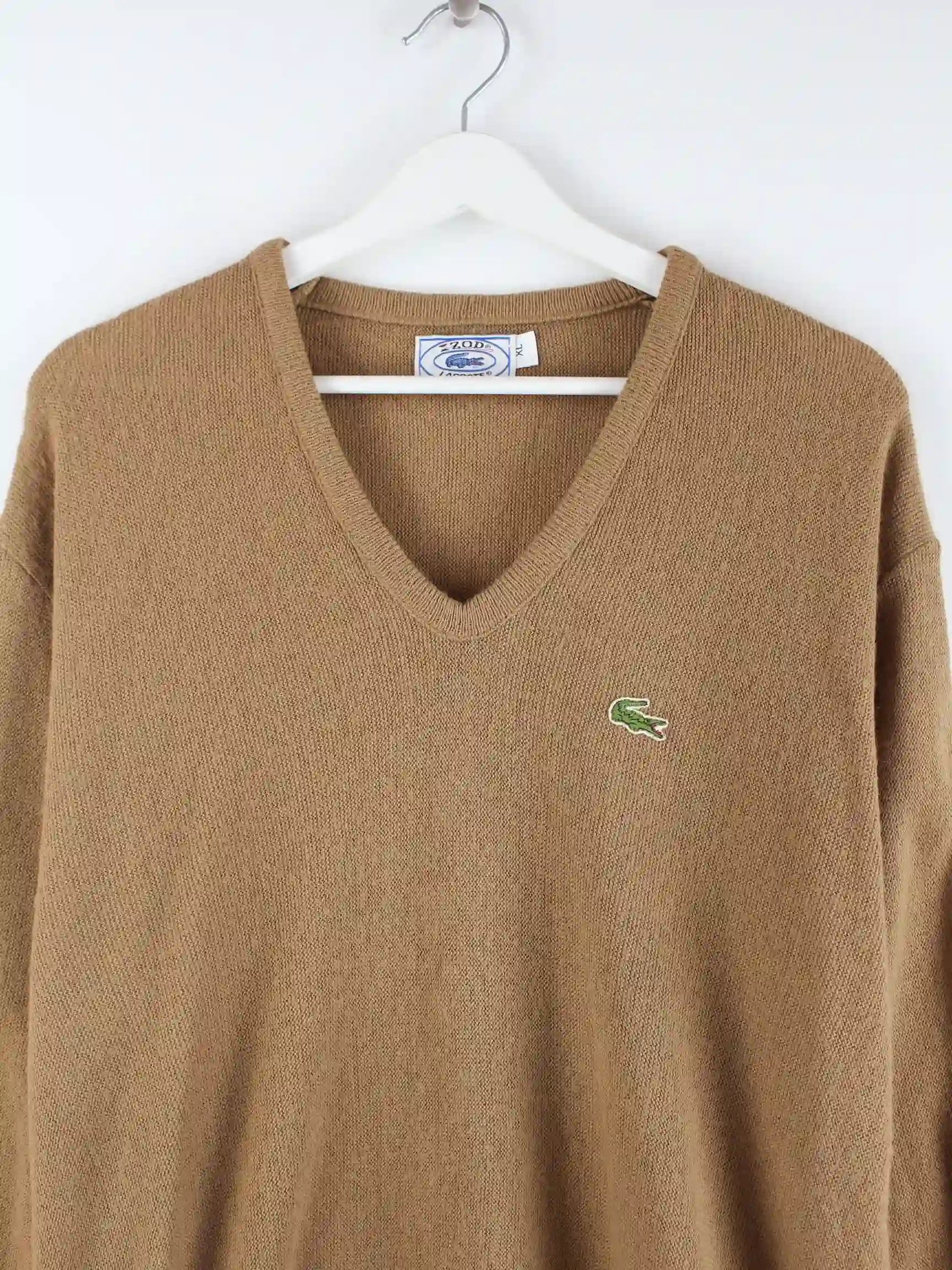 Pullover der Marke Lacoste in Größe XL aus den 80'ern. Er ist aus Baumwolle angefertigt und in Braun im Bestand.