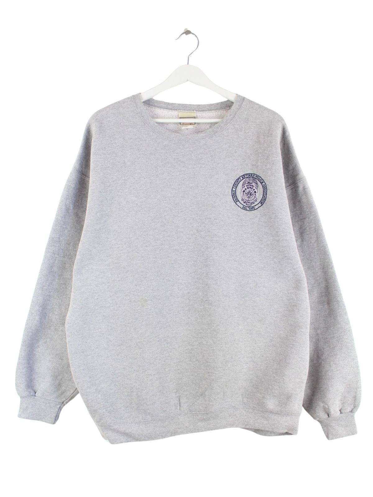 Grauer Sweater mit gestickten Motiven des Labels Lee in Größe XXL. Er ist aus einer Baumwollmischung produziert und in gutem Zustand in Stock.