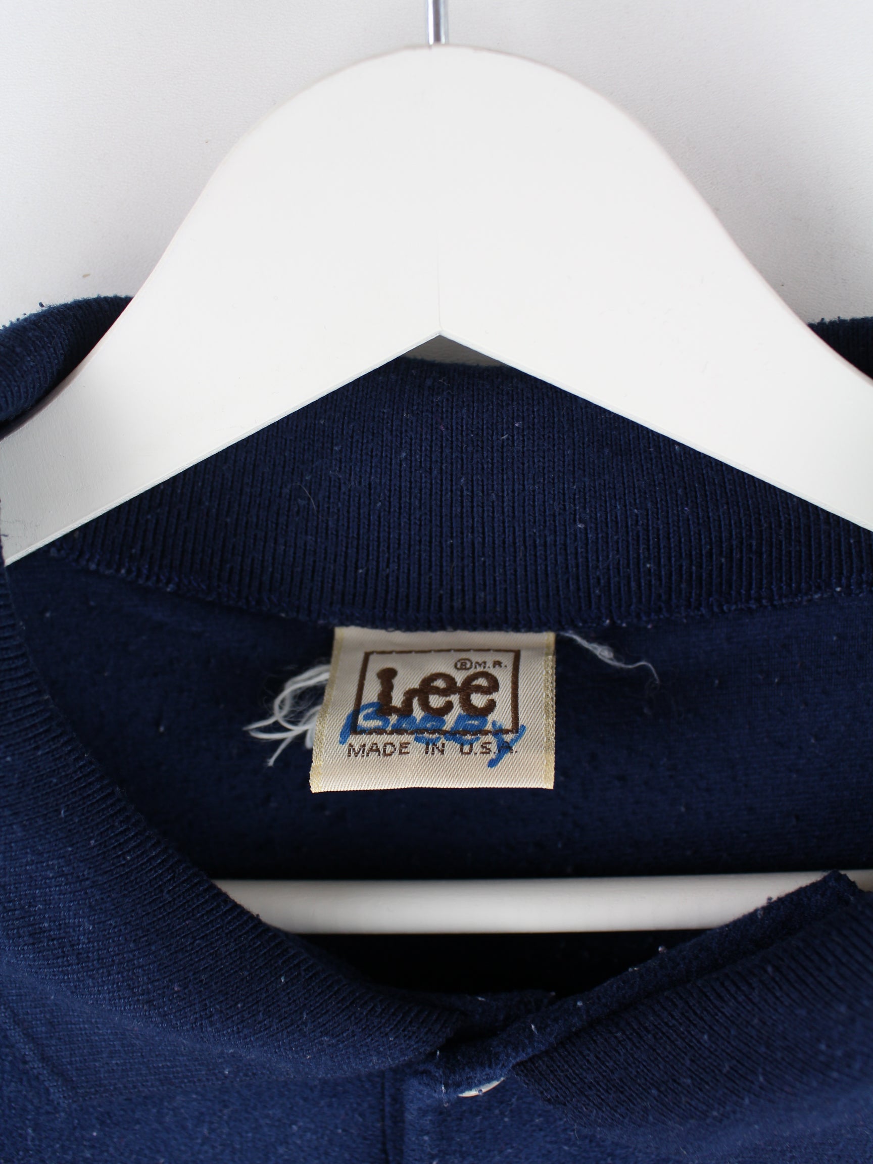 Blauer Sweater von Lee aus den 80'ern in Größe S. Er ist aus einer Baumwollmischung produziert und in gutem Zustand bei uns vorrätig.