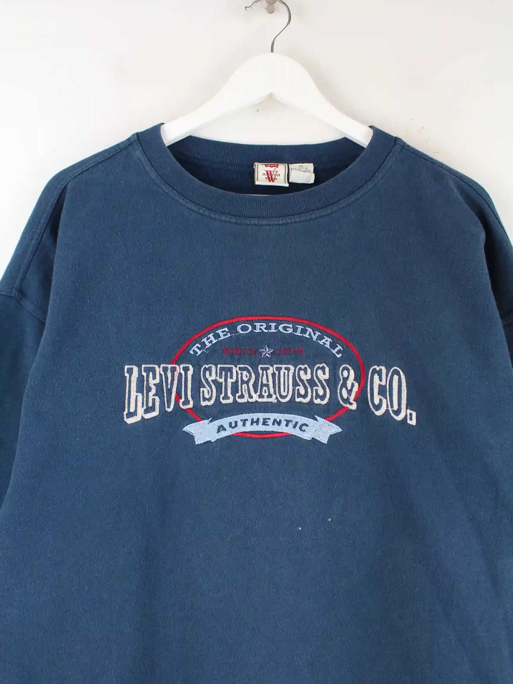 Sweater vom Label Levi's mit Stickereien in Größe M. Er ist aus einer Baumwollmischung produziert und in Blau bei uns vorrätig.