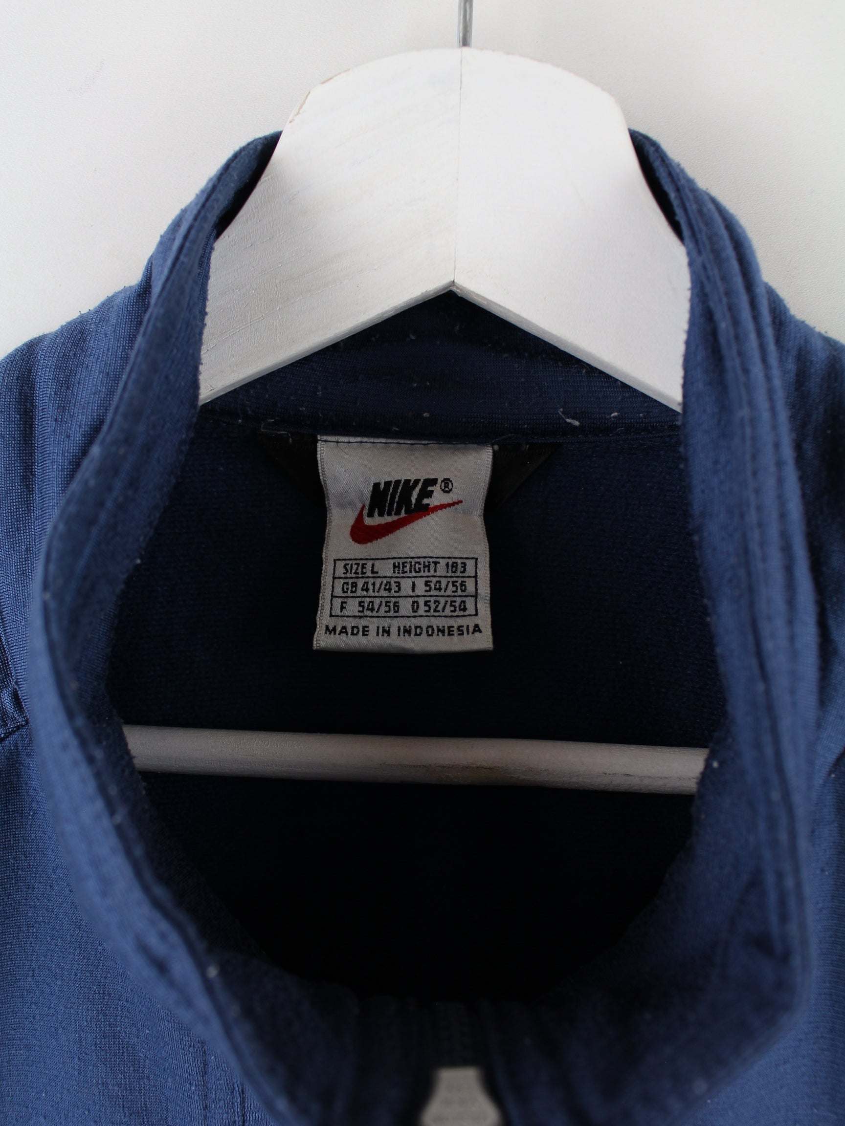 Blaue Trainingsjacke der Marke Nike aus den 90'ern in Größe L. Sie ist aus Synthetik gemacht. Den Zustand würden wir als 'In Ordnung' bezeichnen (vergl. Bilder).