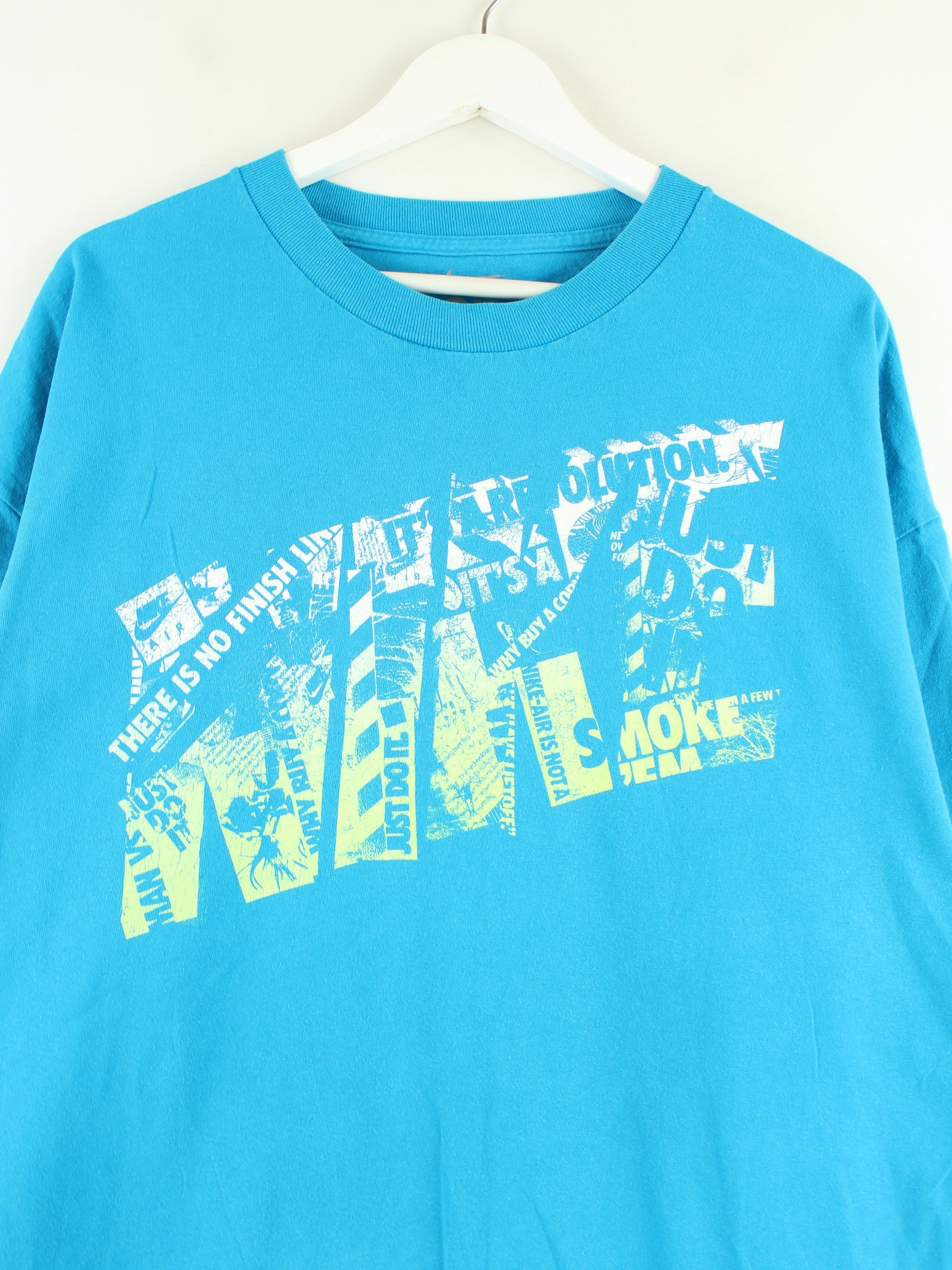 T-Shirt aus dem Hause Nike in Größe XXL. Es ist aus Baumwolle und in Türkis im Bestand. Mit schickem Print.