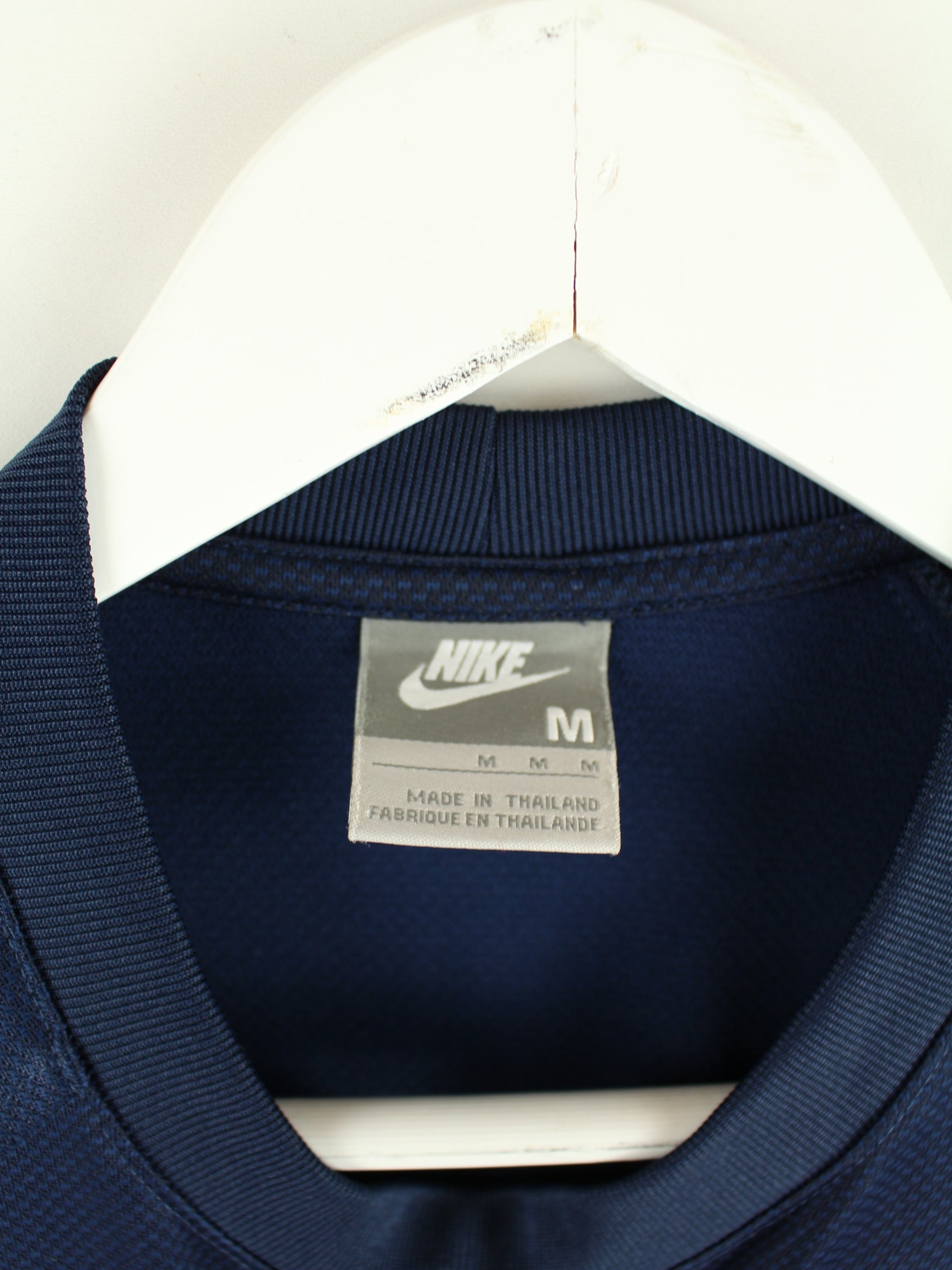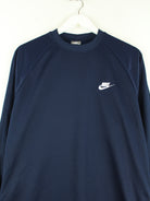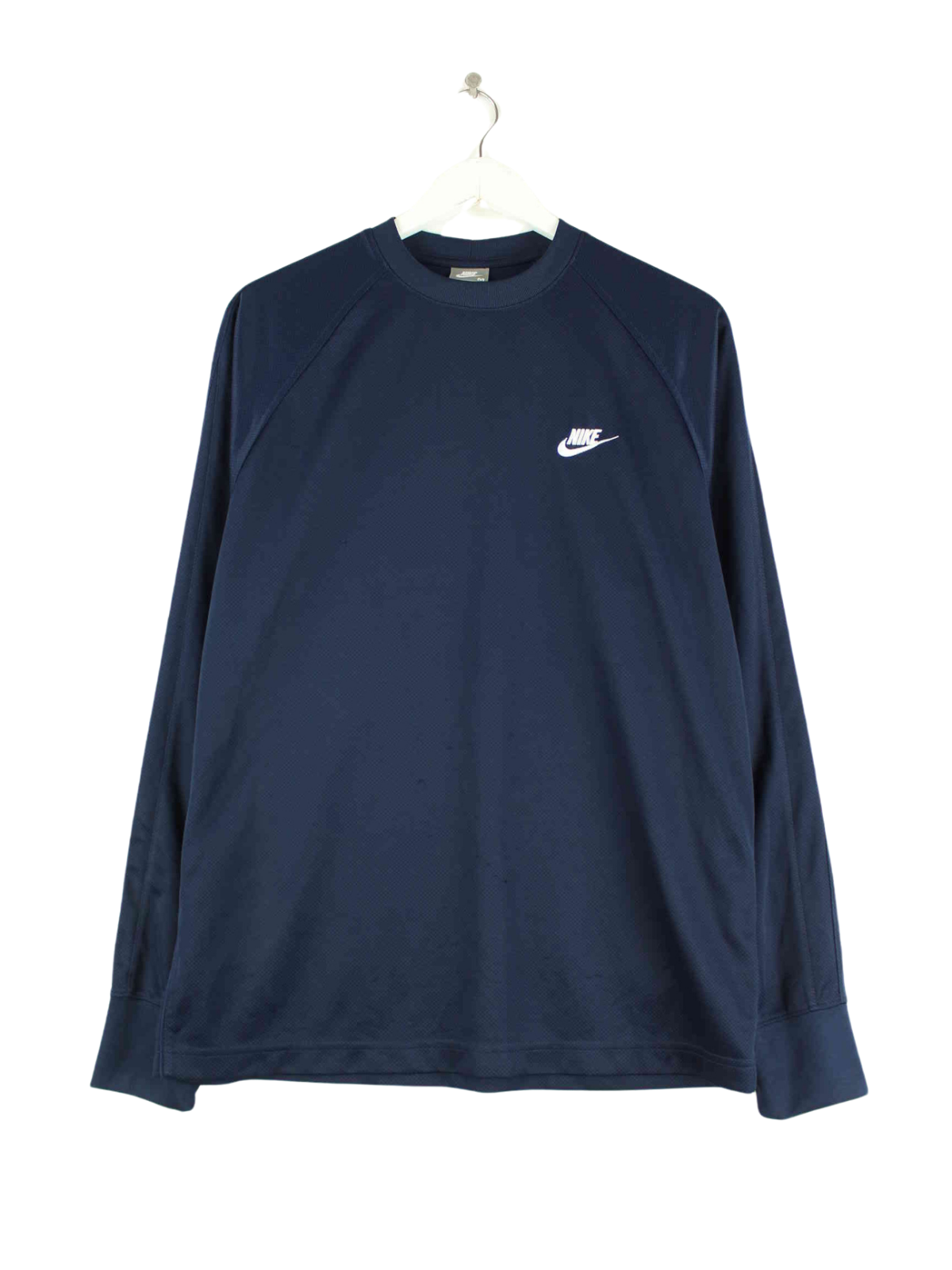 Blaues Sweatshirt vom Brand Nike aus Anfang der 2000'er in Größe M. Es ist aus Synthetik gefertigt und in gutem Zustand bei uns zu bekommen.