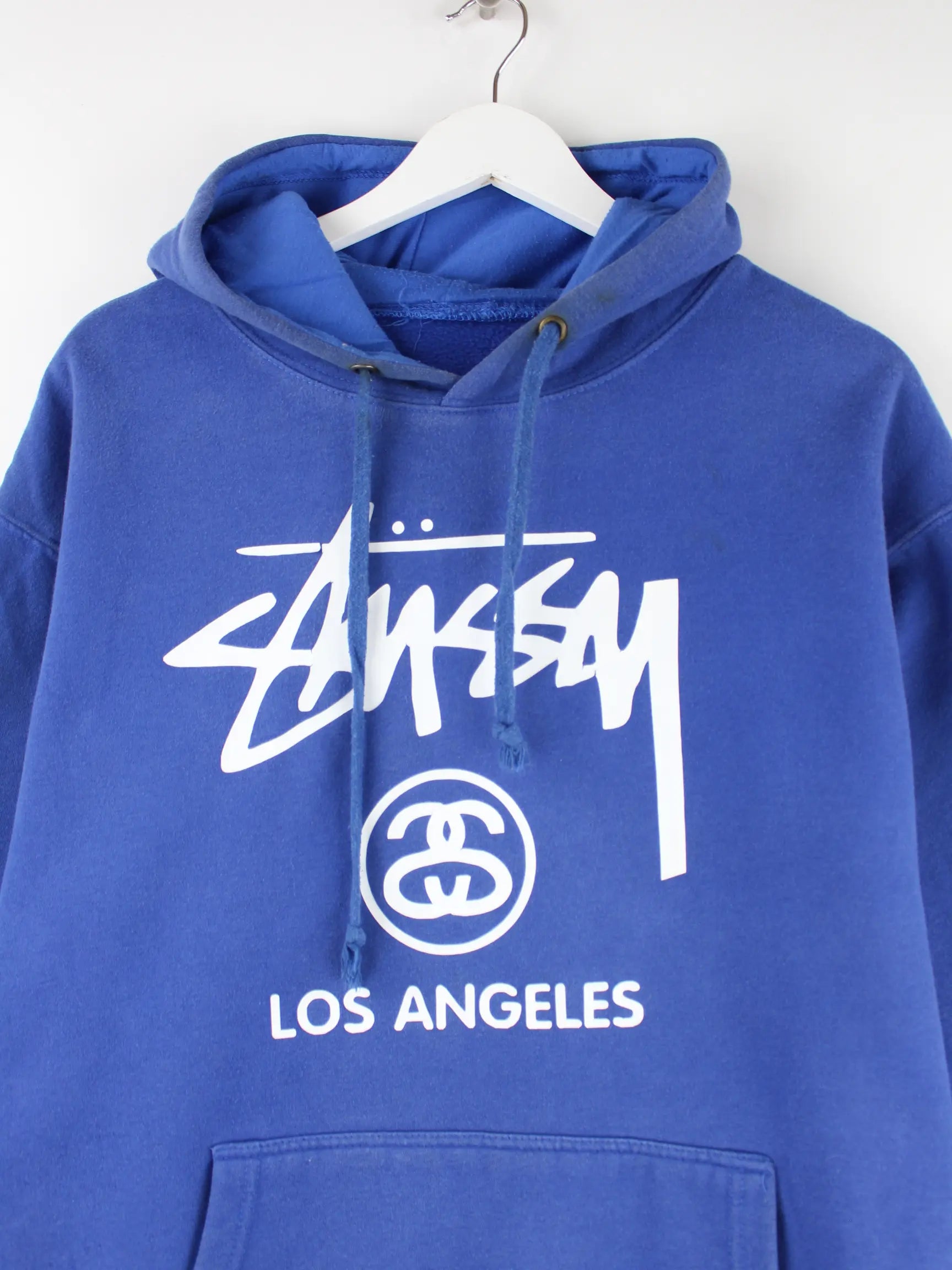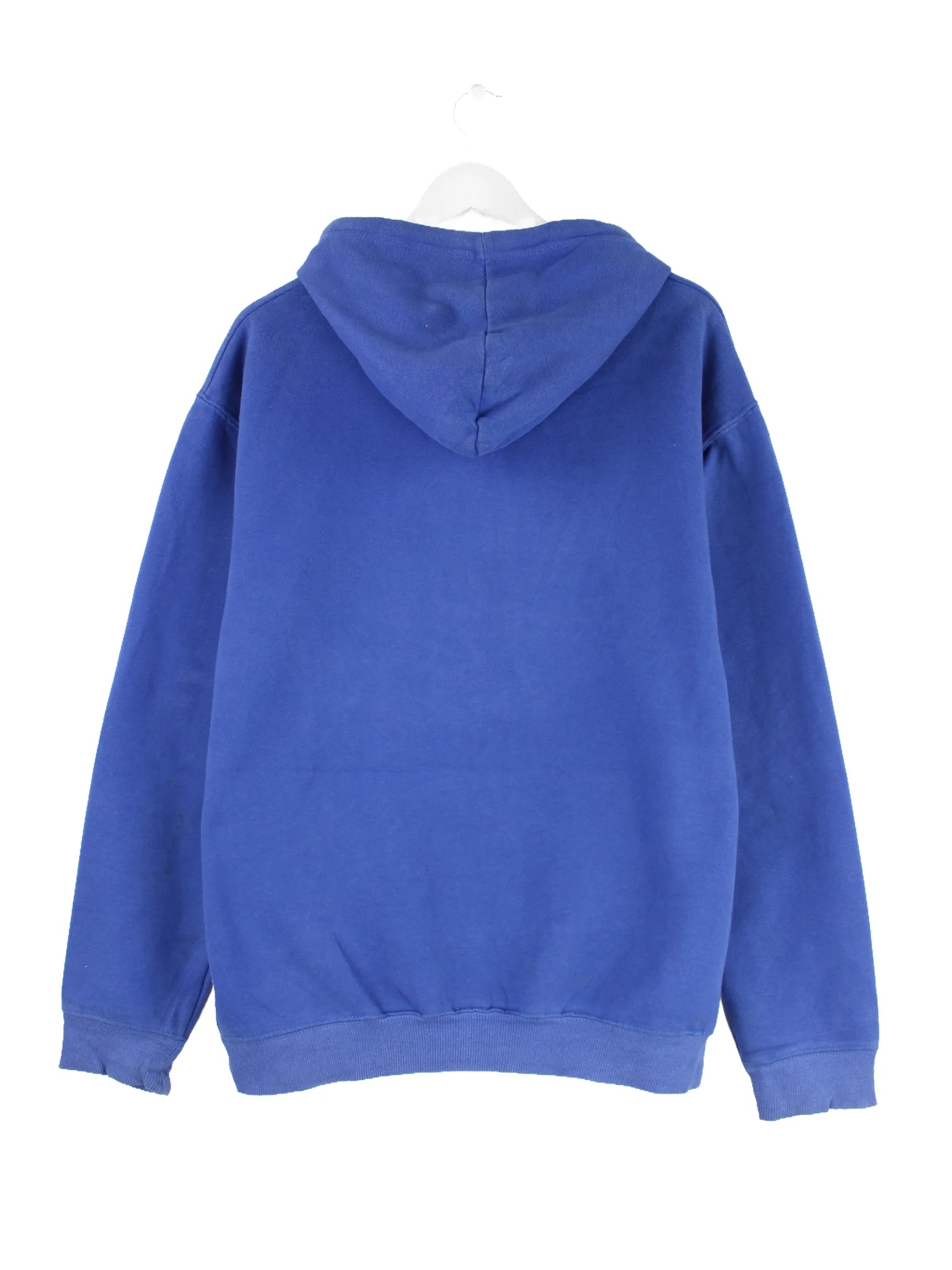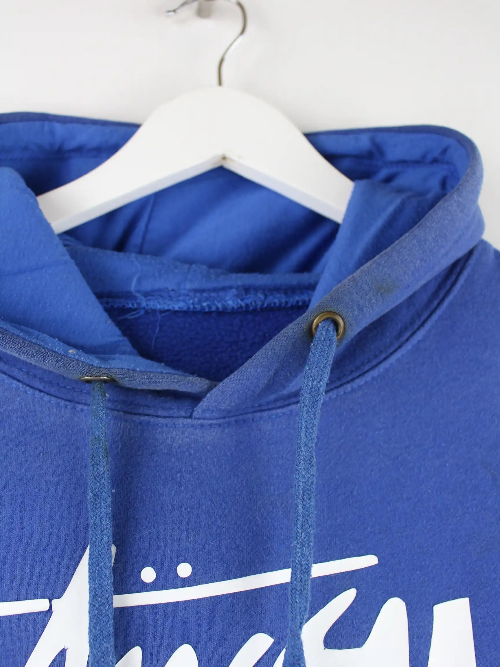 Hoodie des Labels Stussy in Größe L. Er ist aus einer Baumwollmischung gemacht und in Blau bei uns zu bekommen. Mit seltenem Print.
