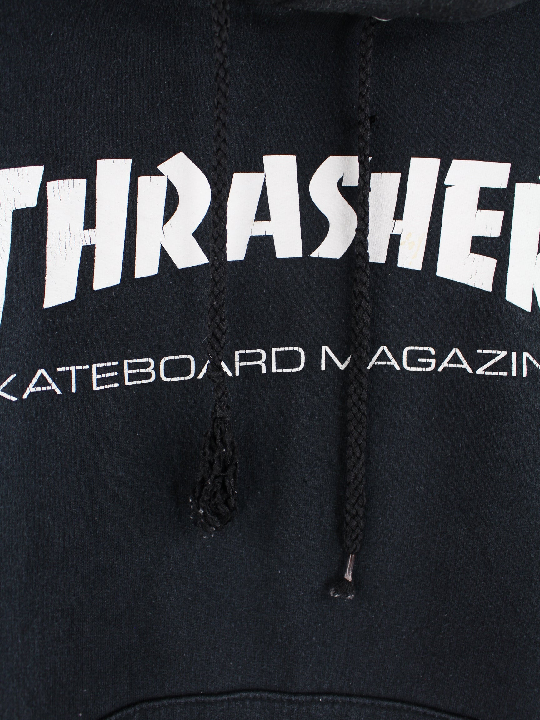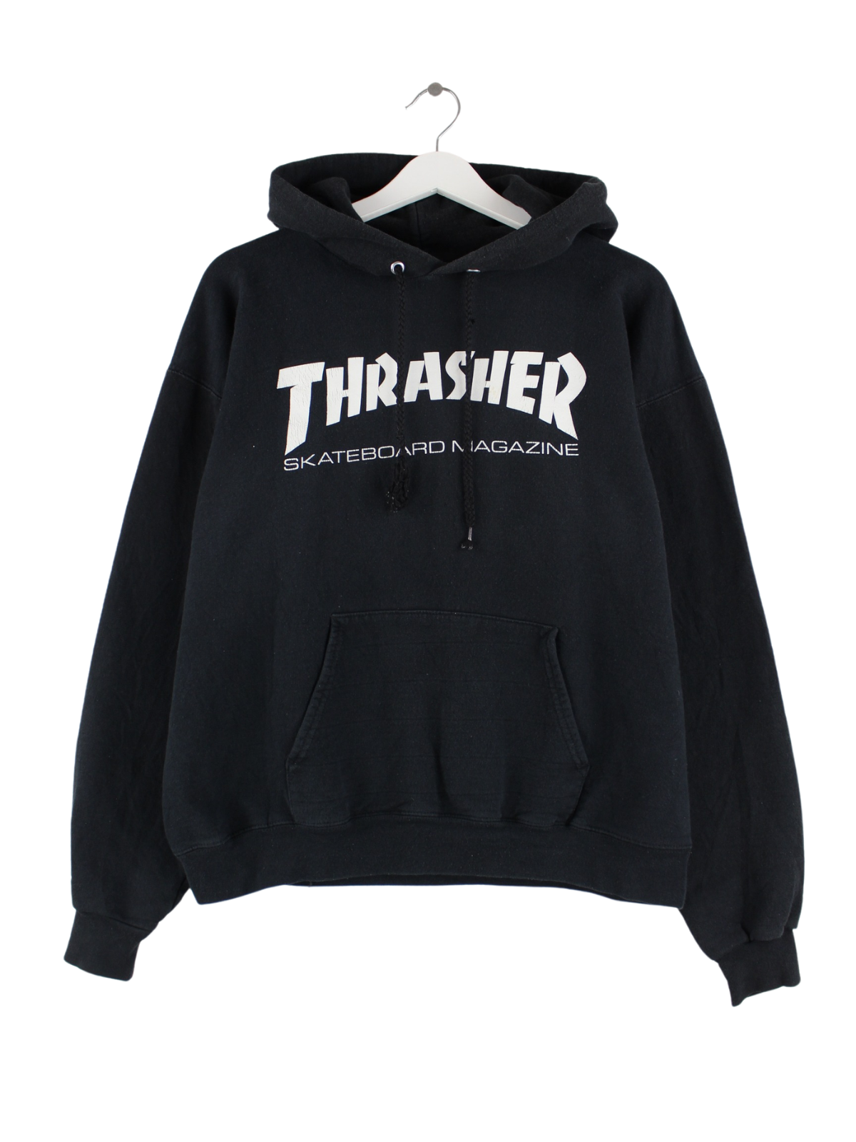Schwarzer Hoodie vom Label Thrasher in Größe XS. Er ist aus einer Baumwollmischung und in gutem Zustand zu bekommen. Mit chiquem Print.