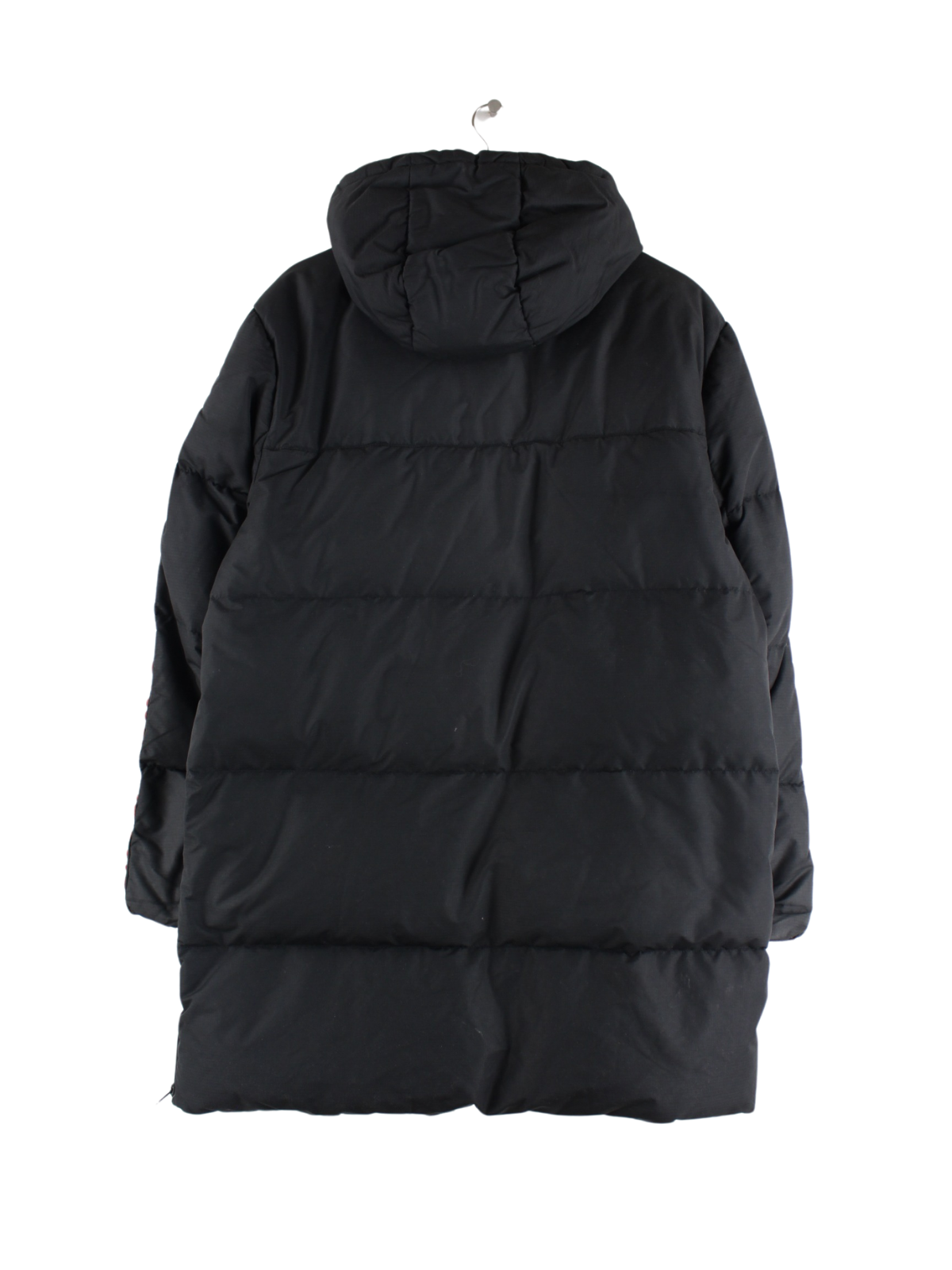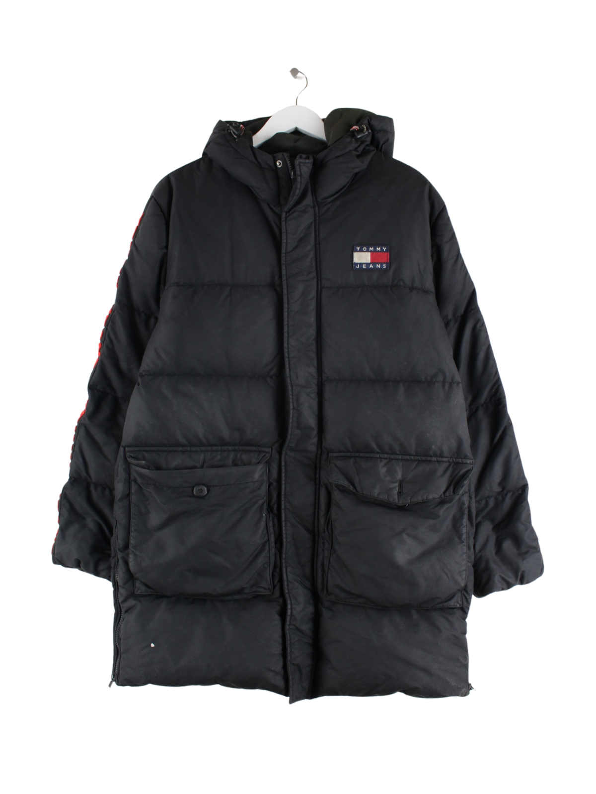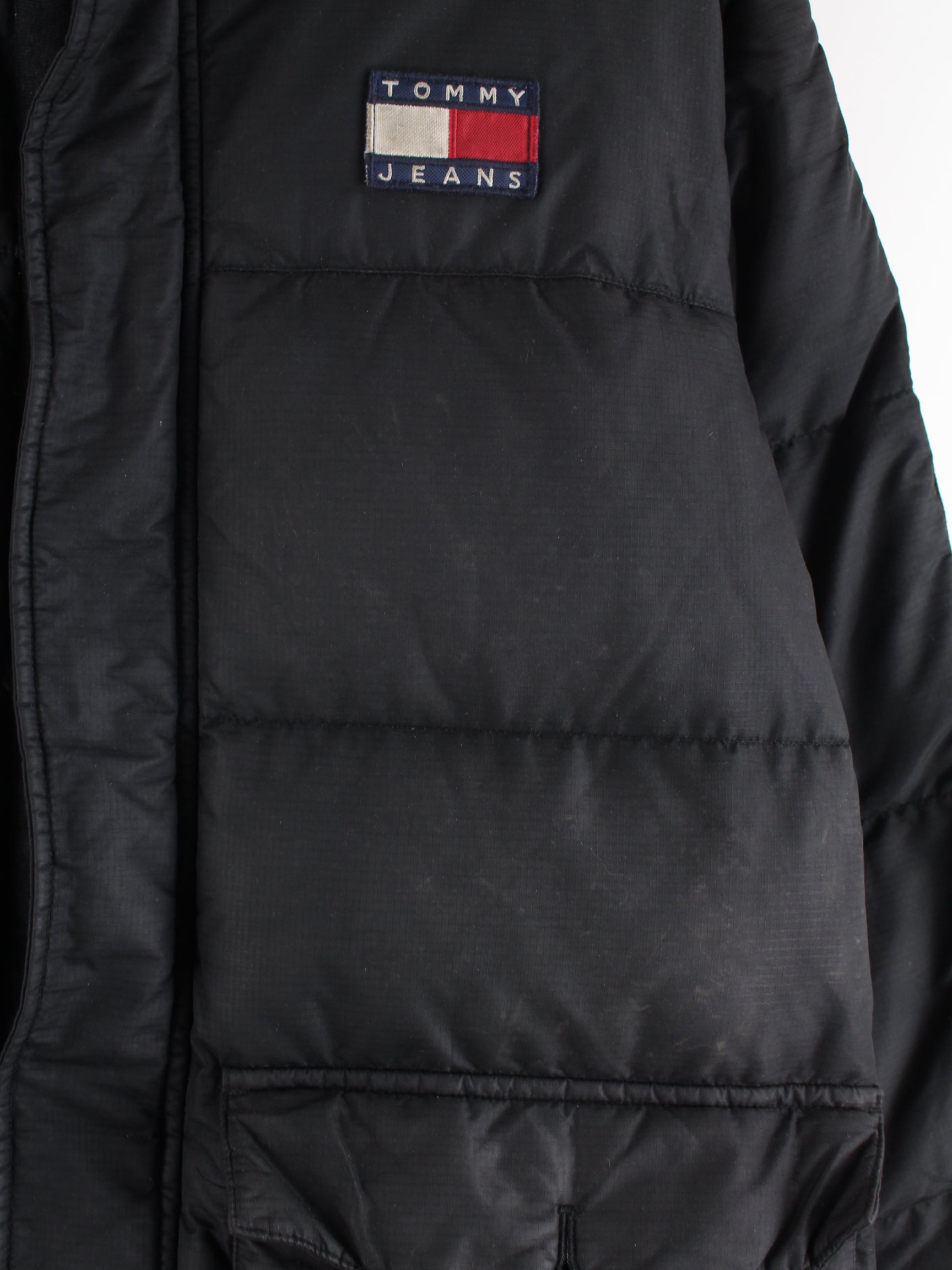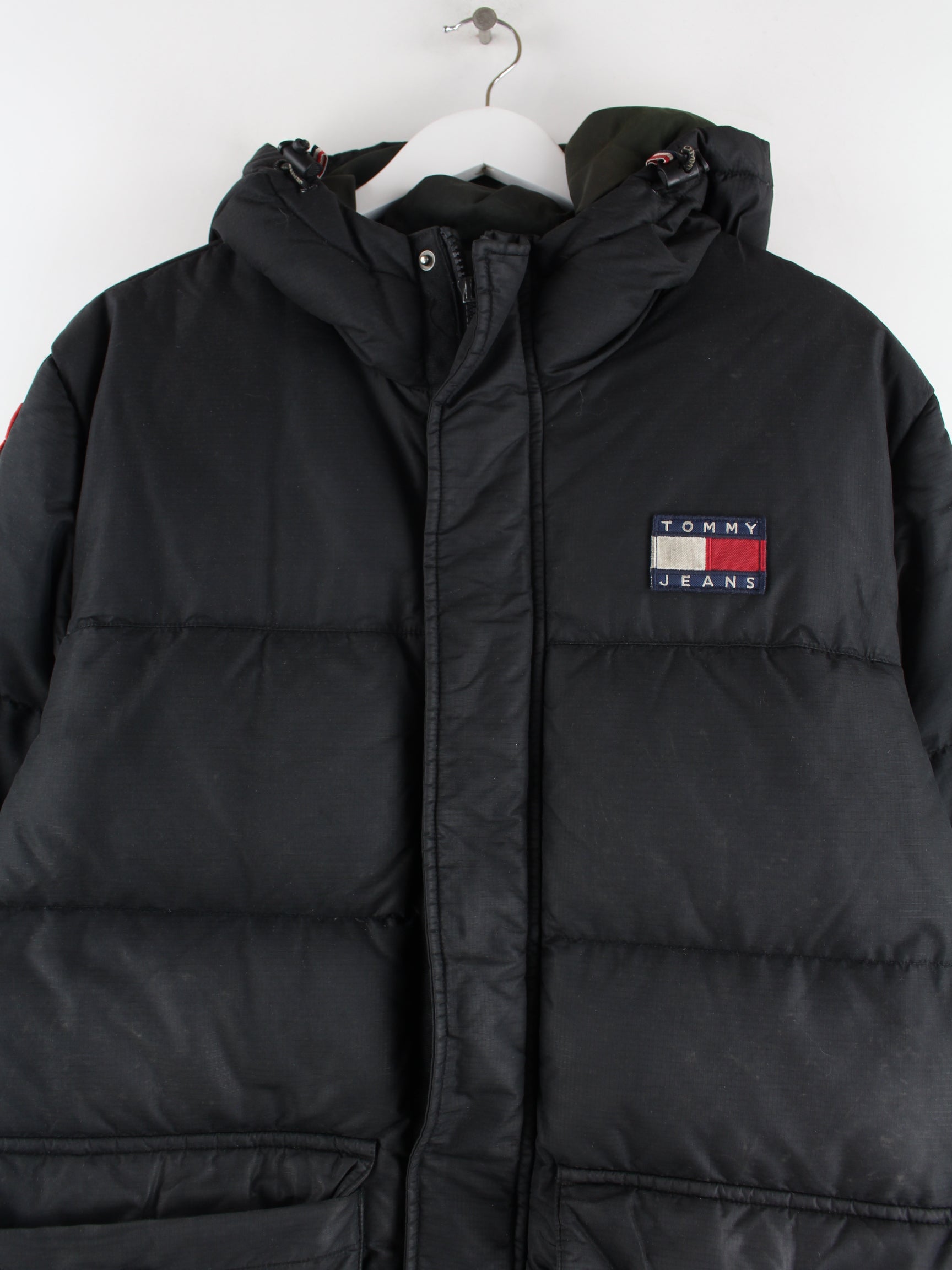 Schwarze Jacke mit gesticktem Logo vom Brand Tommy Hilfiger in Größe M. Sie ist aus Synthetik angefertigt. Den Zustand würden wir als 'In Ordnung' bezeichnen (vergl. Bilder).