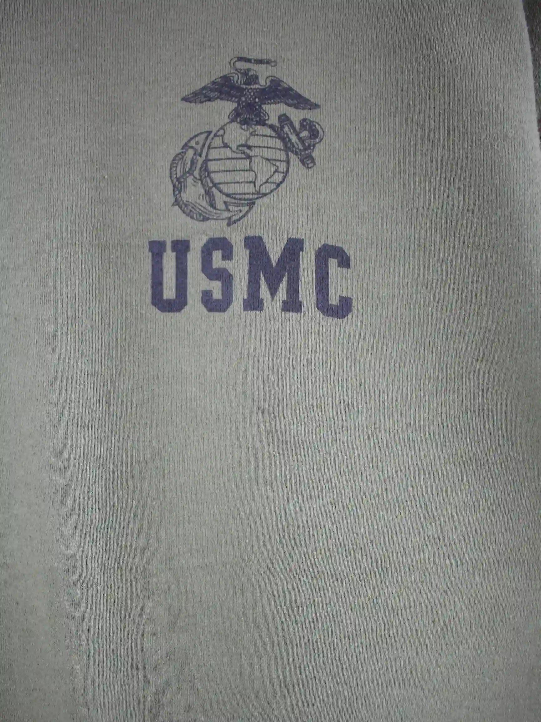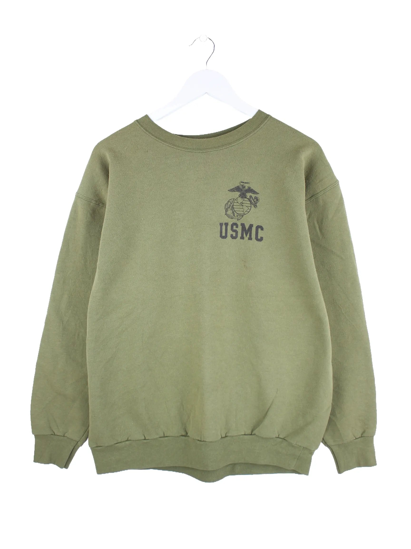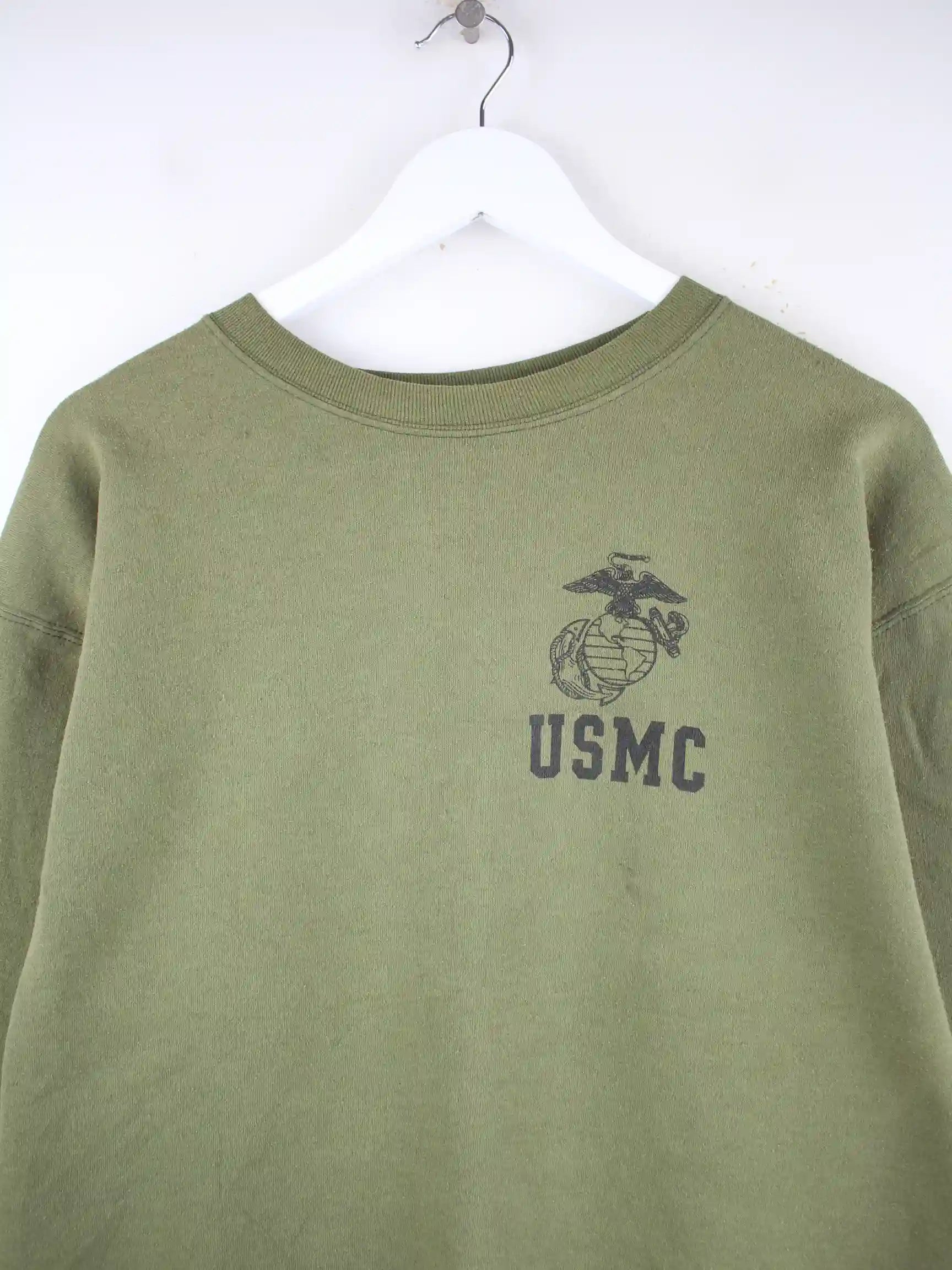 Vintage Sweater in Größe L. Er ist aus einer Baumwollmischung und in Grün vorrätig. Mit schönem USMC Print.