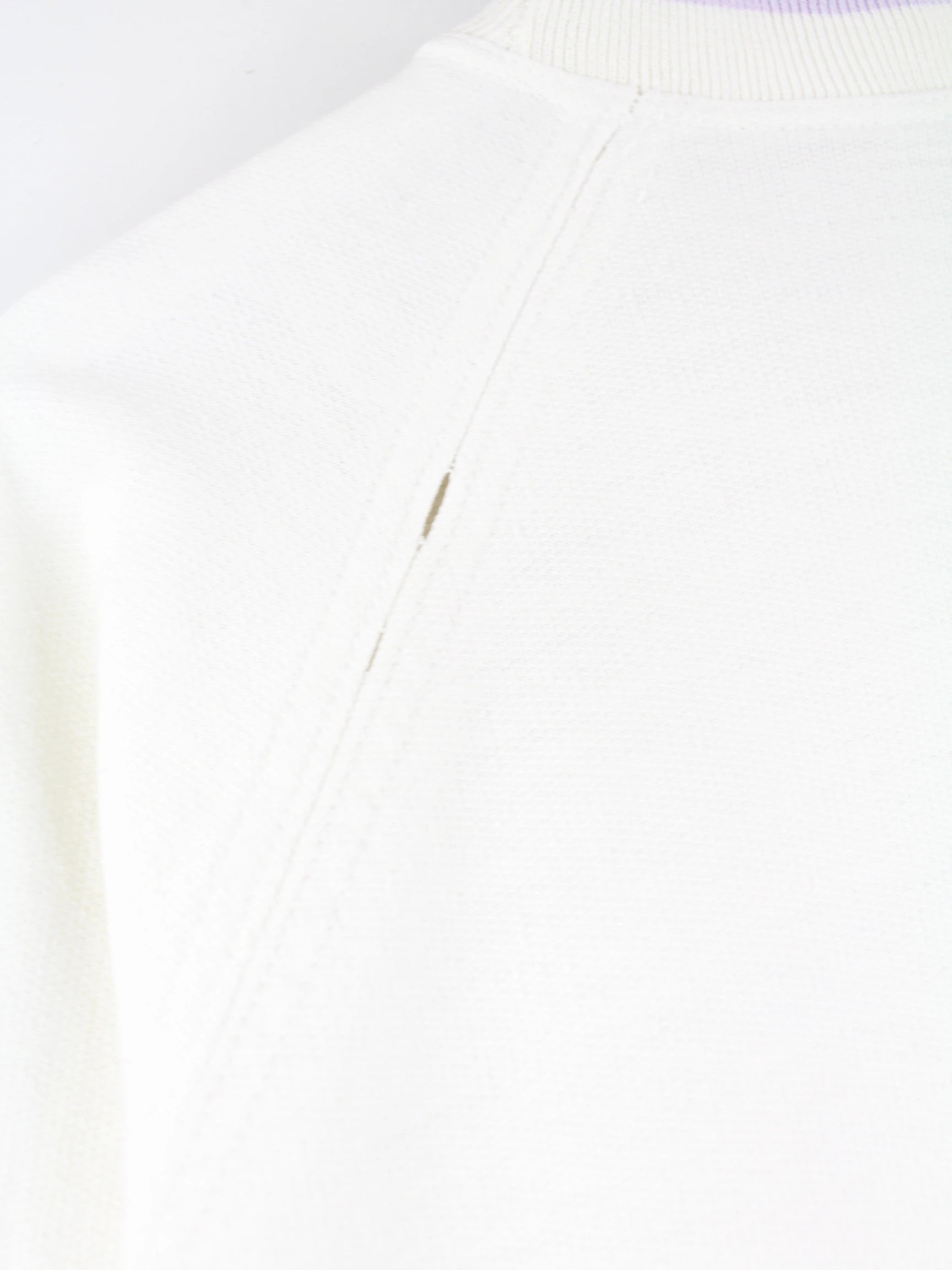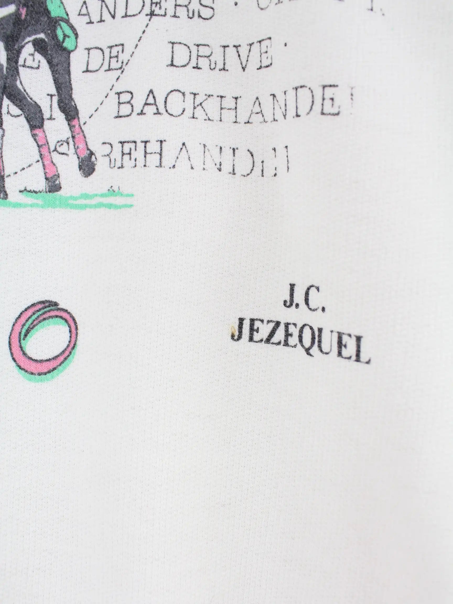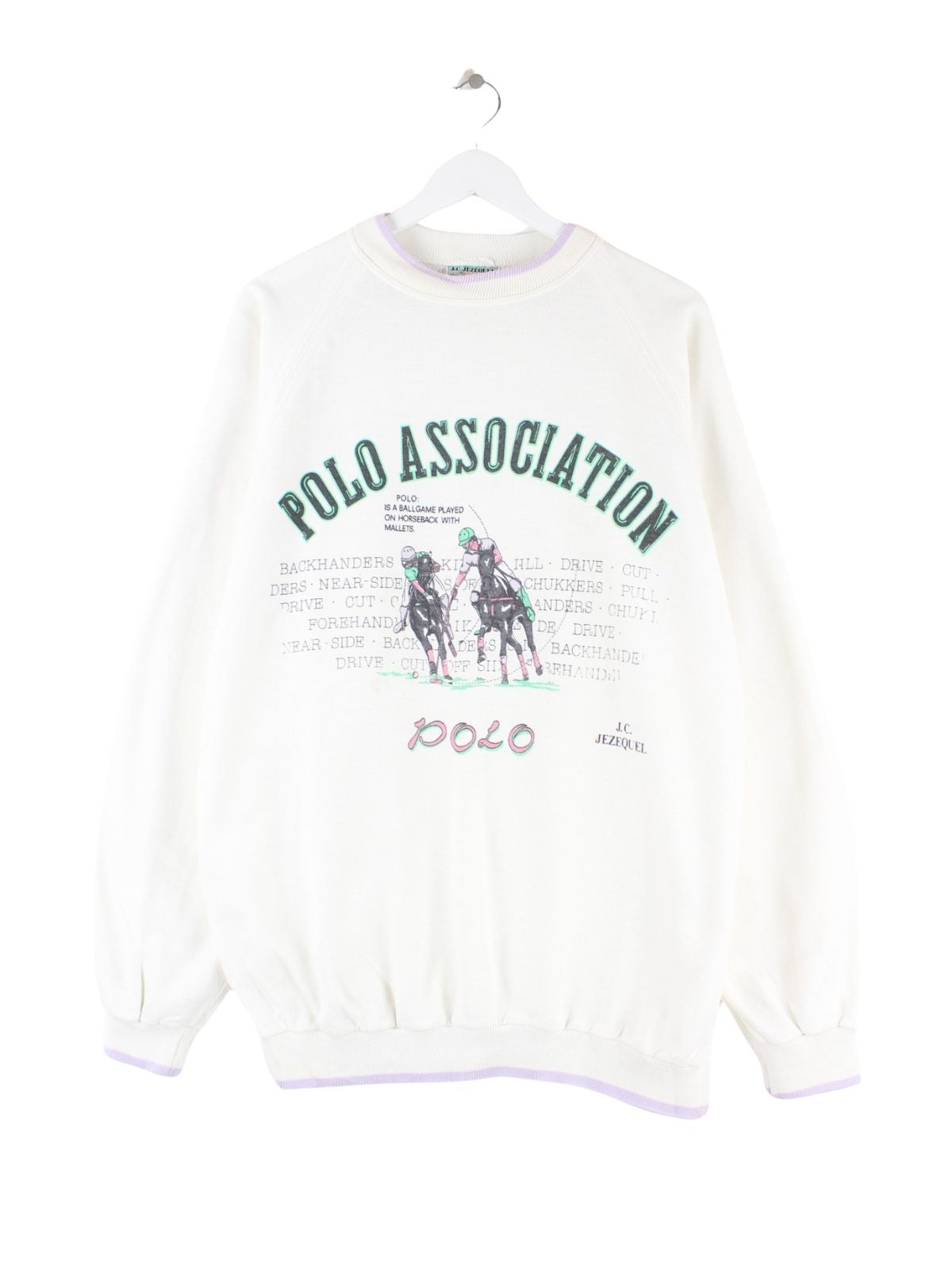 Vintage Sweater in Größe XL aus den 80'ern. Er ist aus einer Baumwollmischung hergestellt und in Weiß vorrätig. Mit schickem Polo Print.