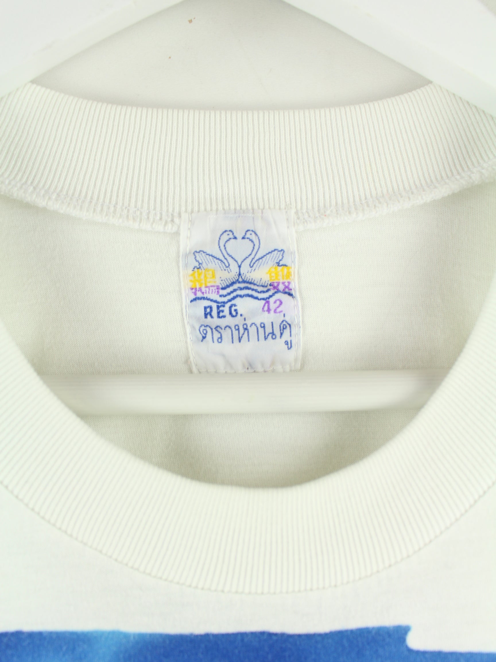 Weißes Vintage T-Shirt aus den 80'ern in Größe M. Es ist aus einer Baumwollmischung gefertigt und in gutem Zustand bei uns zu bekommen. Mit schönem Rainforest Print.