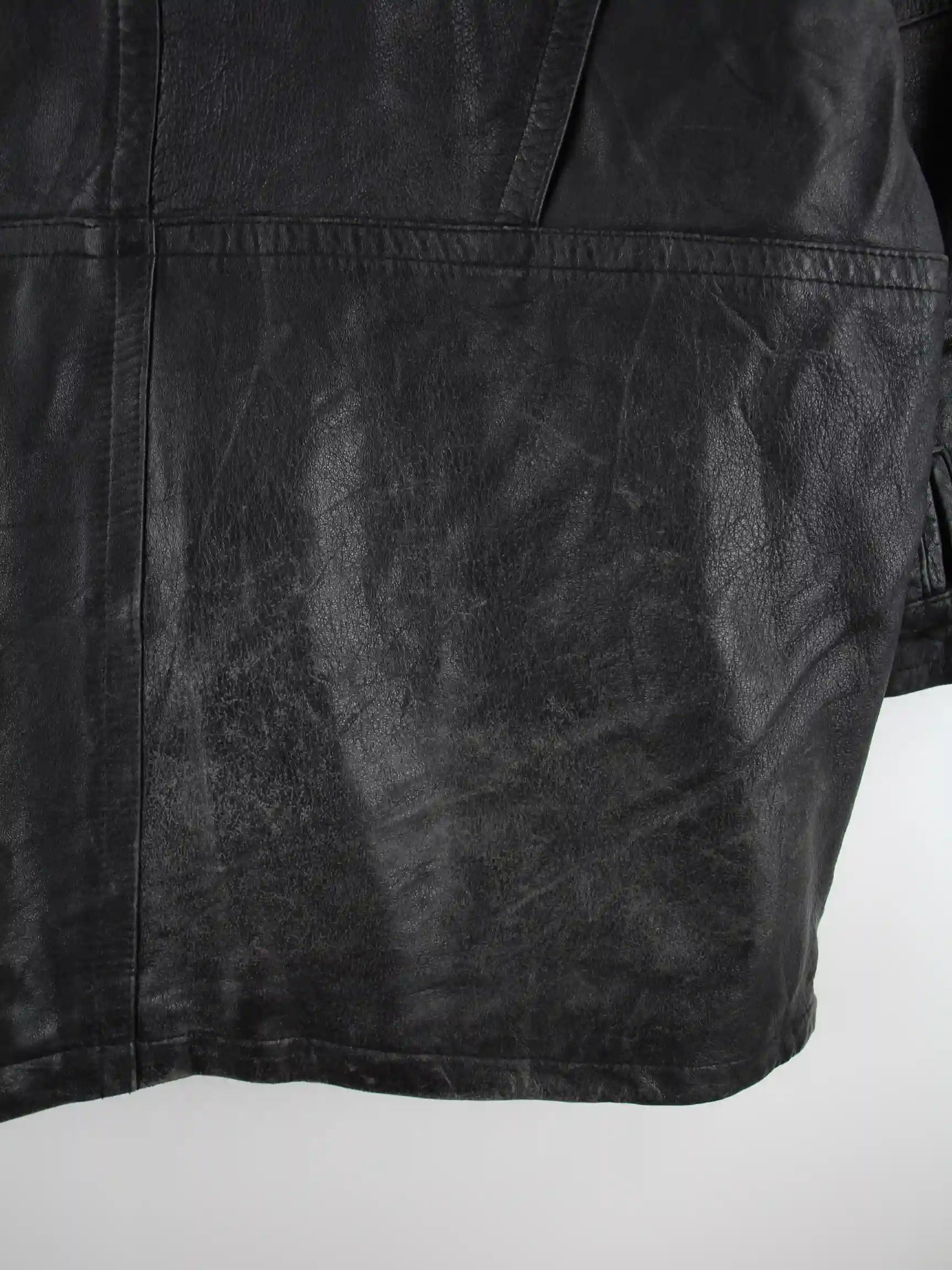 Schwarze Vintage Jacke aus den 90'ern in Größe L. Sie ist aus Leder gemacht. Den Zustand würden wir als 'In Ordnung' bezeichnen (vergl. Bilder).
