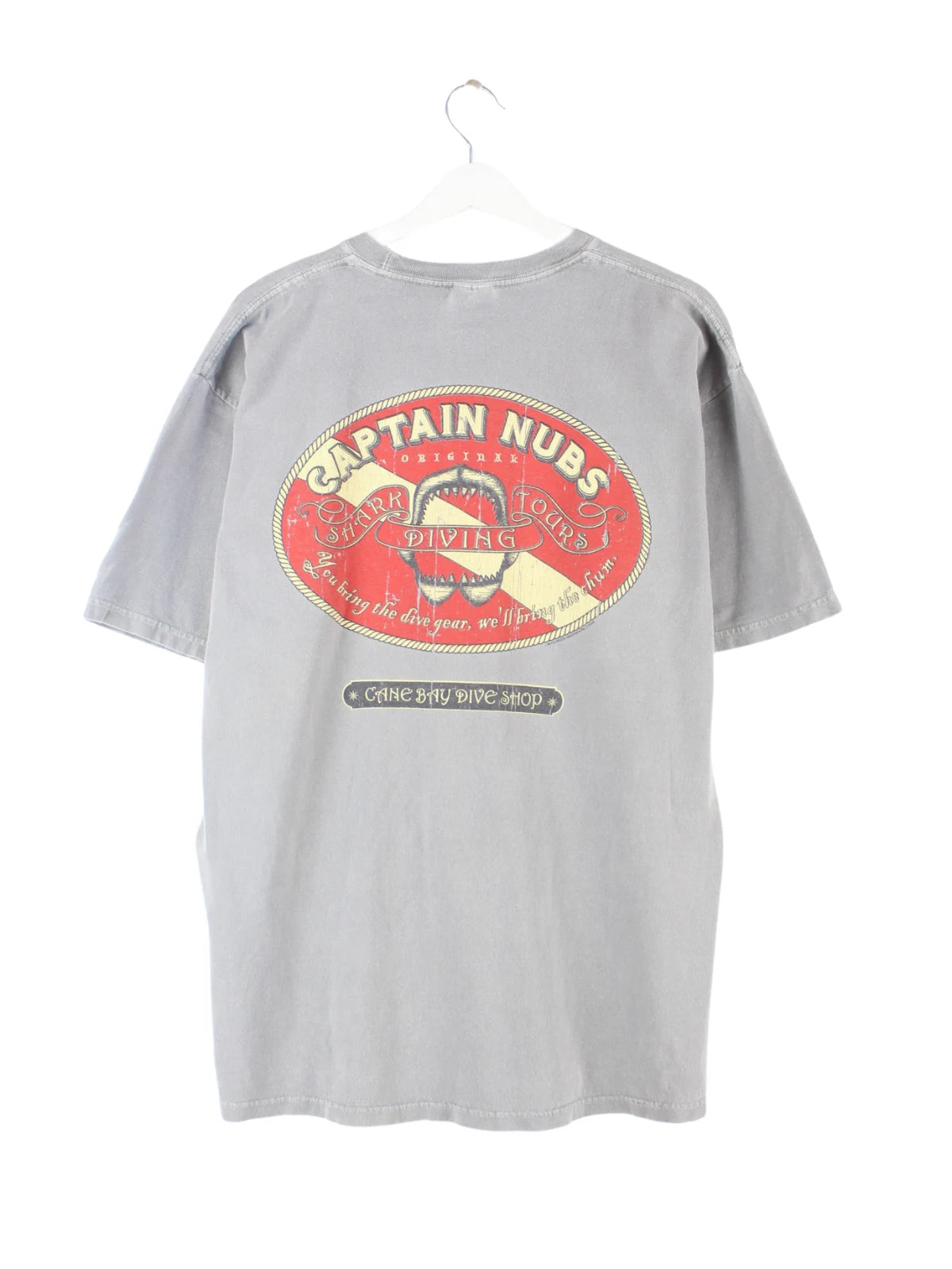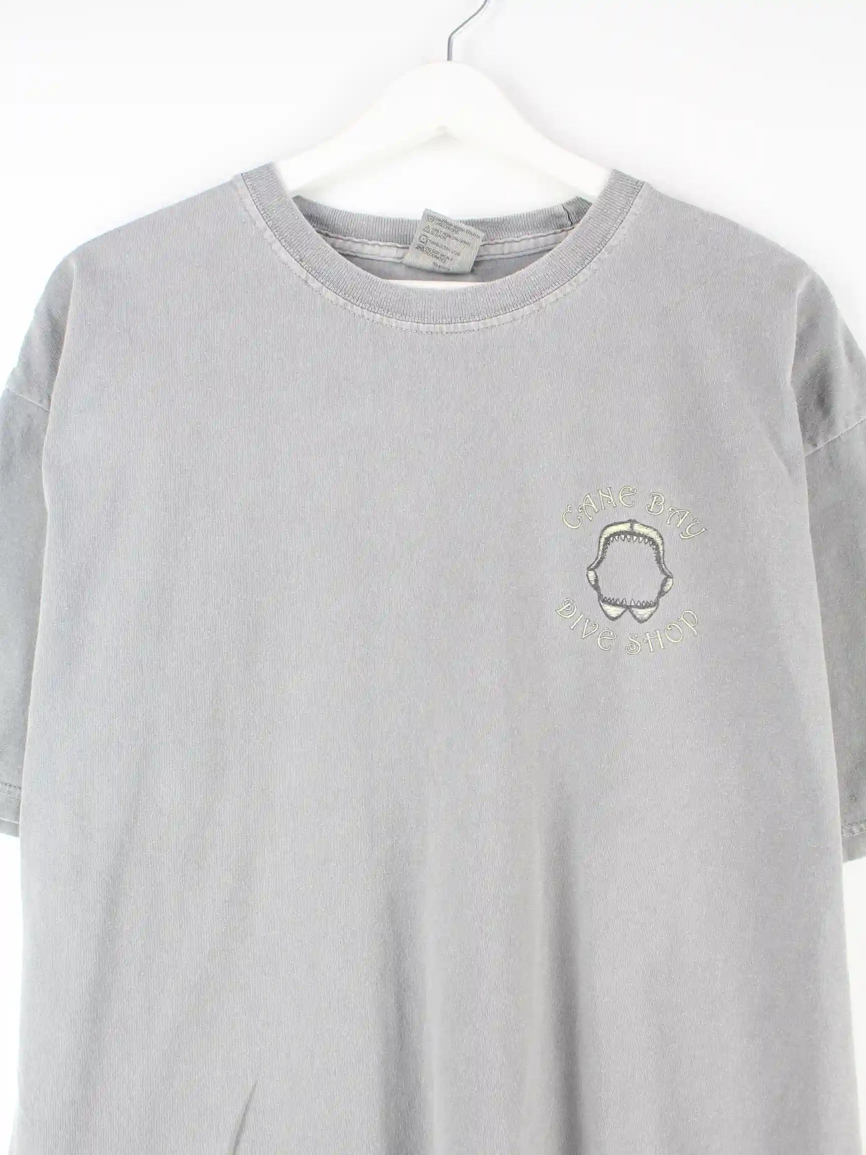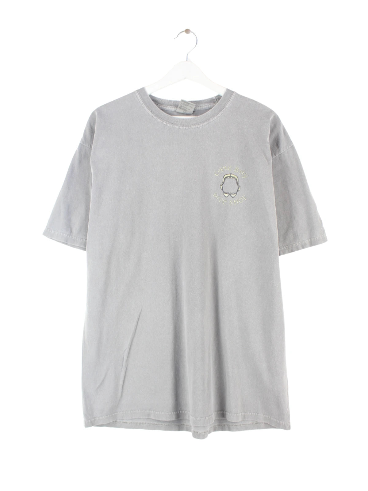 Graues Vintage T-Shirt in Größe L. Es ist aus Baumwolle gemacht und in sehr gutem Zustand lieferbar. Mit schönem Dive Print.
