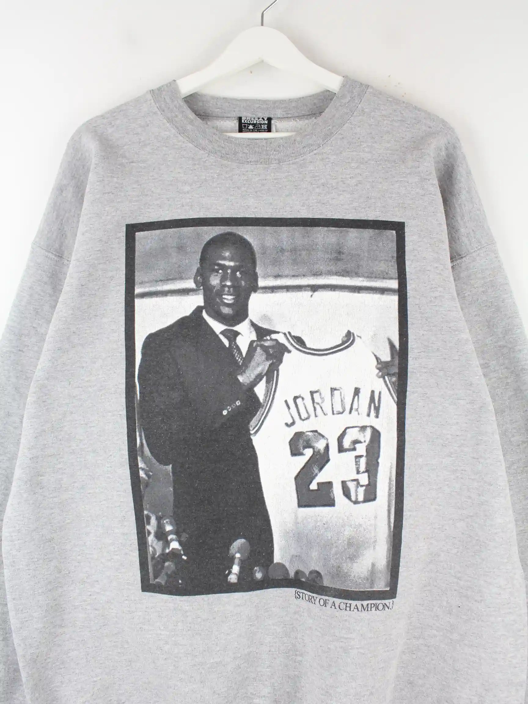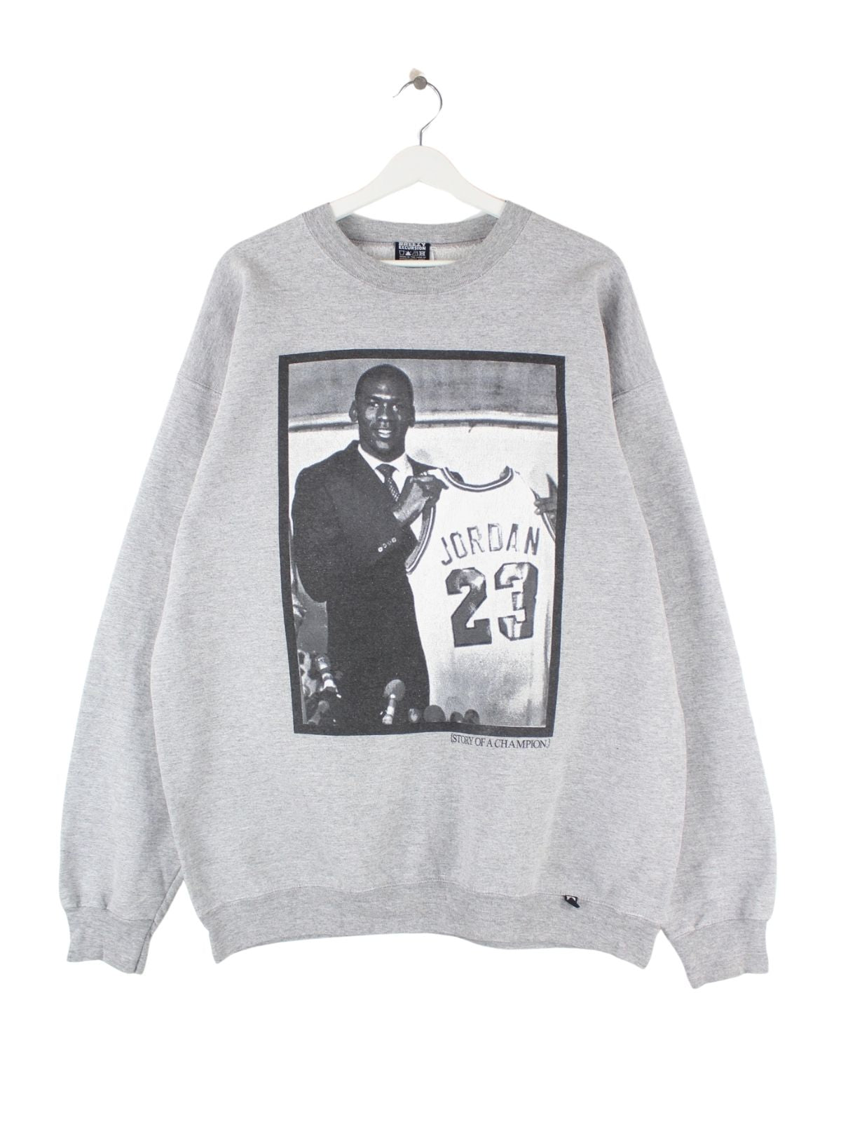 Grauer Vintage Sweater in Größe L. Er ist aus einer Baumwollmischung angefertigt und in sehr gutem Zustand im Angebot. Mit chiquem Jordan Print.