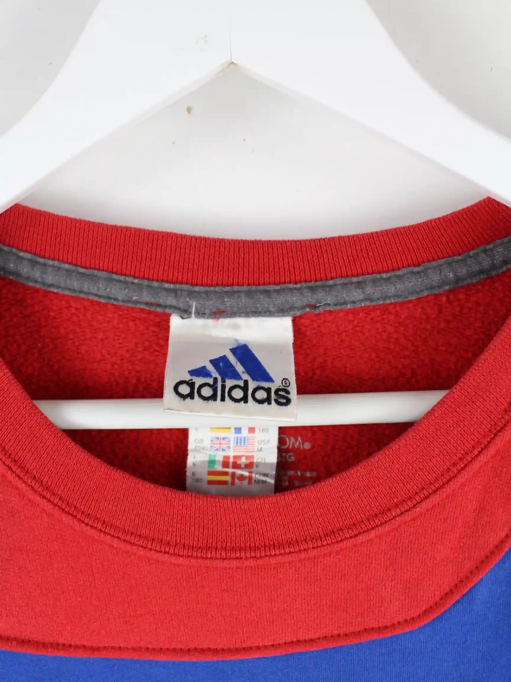 Sweater vom Brand Adidas mit Stick in Größe XXL aus den 90'ern. Er ist aus einer Baumwollmischung und in Rot bei uns vorrätig.