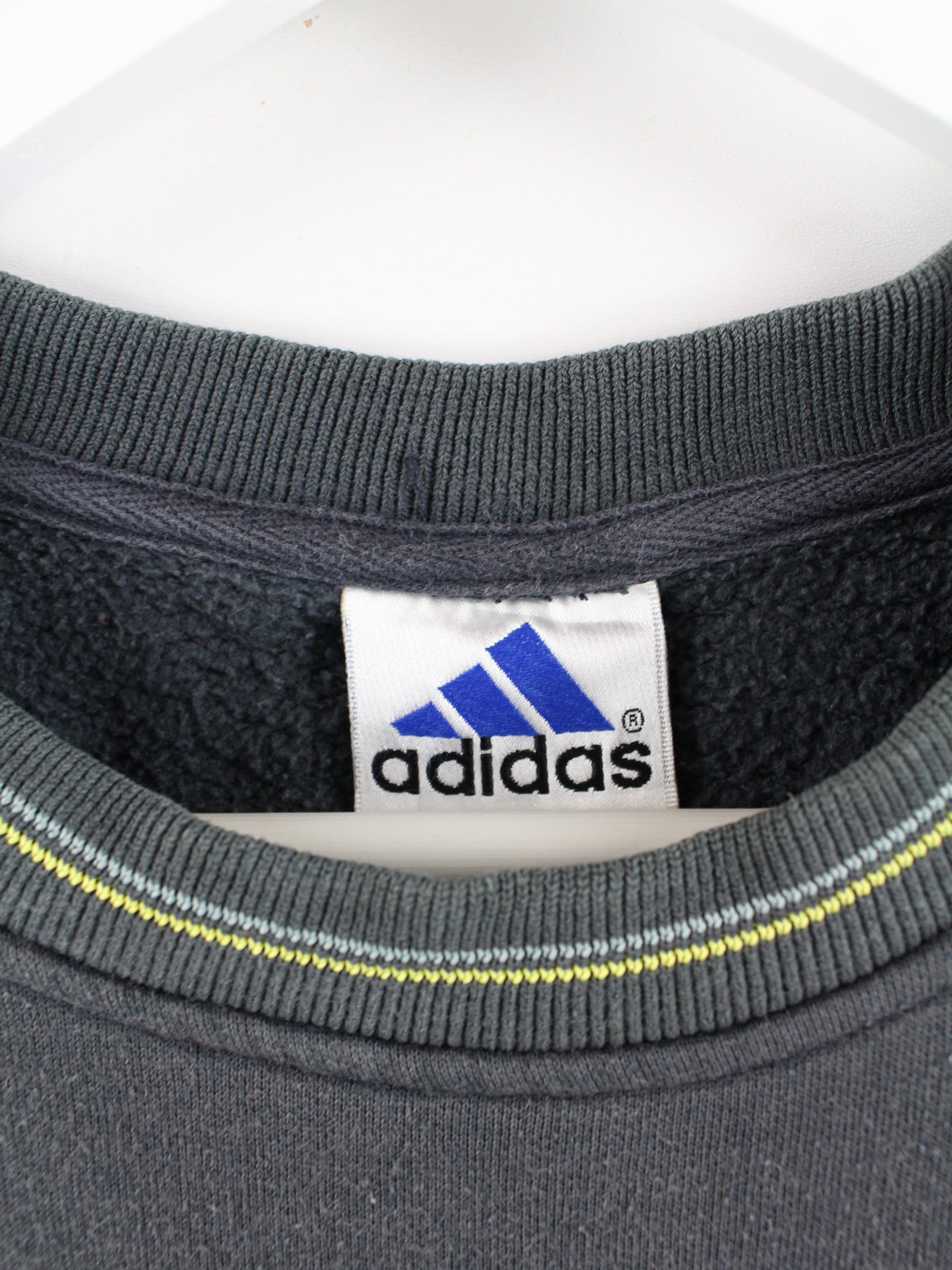 Grauer Sweater der Marke Adidas aus den 90'ern in Größe L. Er ist aus einer Baumwollmischung hergestellt und in sehr gutem Zustand bei uns zu bekommen.