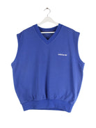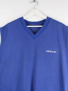 Blauer Pullunder der Brand Adidas aus den 90'ern in Größe L. Er ist aus einer Baumwollmischung produziert und in sehr gutem Zustand bei uns zu bekommen.