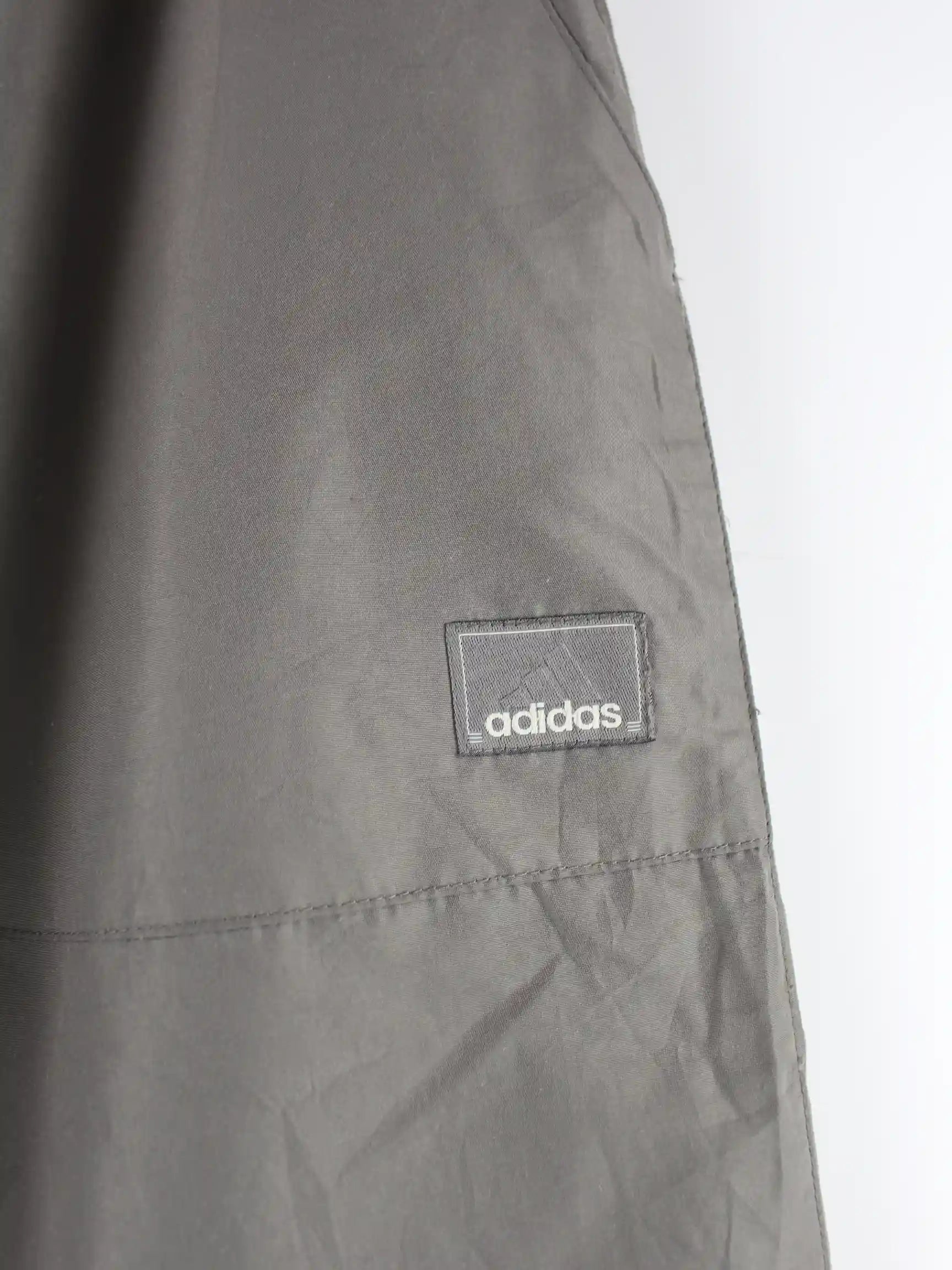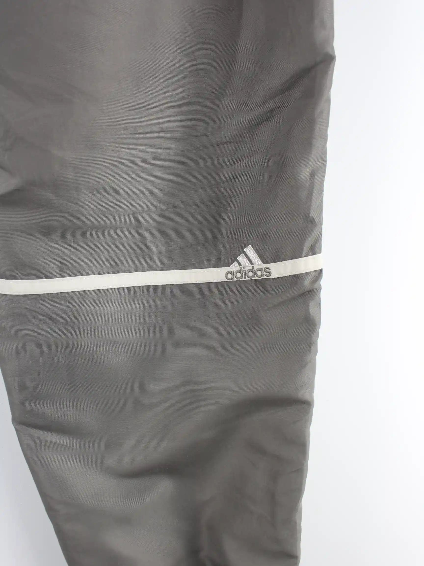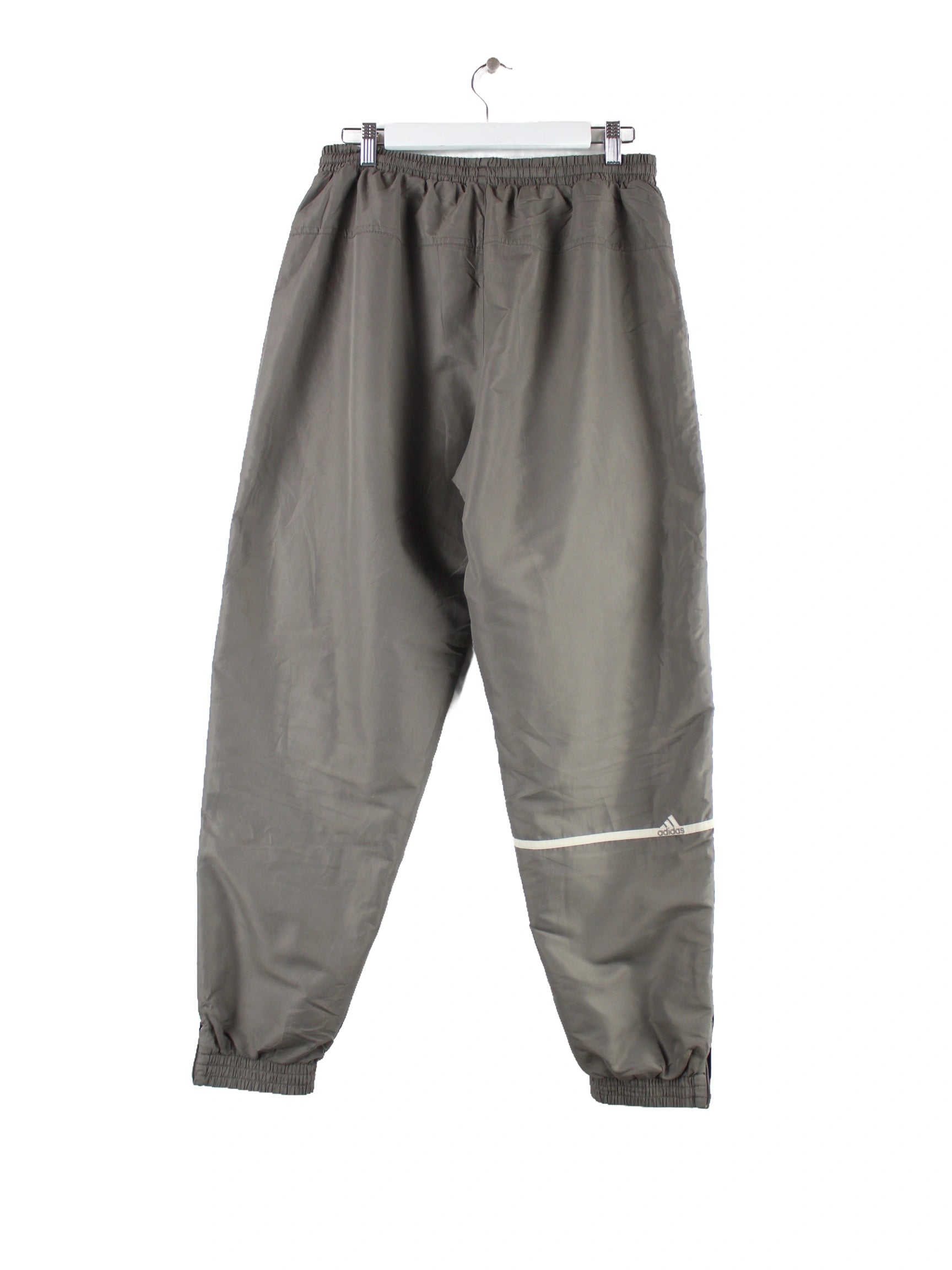 Graue Track Pants vom Brand Adidas aus den 90'ern in Größe XL. Sie sind aus Synthetik hergestellt und in gutem Zustand bei uns zu bekommen.