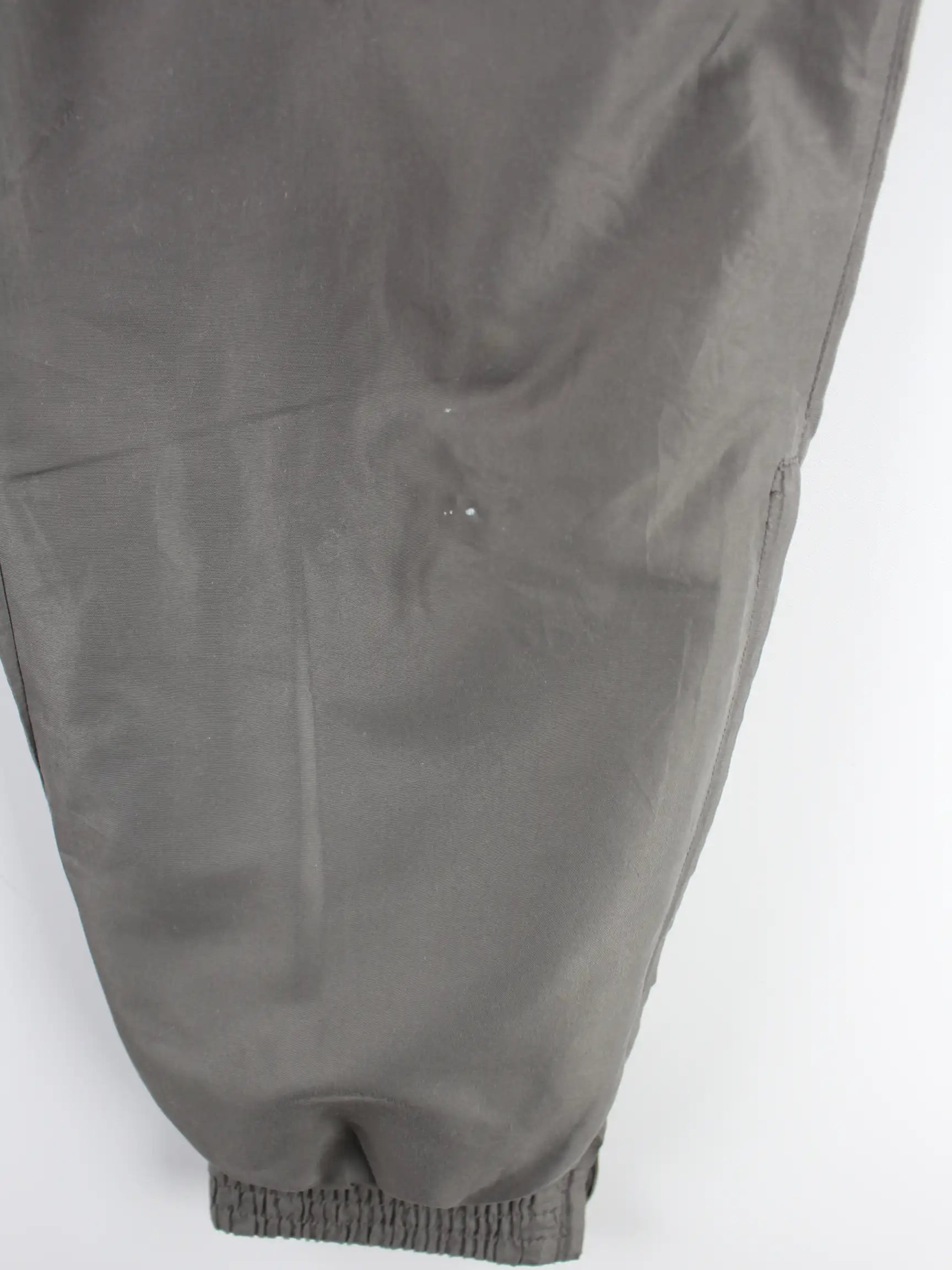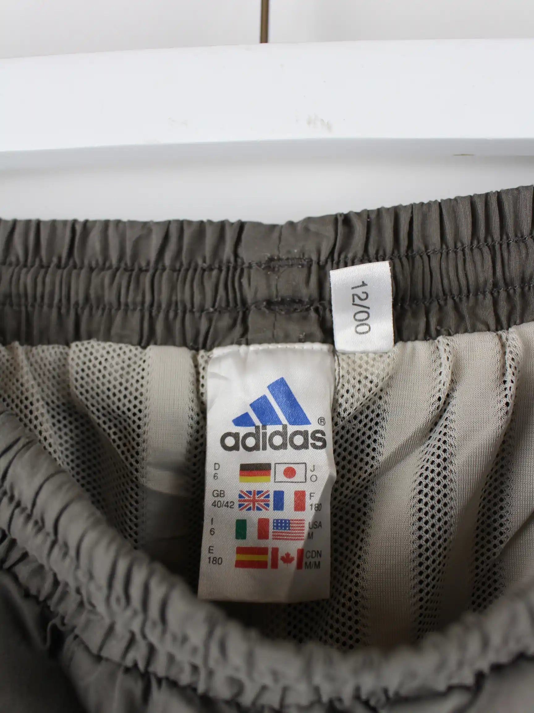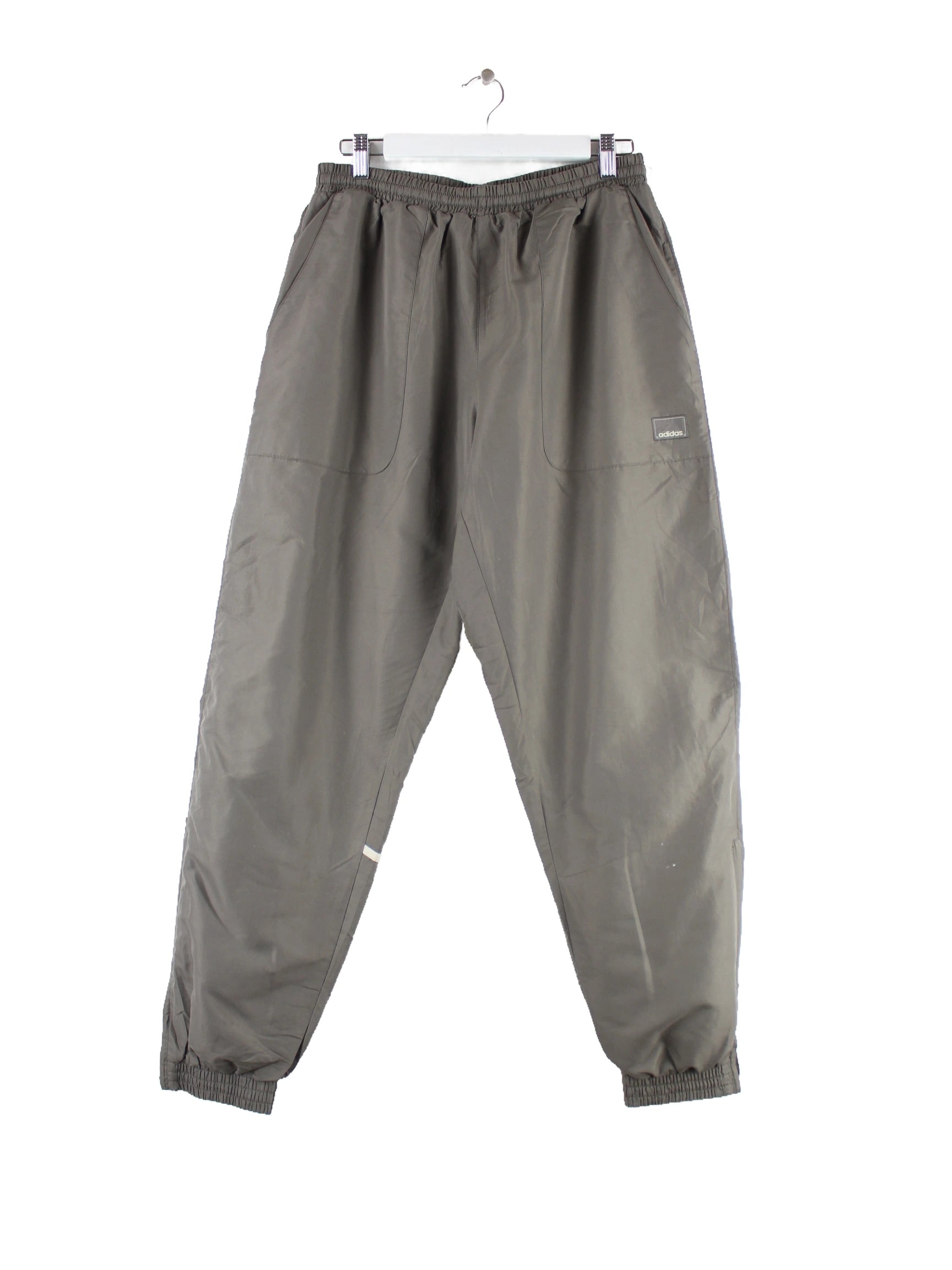 Graue Track Pants vom Brand Adidas aus den 90'ern in Größe XL. Sie sind aus Synthetik hergestellt und in gutem Zustand bei uns zu bekommen.