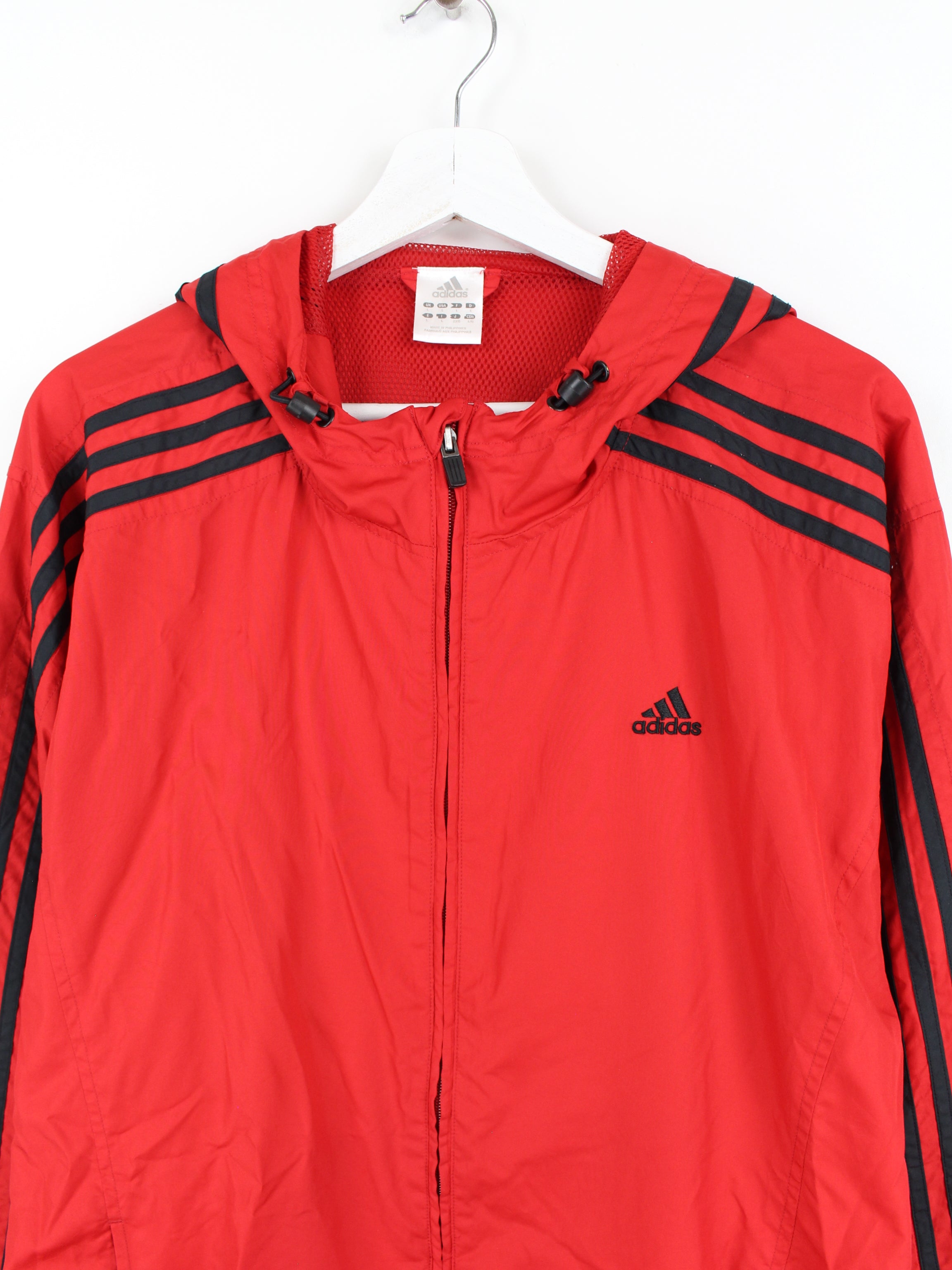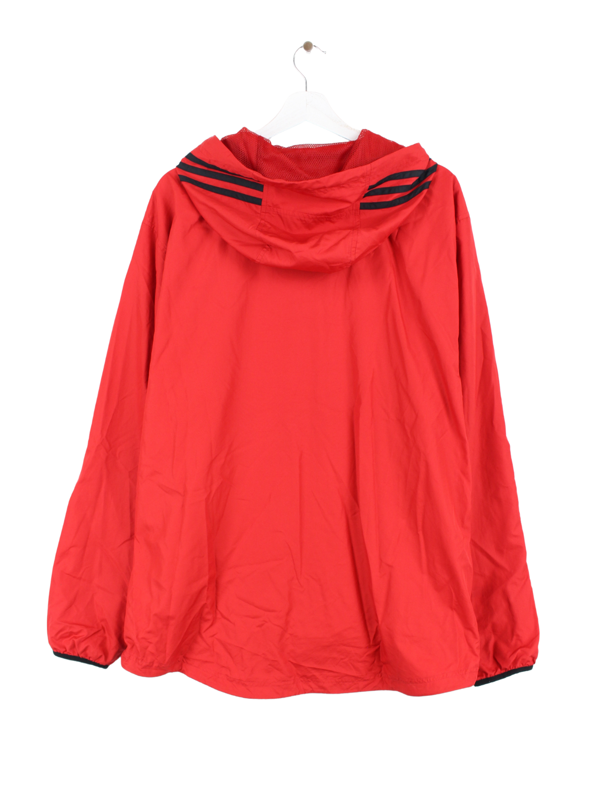 Rote Adidas Jacke mit schwarzen Streifen auf den Ärmeln.