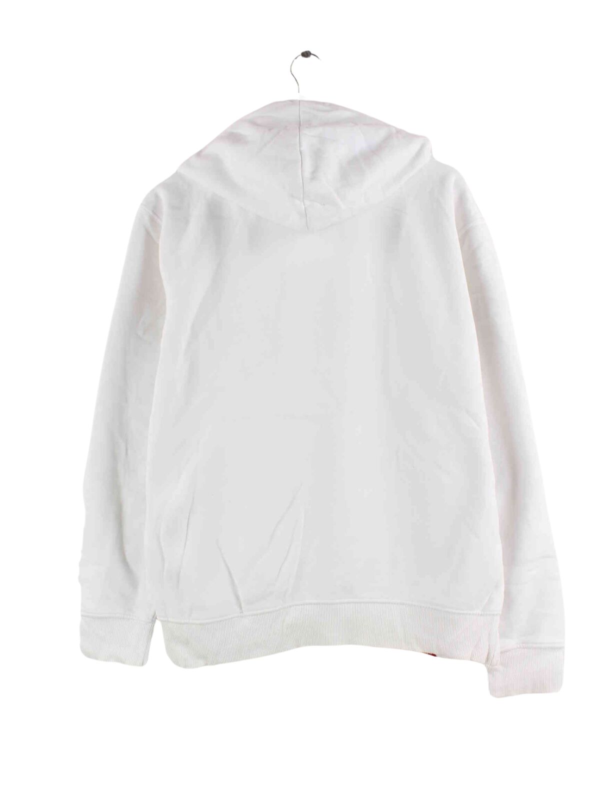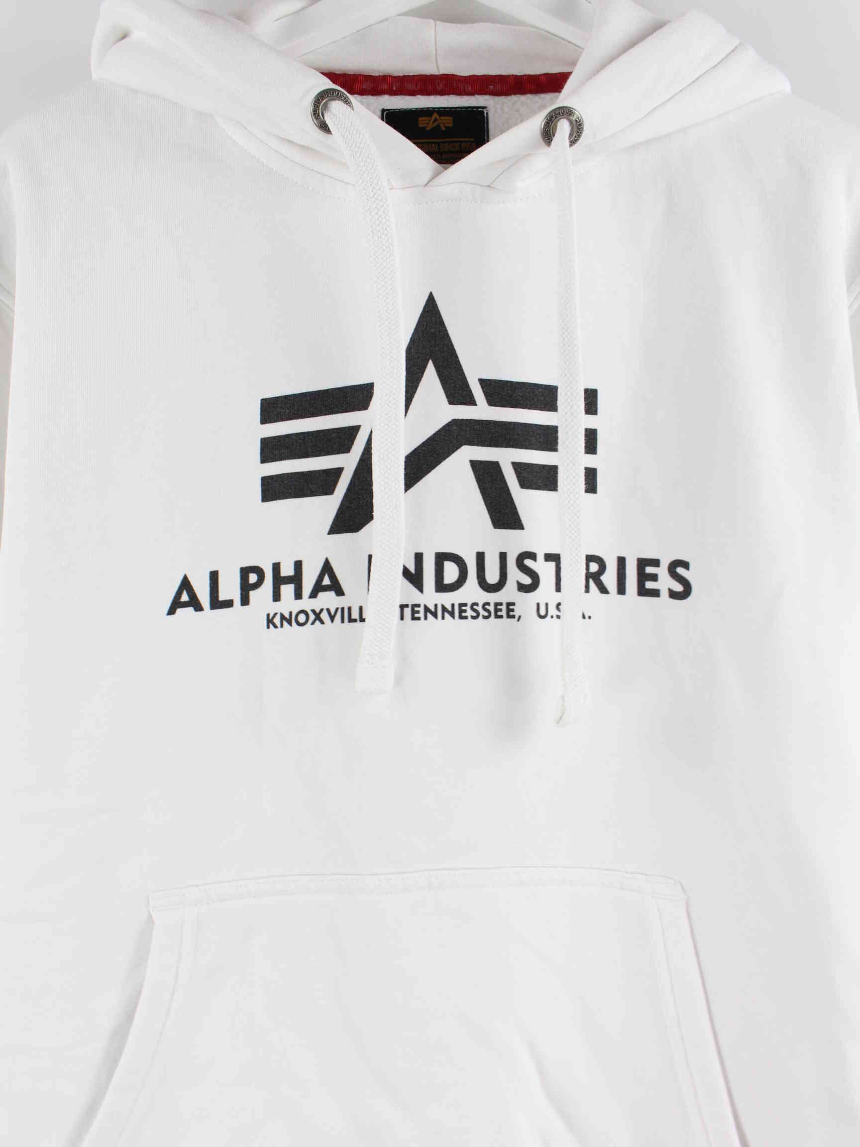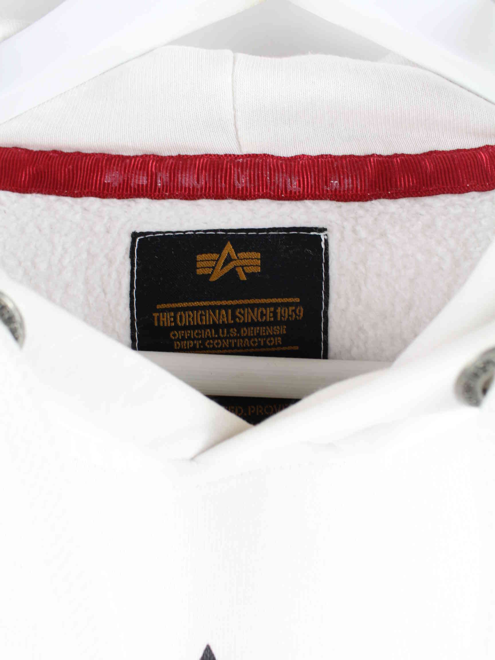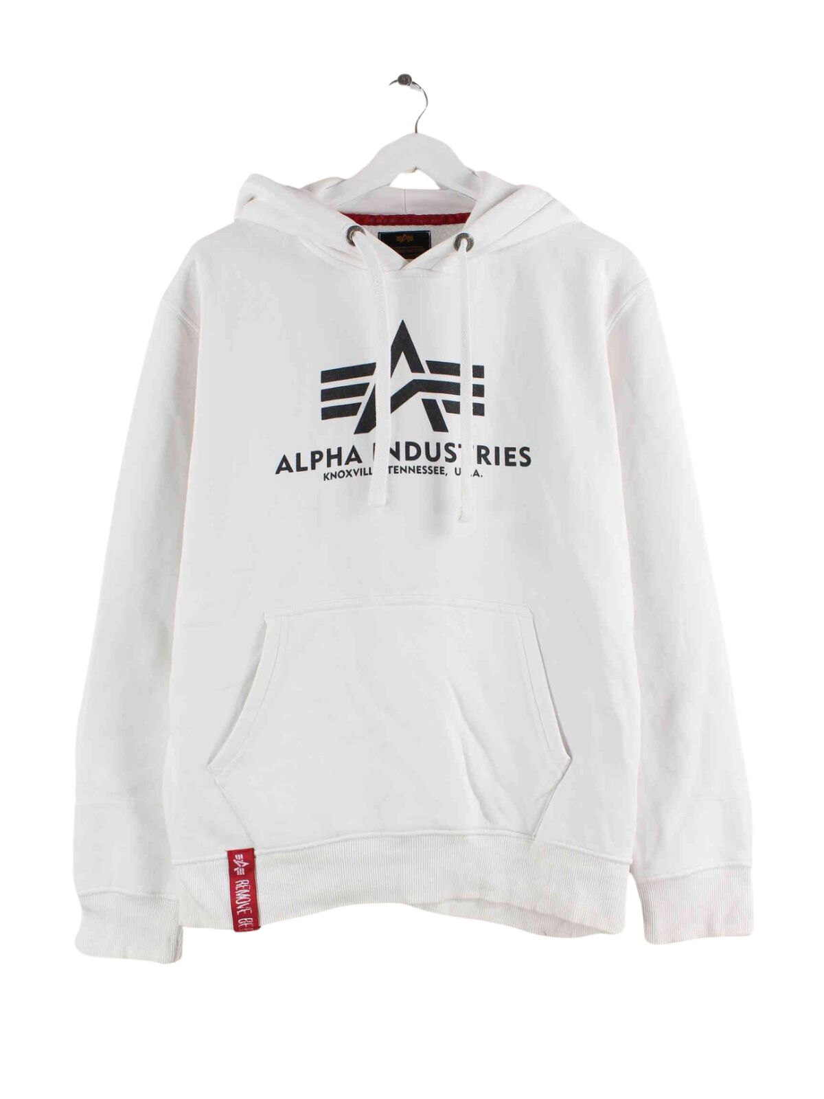 Weißer Hoodie von Alpha Industries in Größe M. Er ist aus einer Baumwollmischung und in sehr gutem Zustand im Bestand. Mit seltenem Print.