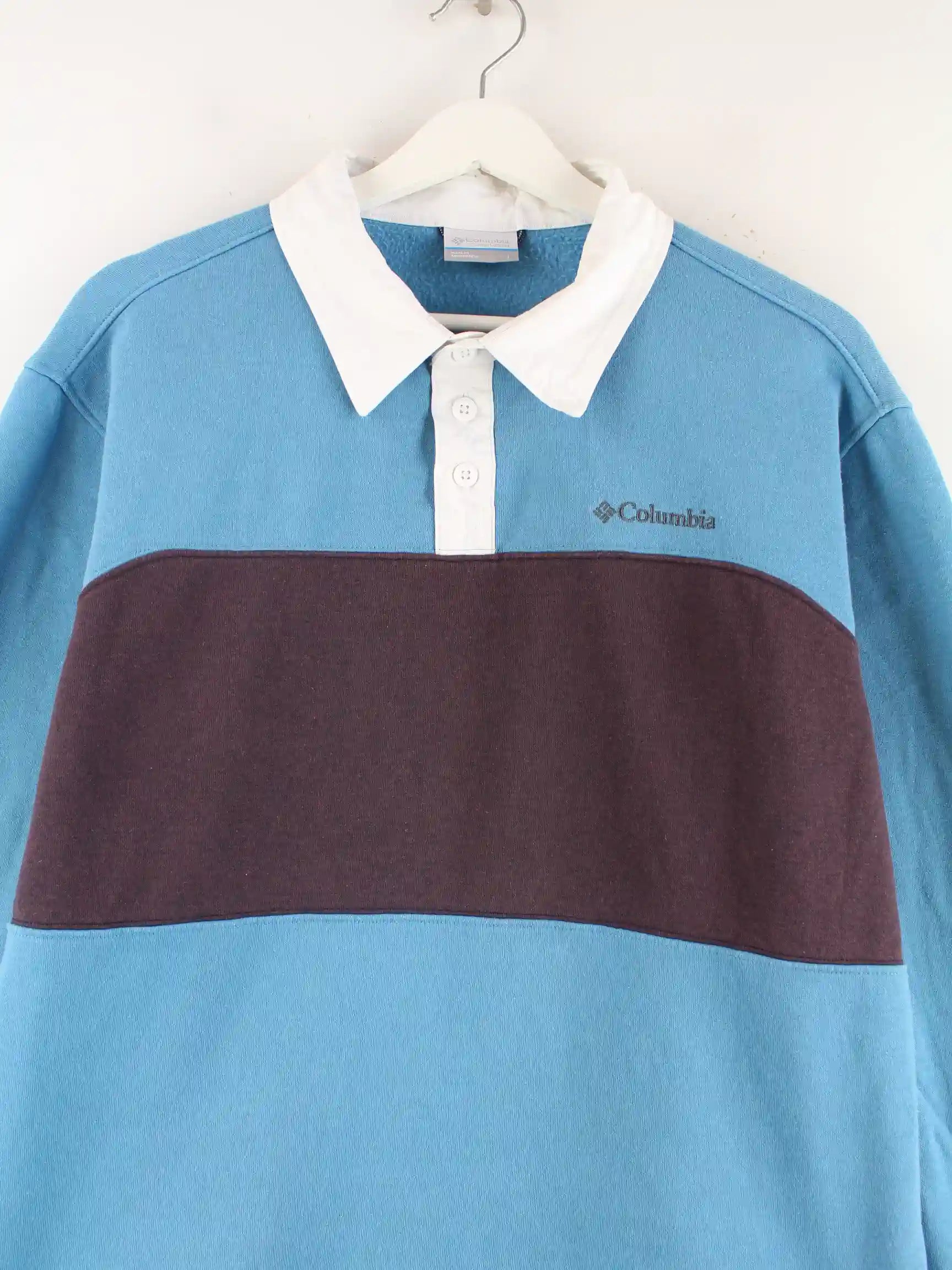 Poloshirt aus dem Hause Columbia in Größe L. Es ist aus Baumwolle gefertigt und in Blau auf Lager.