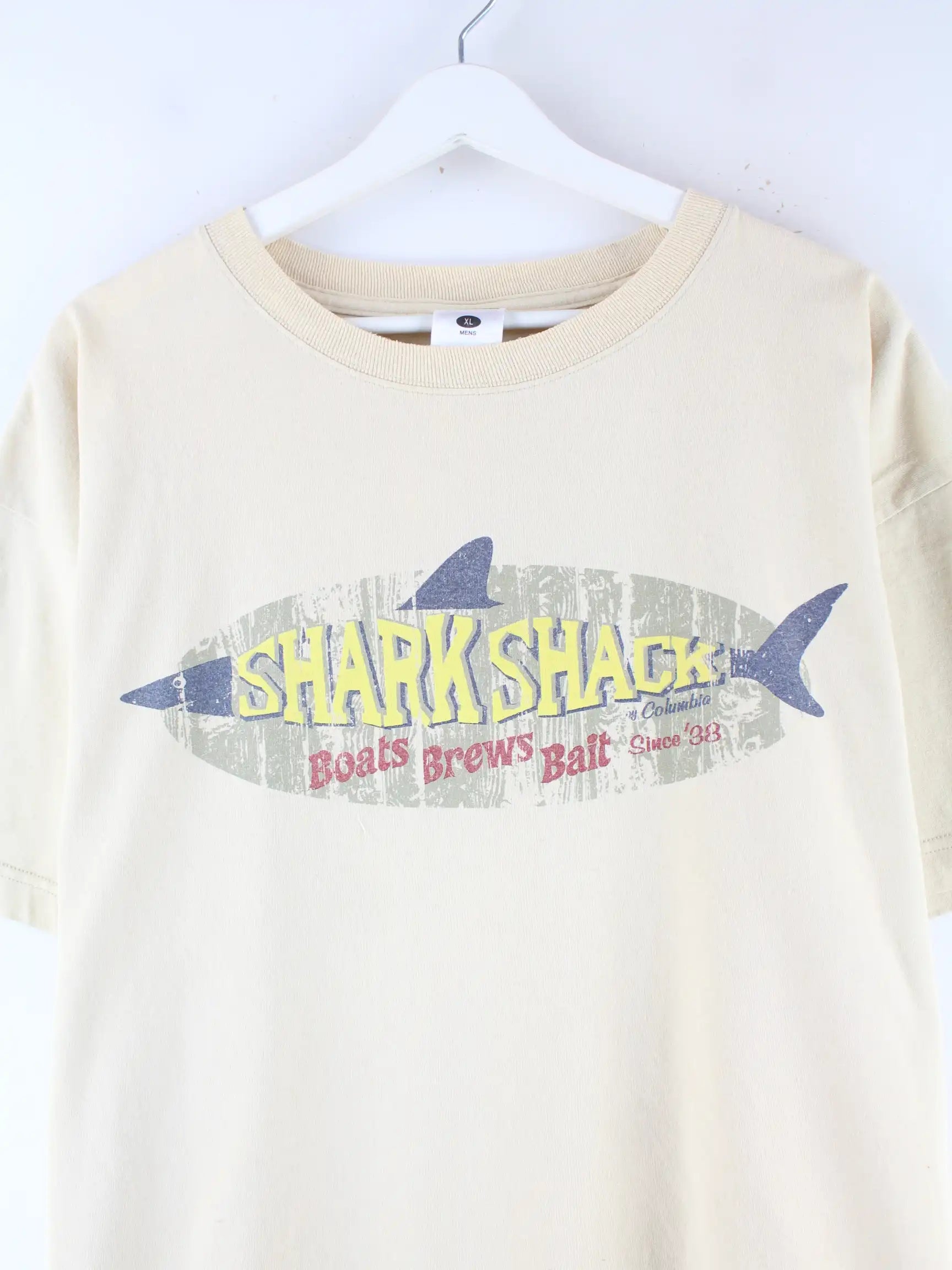 Beigefarbenes T-Shirt des Labels Columbia in Größe XL. Es ist aus einer Baumwollmischung hergestellt und in gutem Zustand im Bestand. Mit chiquem Shack Print.
