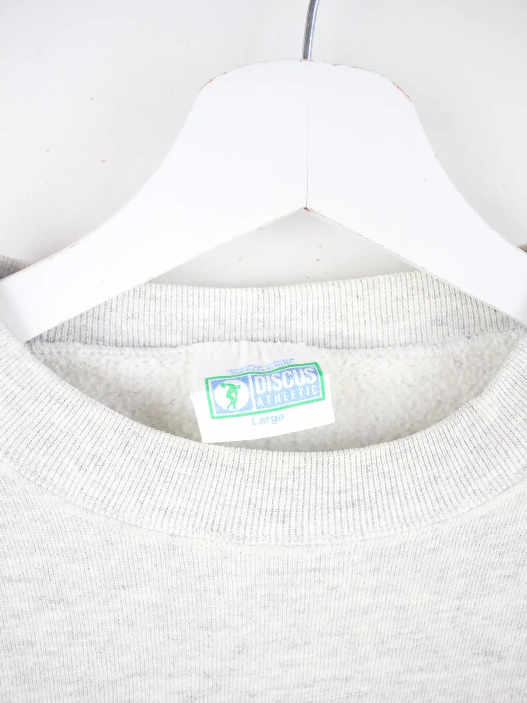 Grauer Sweater der Brand Discus Athletic aus den 90'ern in Größe L. Er ist aus einer Baumwollmischung hergestellt und in sehr gutem Zustand bei uns vorrätig.