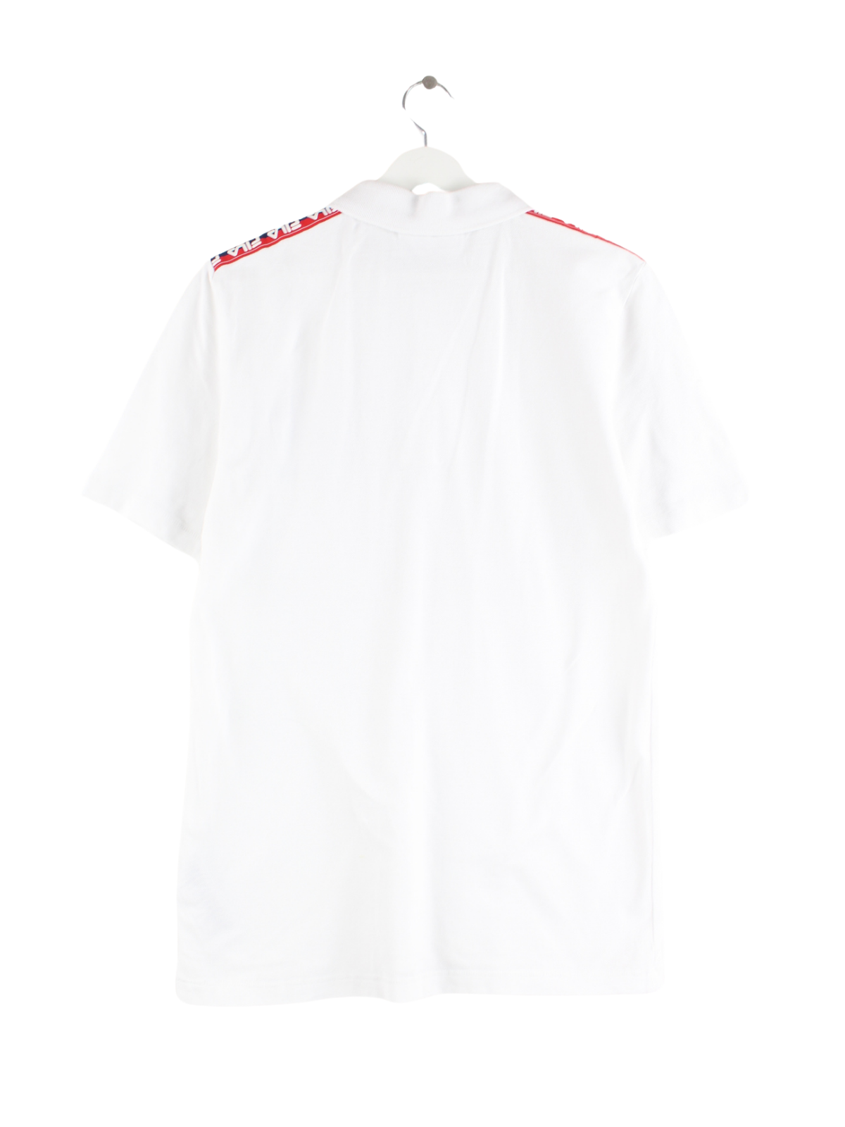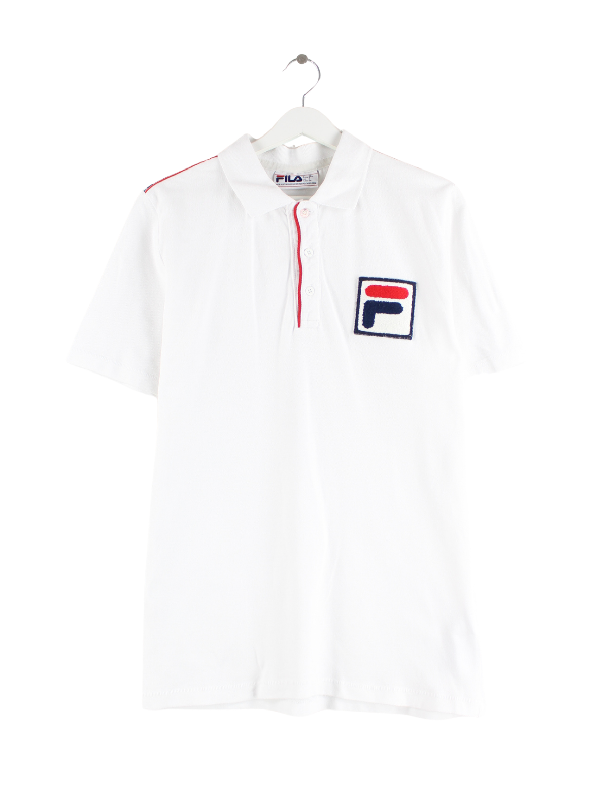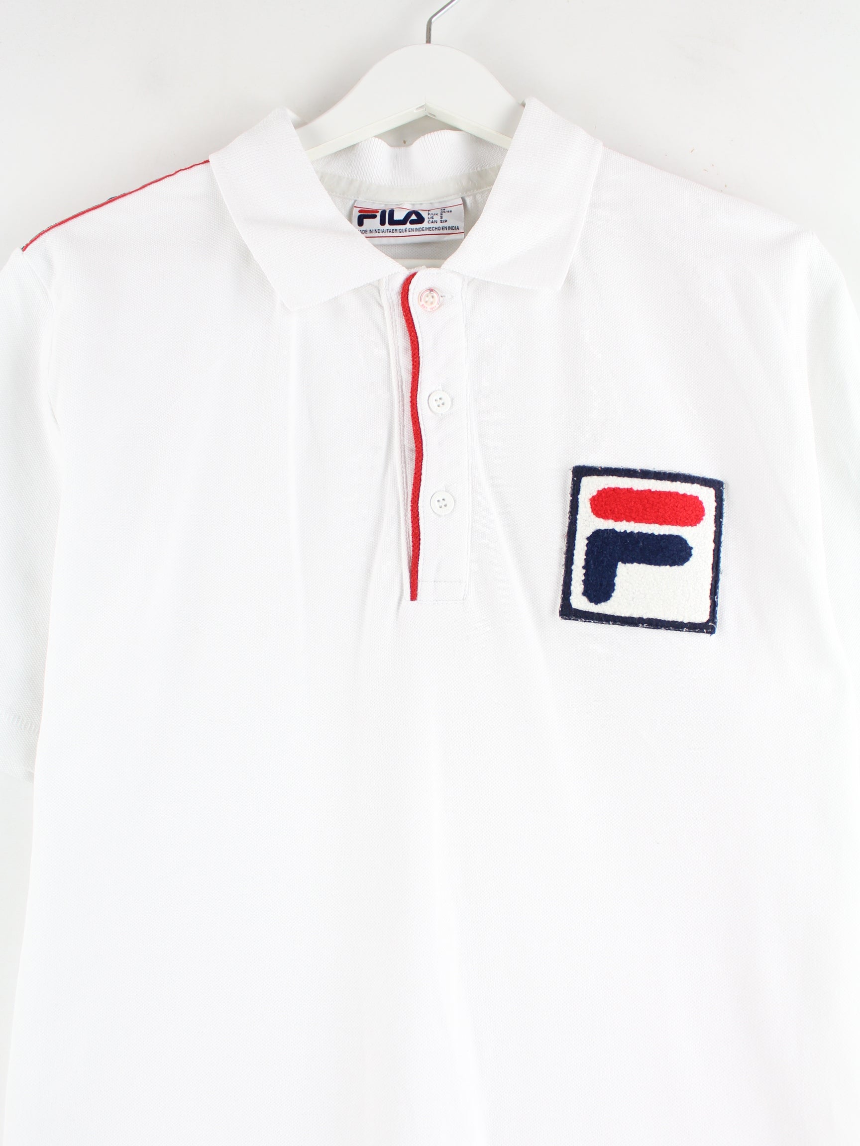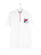 Weißes Poloshirt mit Stick des Labels Fila in Größe S. Es ist aus Baumwolle gefertigt und in sehr gutem Zustand bei uns zu bekommen.