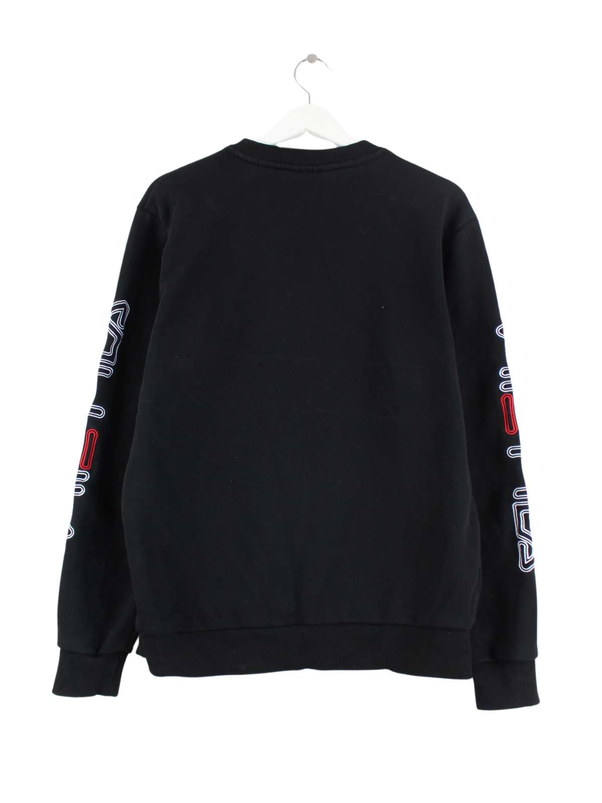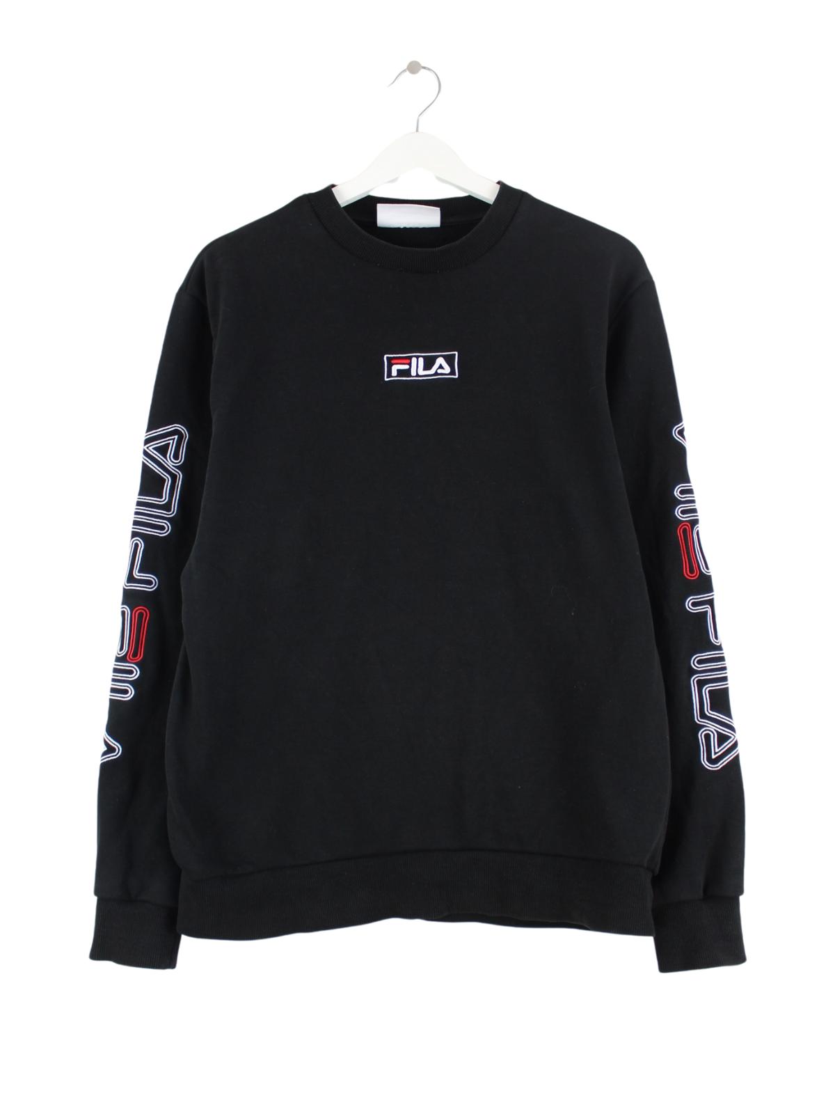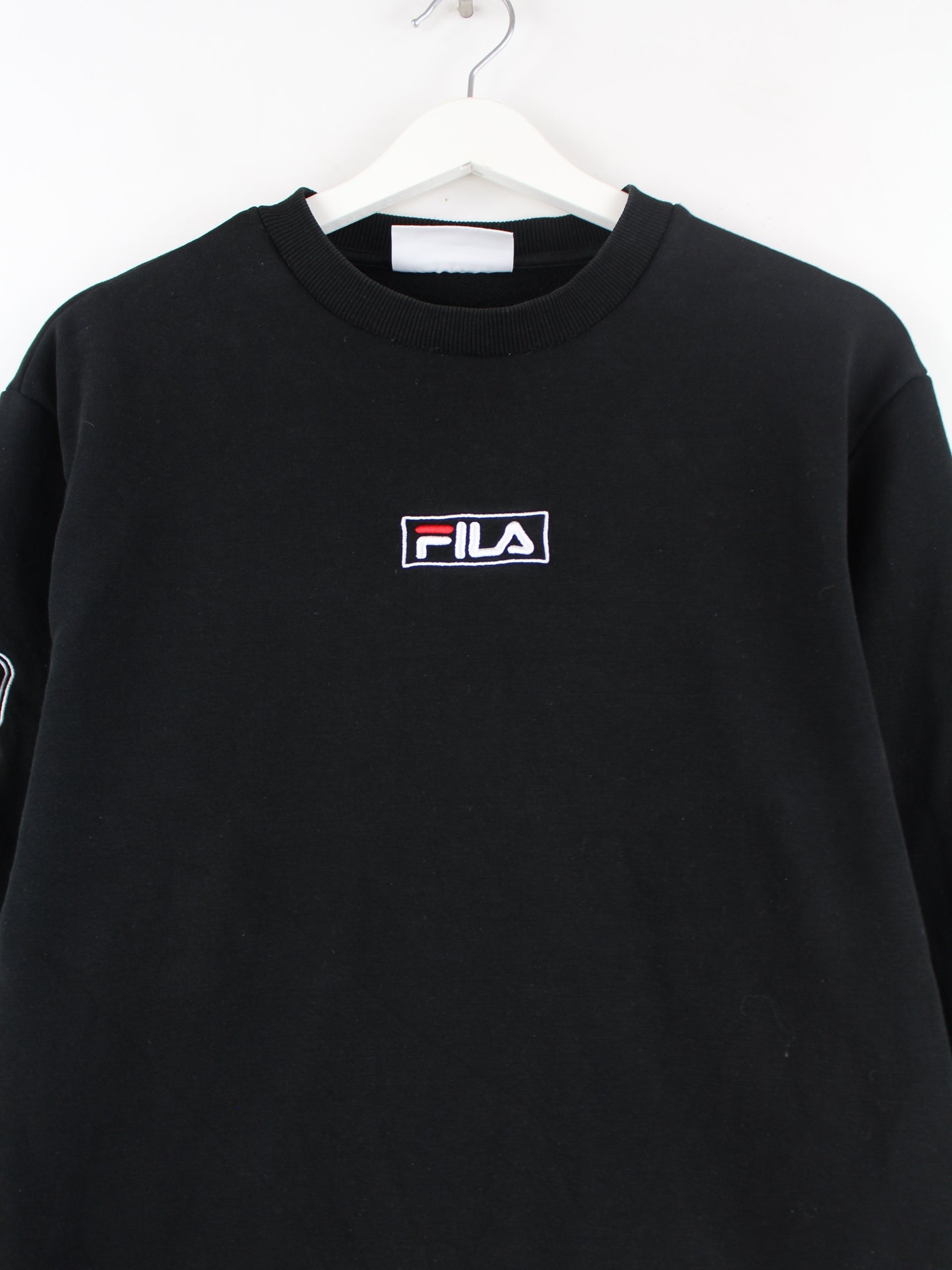 Schwarzer Sweater mit gesticktem Logo vom Brand Fila in Größe M. Er ist aus einer Baumwollmischung produziert und in sehr gutem Zustand im Bestand.