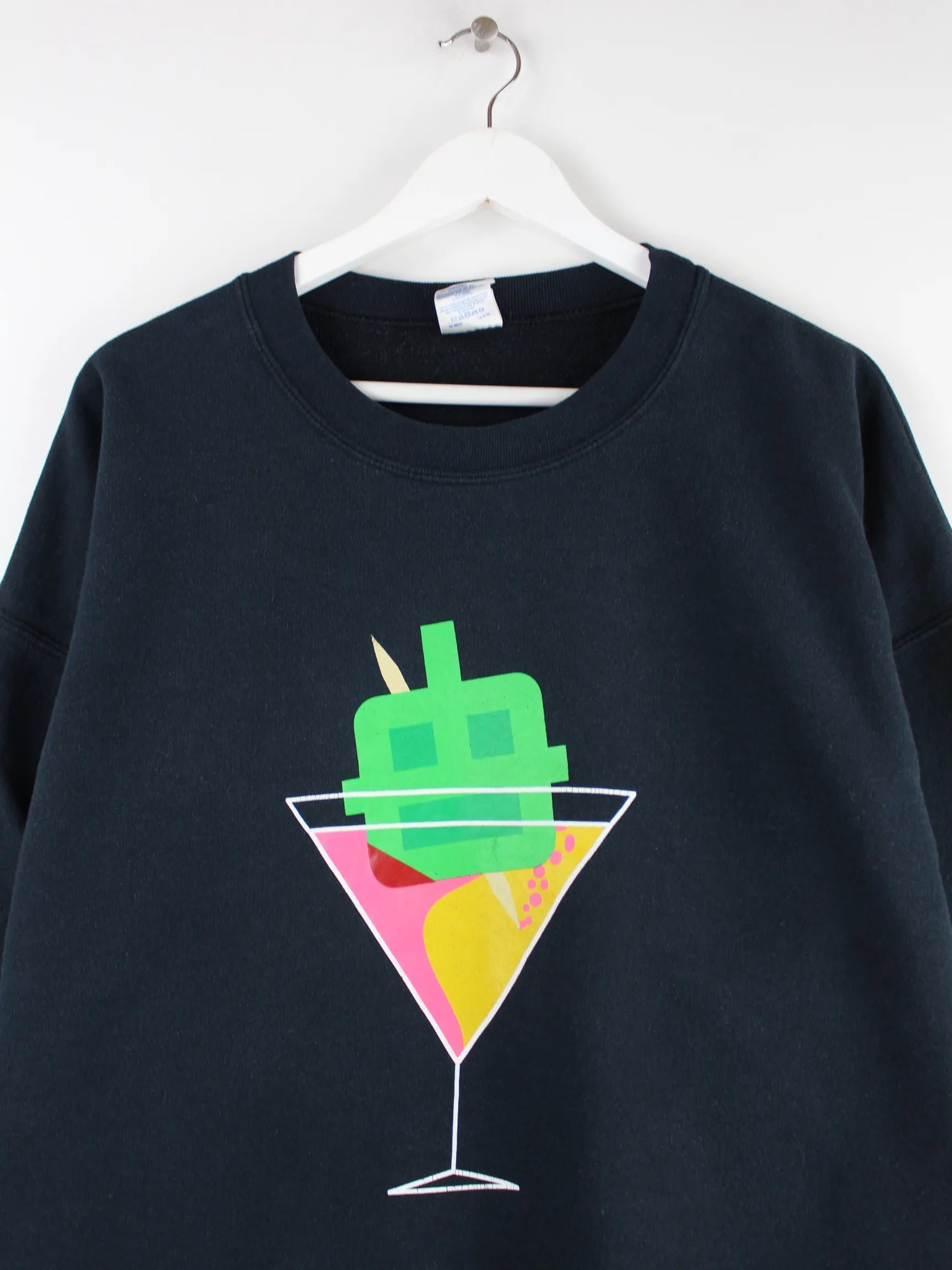 Schwarzer Sweater vom Label Gildan in Größe XL. Er ist aus einer Baumwollmischung hergestellt und in sehr gutem Zustand bei uns vorrätig. Mit schickem Cocktail Print.
