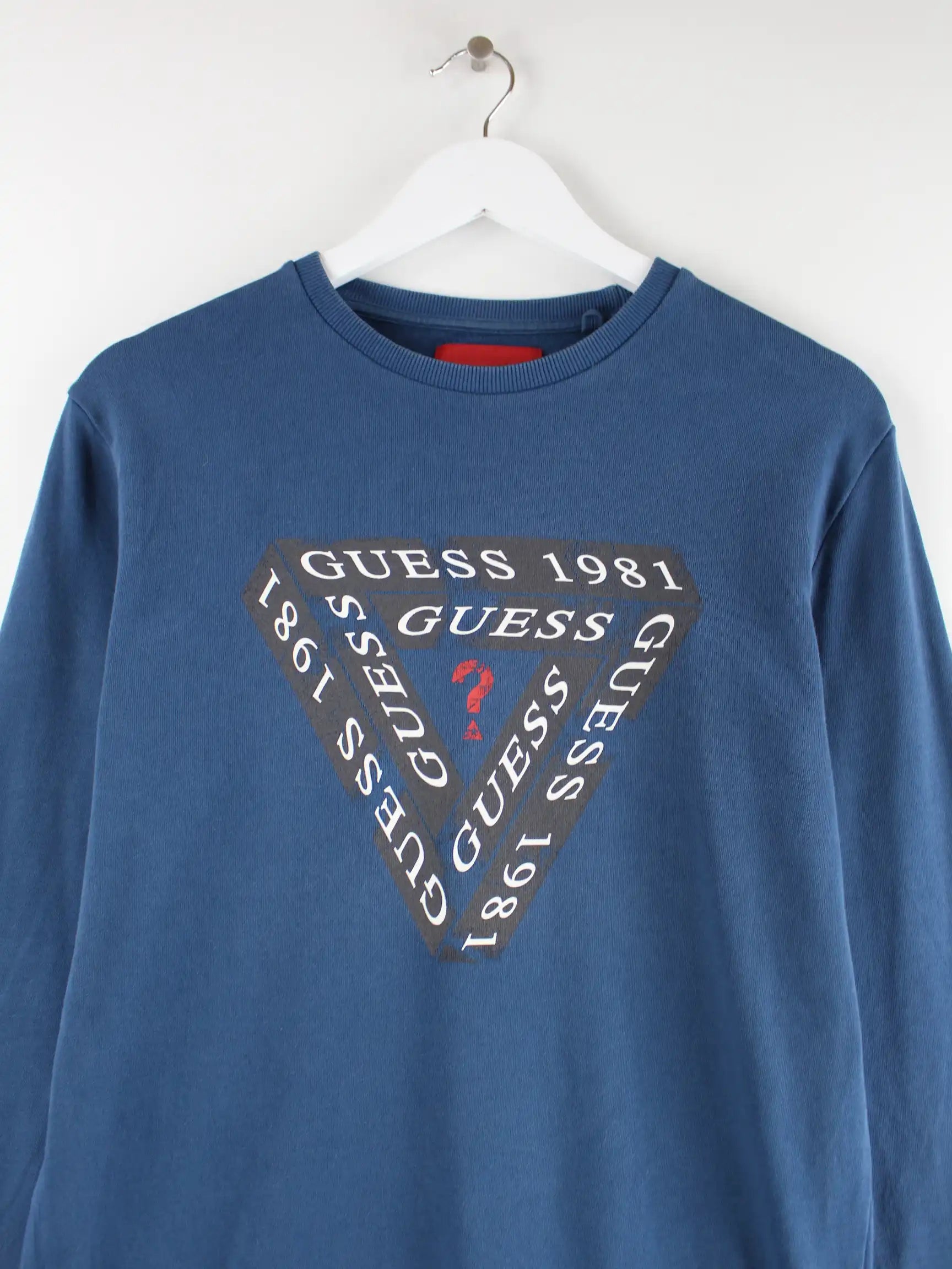 Sweater des Labels Guess in Größe S. Er ist aus einer Baumwollmischung hergestellt und in Blau auf Lager.