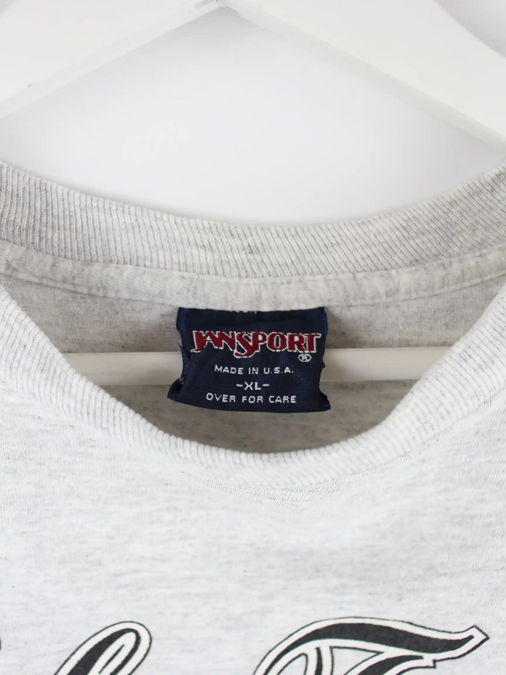 T-Shirt der Brand Jansport in Größe XL aus den 90'ern. Es ist aus Baumwolle gemacht und in Grau zu haben. Mit seltenem Basebal Print.