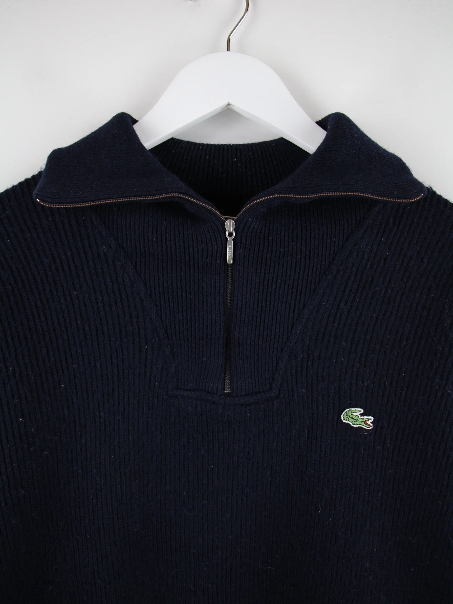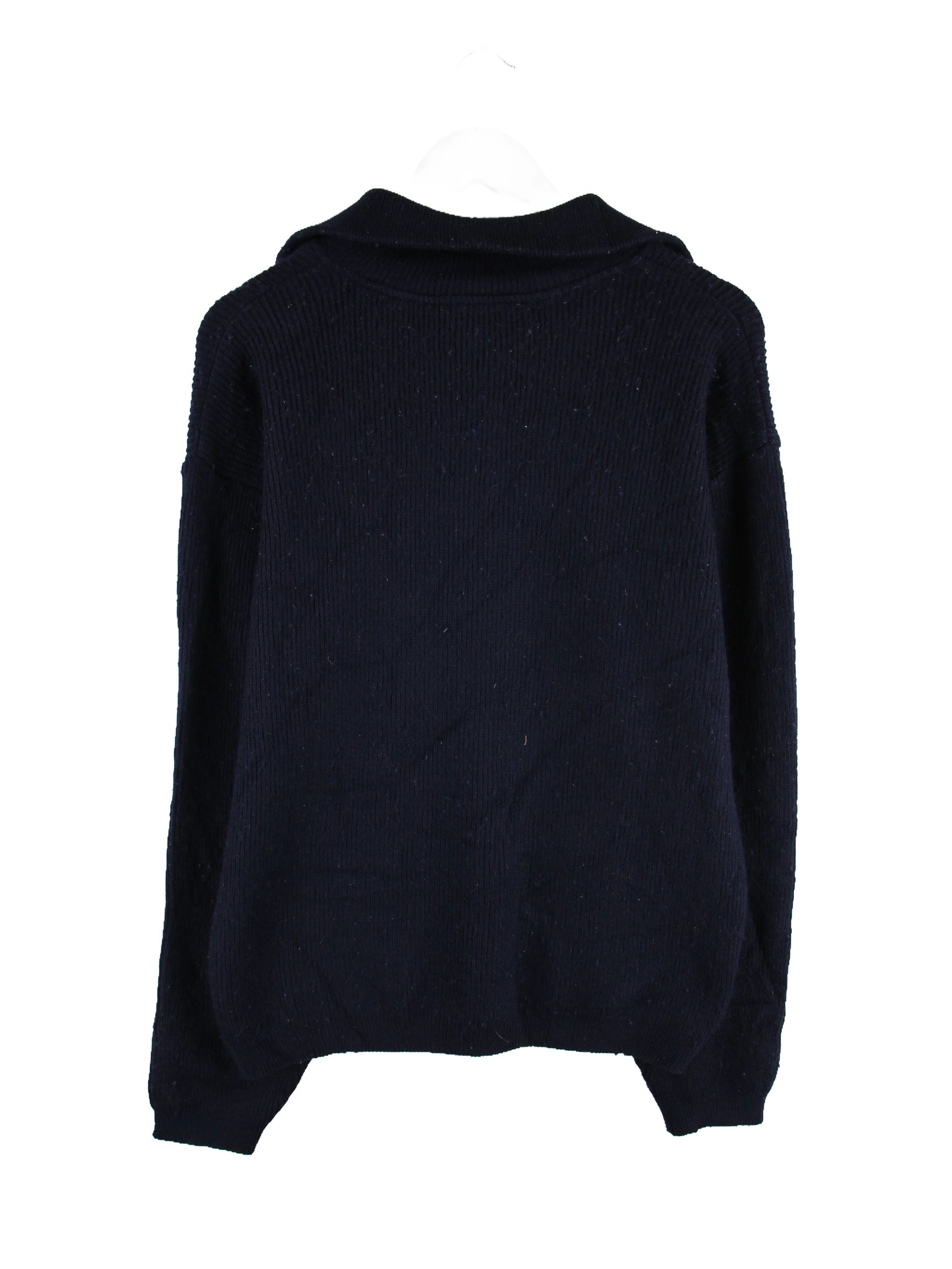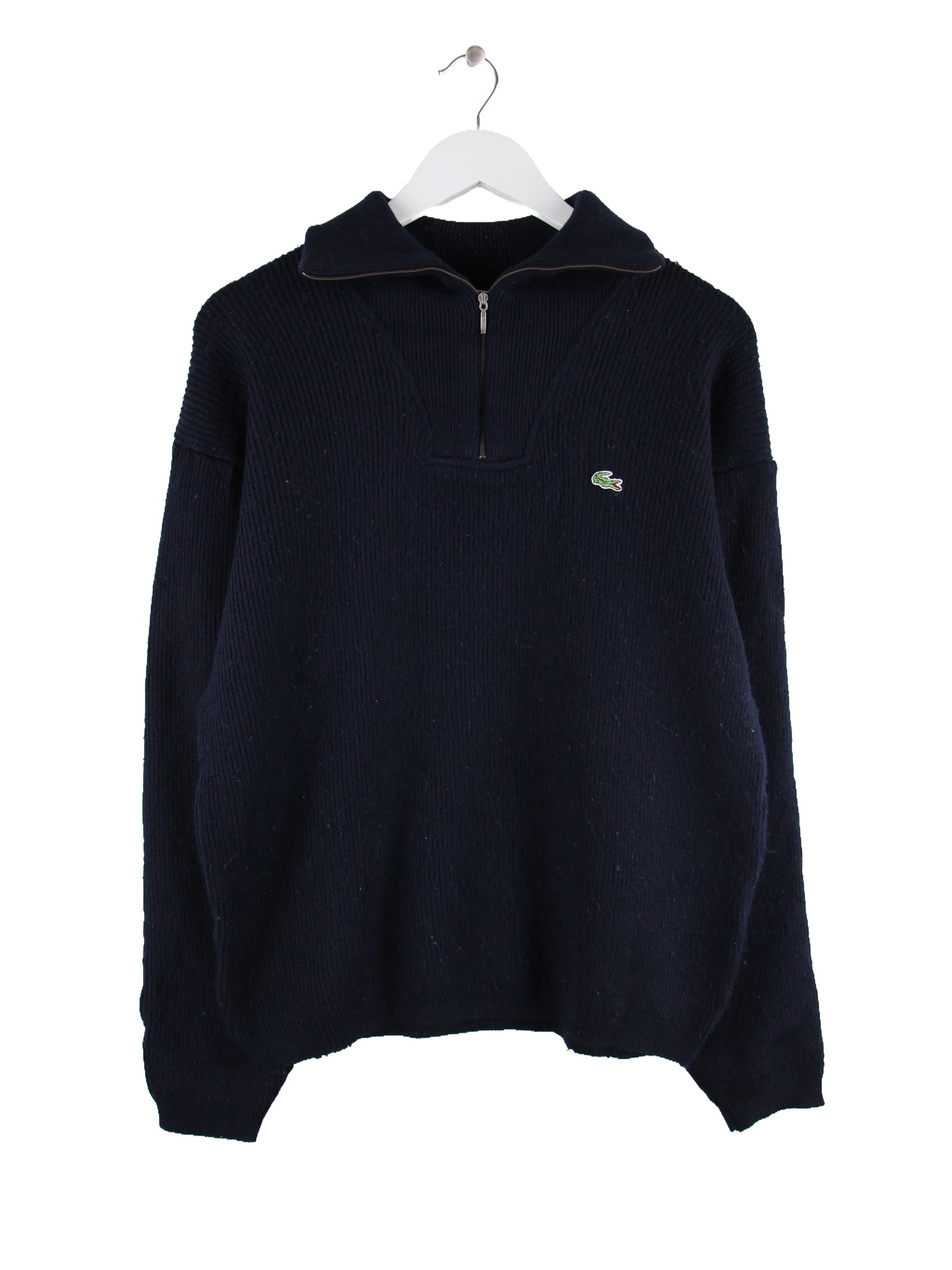 Pullover der Marke Lacoste mit kurzem Reißverschluß in Größe S. Er ist aus einer Wollmischung hergestellt und in Blau lieferbar.