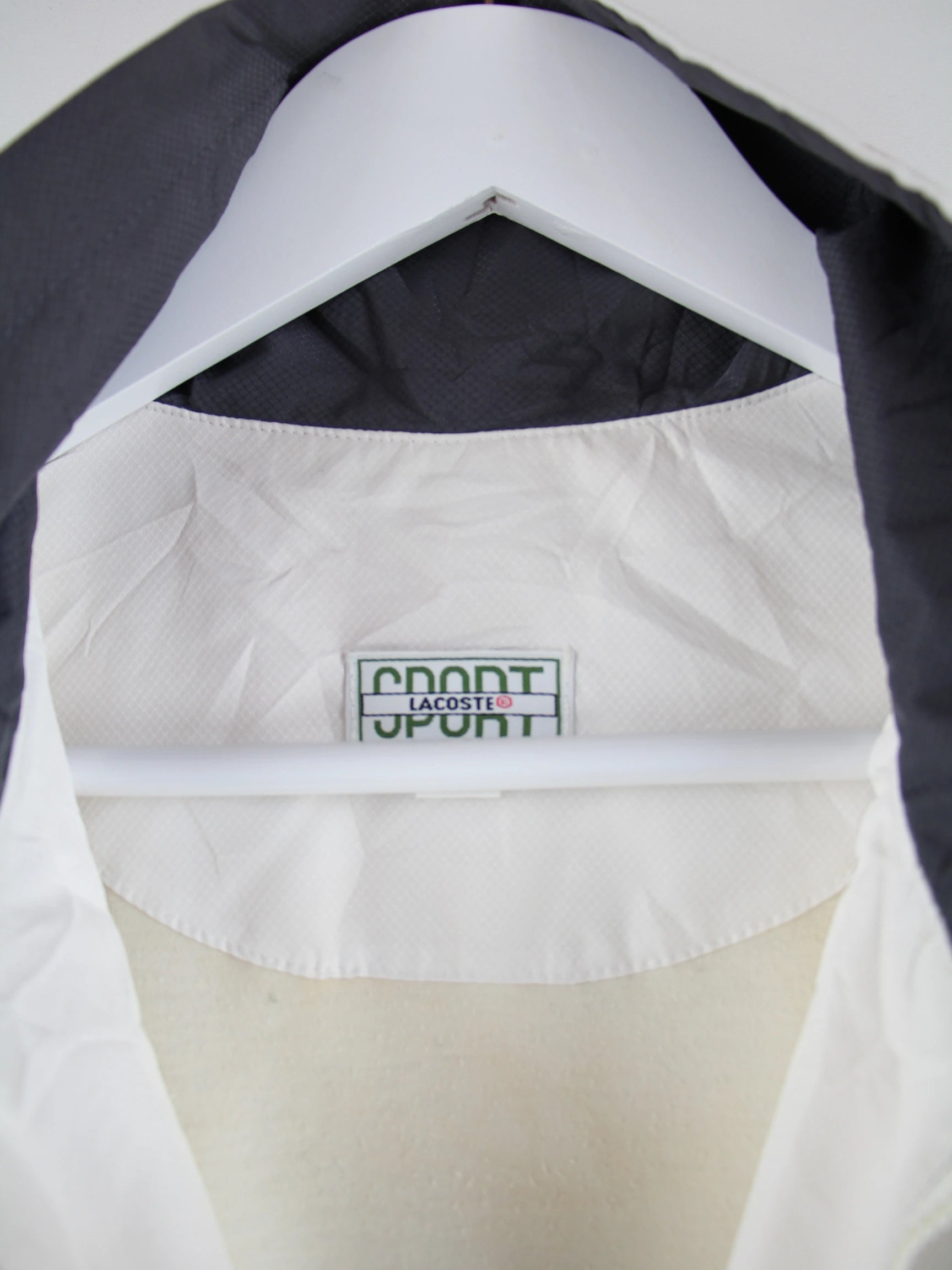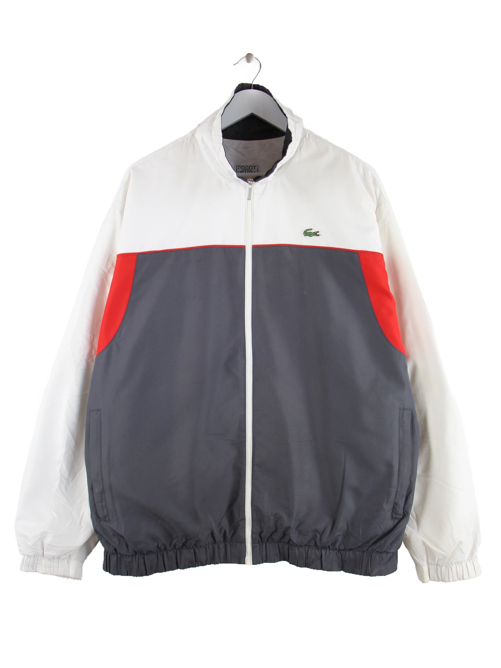 Graue Trainingsjacke vom Brand Lacoste in Größe XL. Sie ist aus Synthetik gefertigt und in gutem Zustand bei uns vorrätig.
