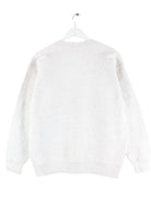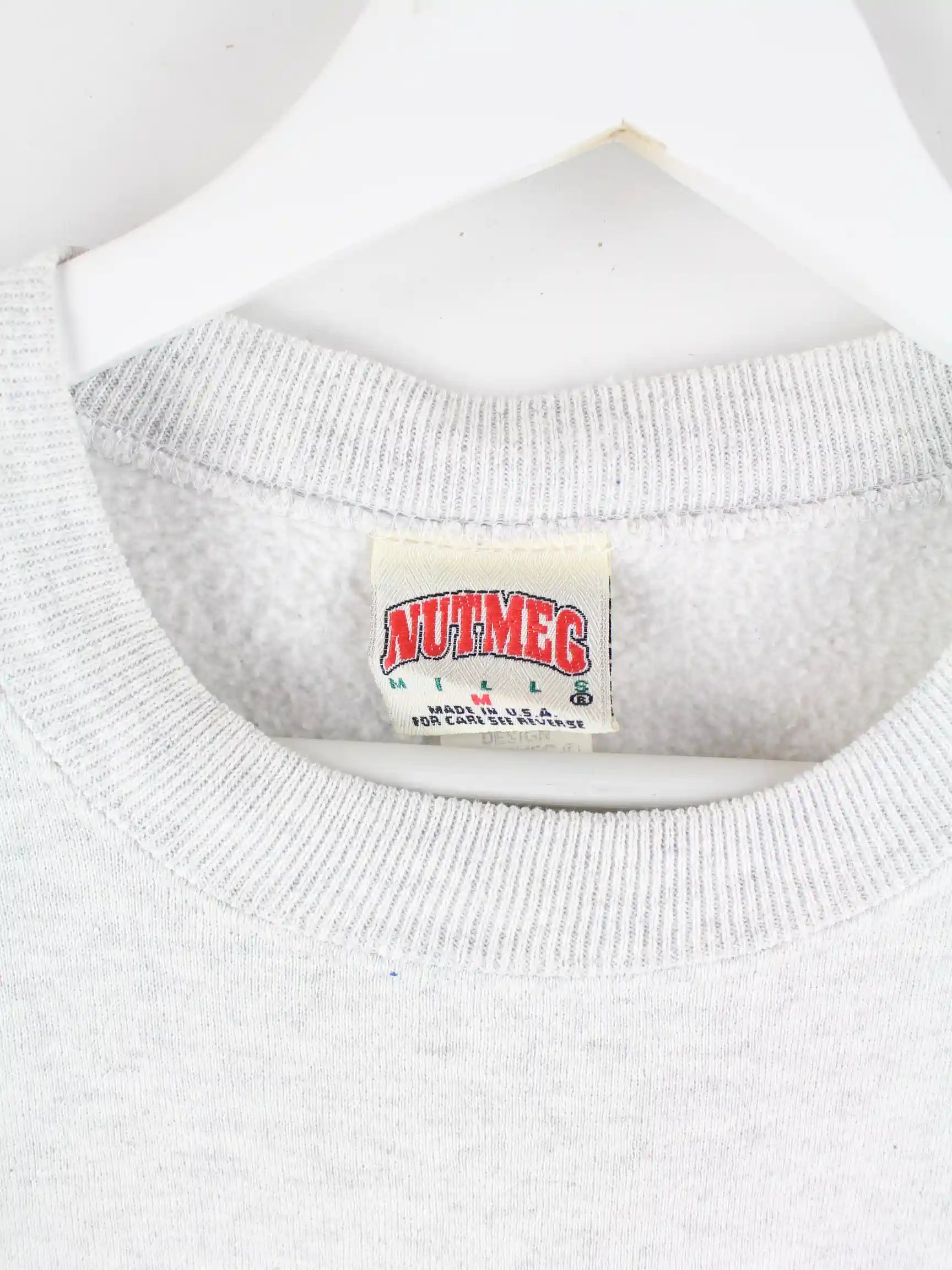 Grauer Sweater mit Stickereien der Brand Nutmeg aus den 90'ern in Größe M. Er ist aus einer Baumwollmischung und in gutem Zustand lieferbar.