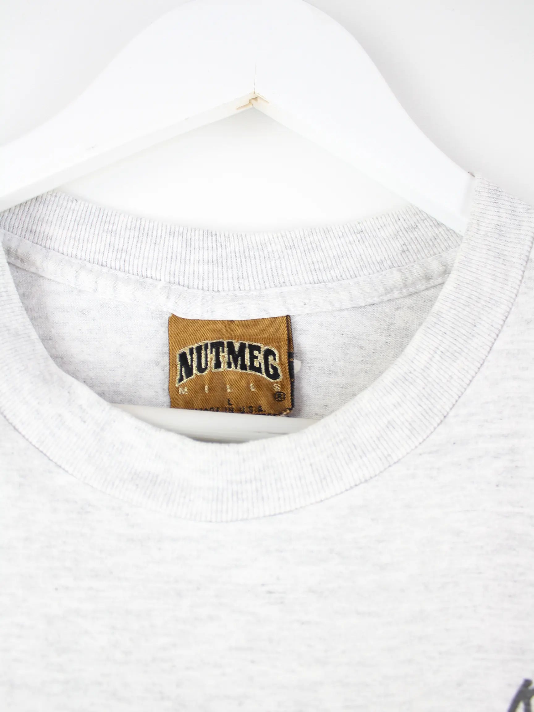 Graues T-Shirt des Labels Nutmeg aus den 90'ern in Größe L. Es ist aus Baumwolle hergestellt und in gutem Zustand bei uns zu bekommen. Mit seltenem Florida Print.