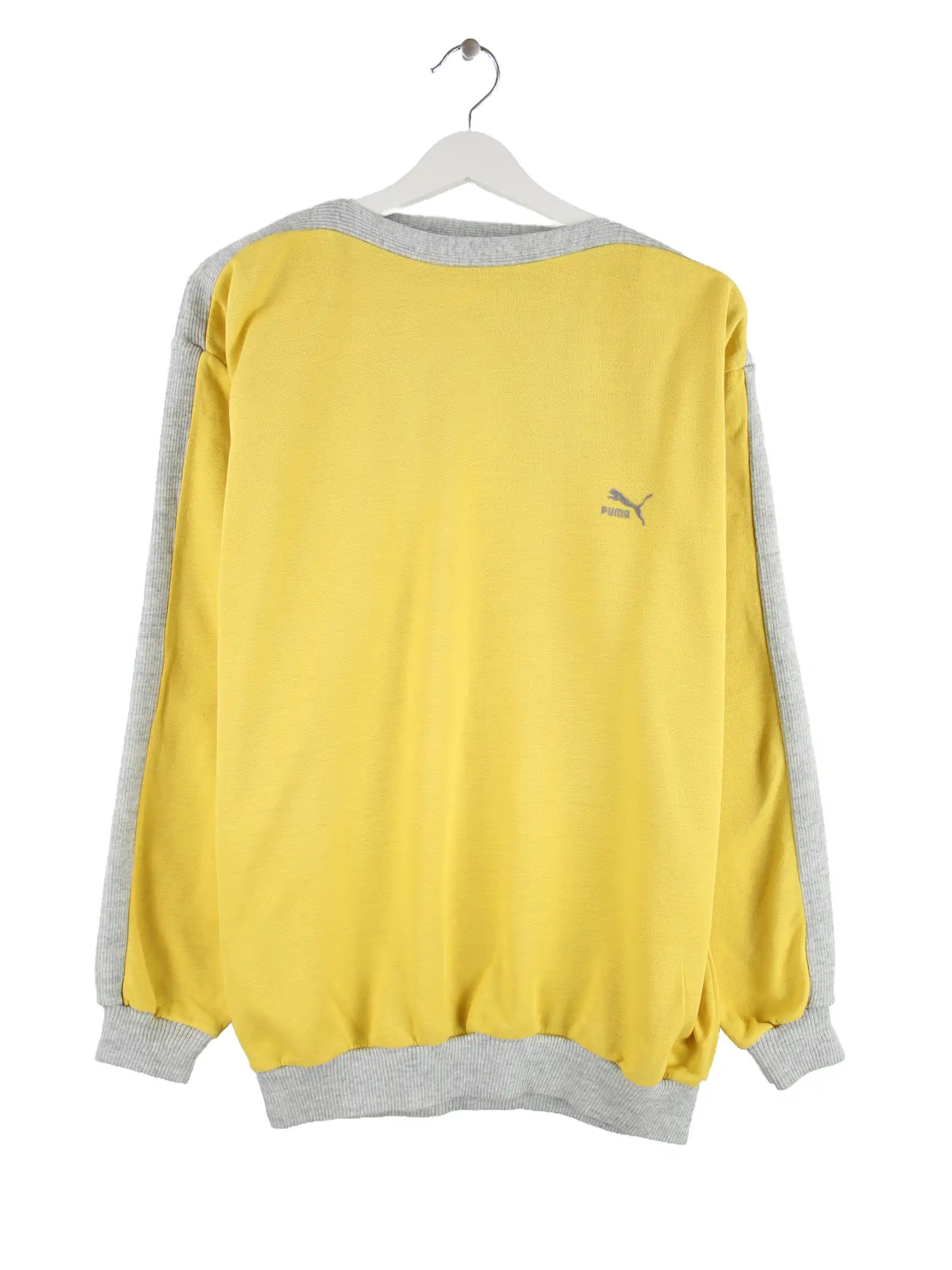 Gelber Sweater des Labels Puma aus den 80'ern in Größe S. Er ist aus einer Baumwollmischung gefertigt und in sehr gutem Zustand bei uns zu bekommen.