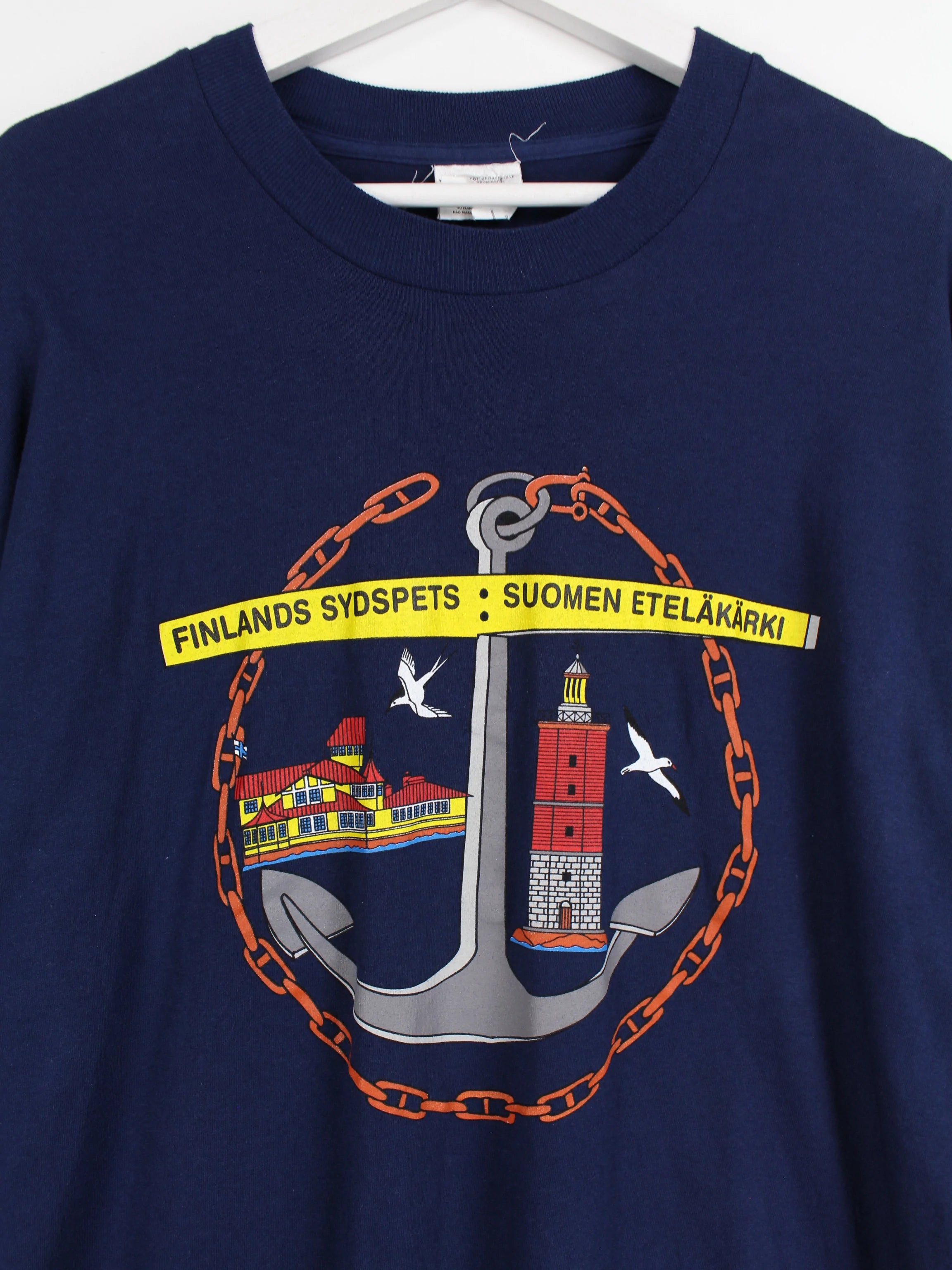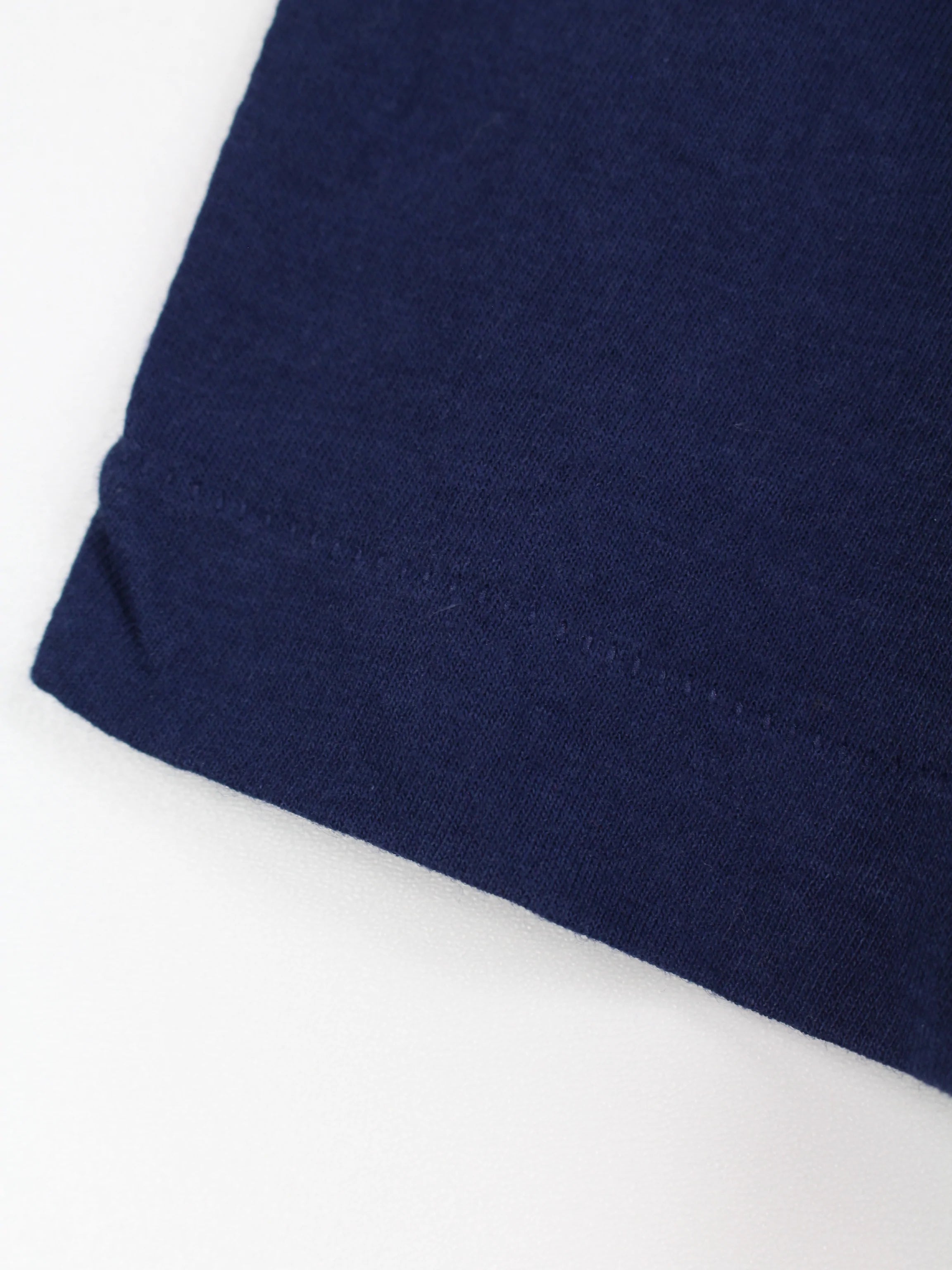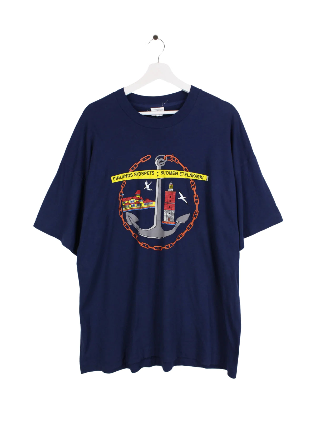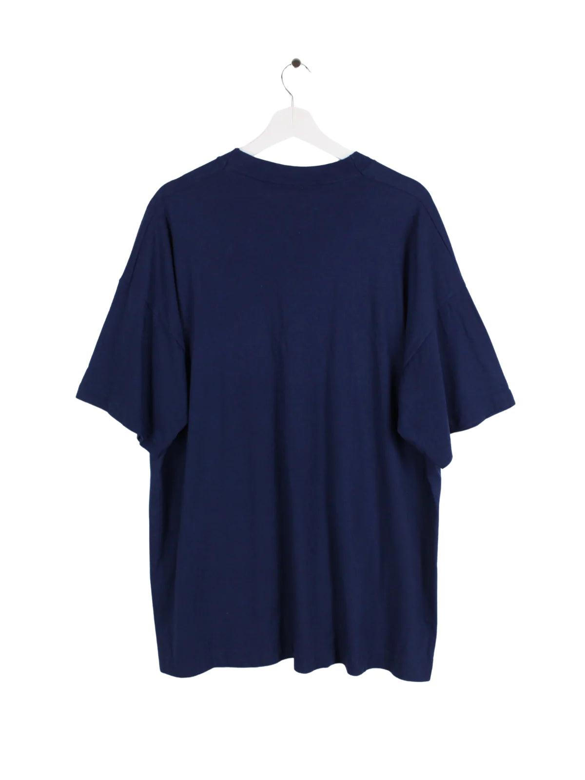 Blaues Vintage Single Stitch T-Shirt mit großem Print auf der Front.