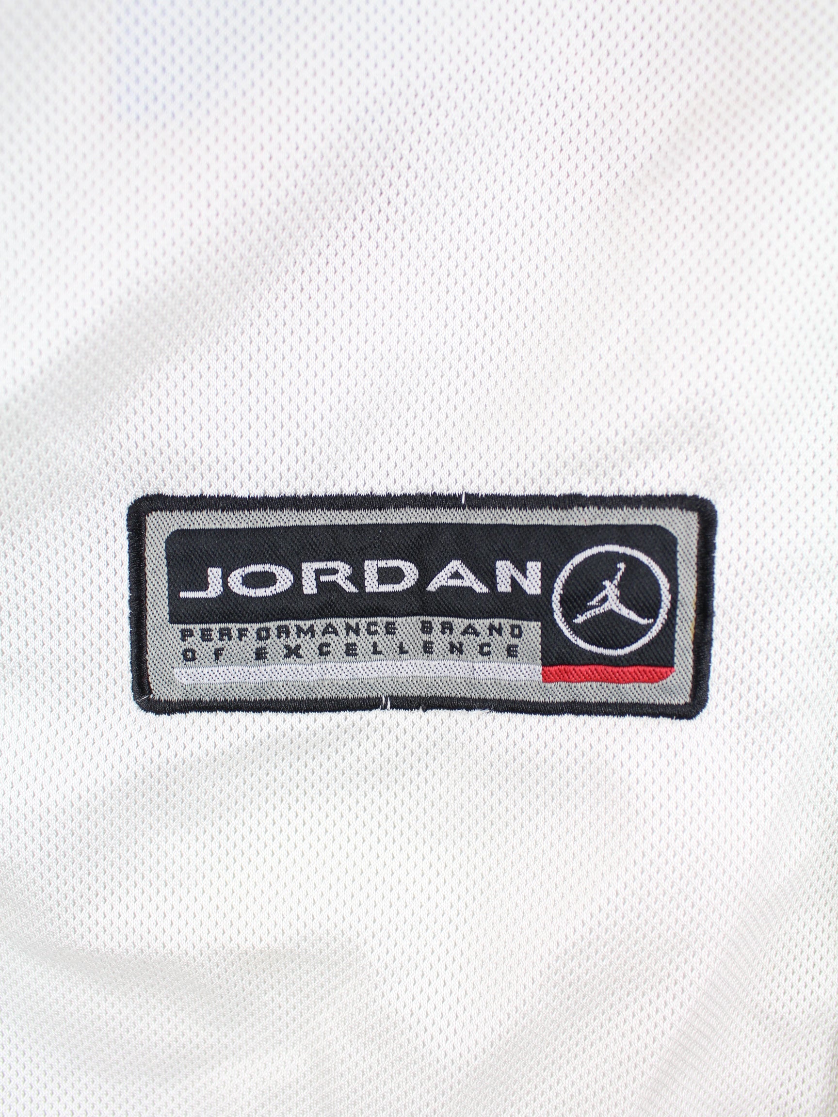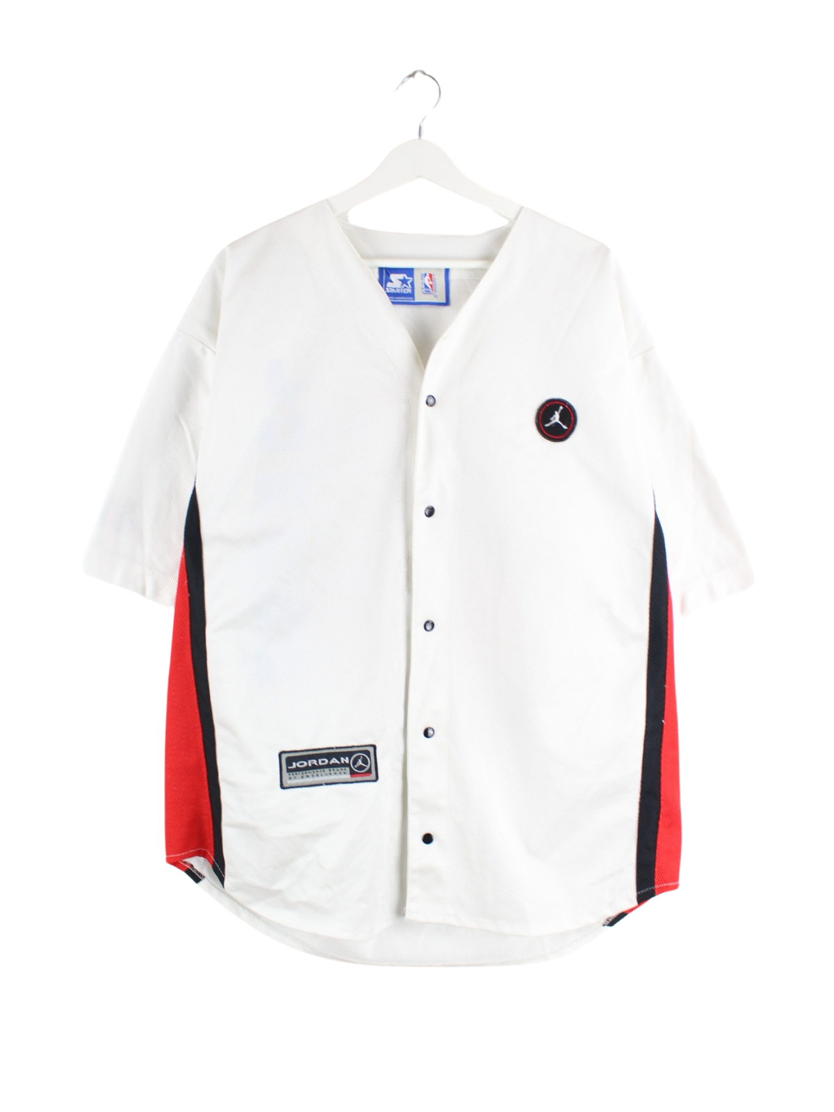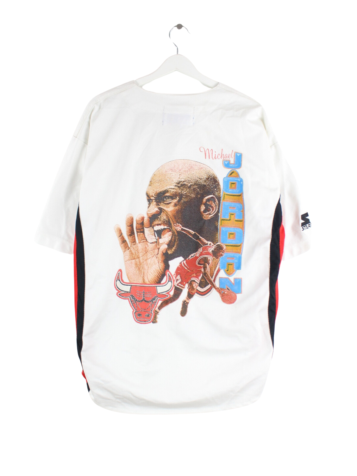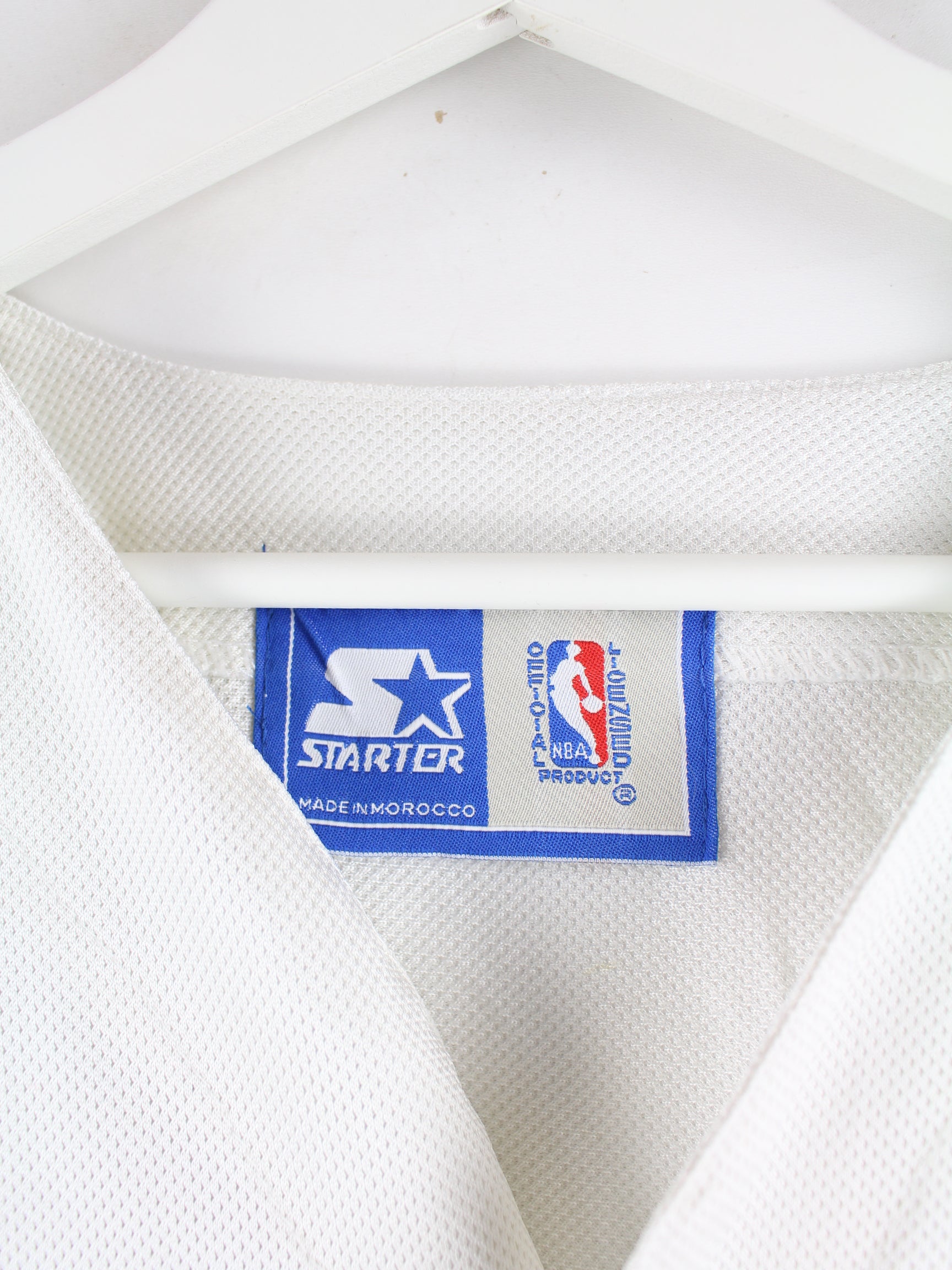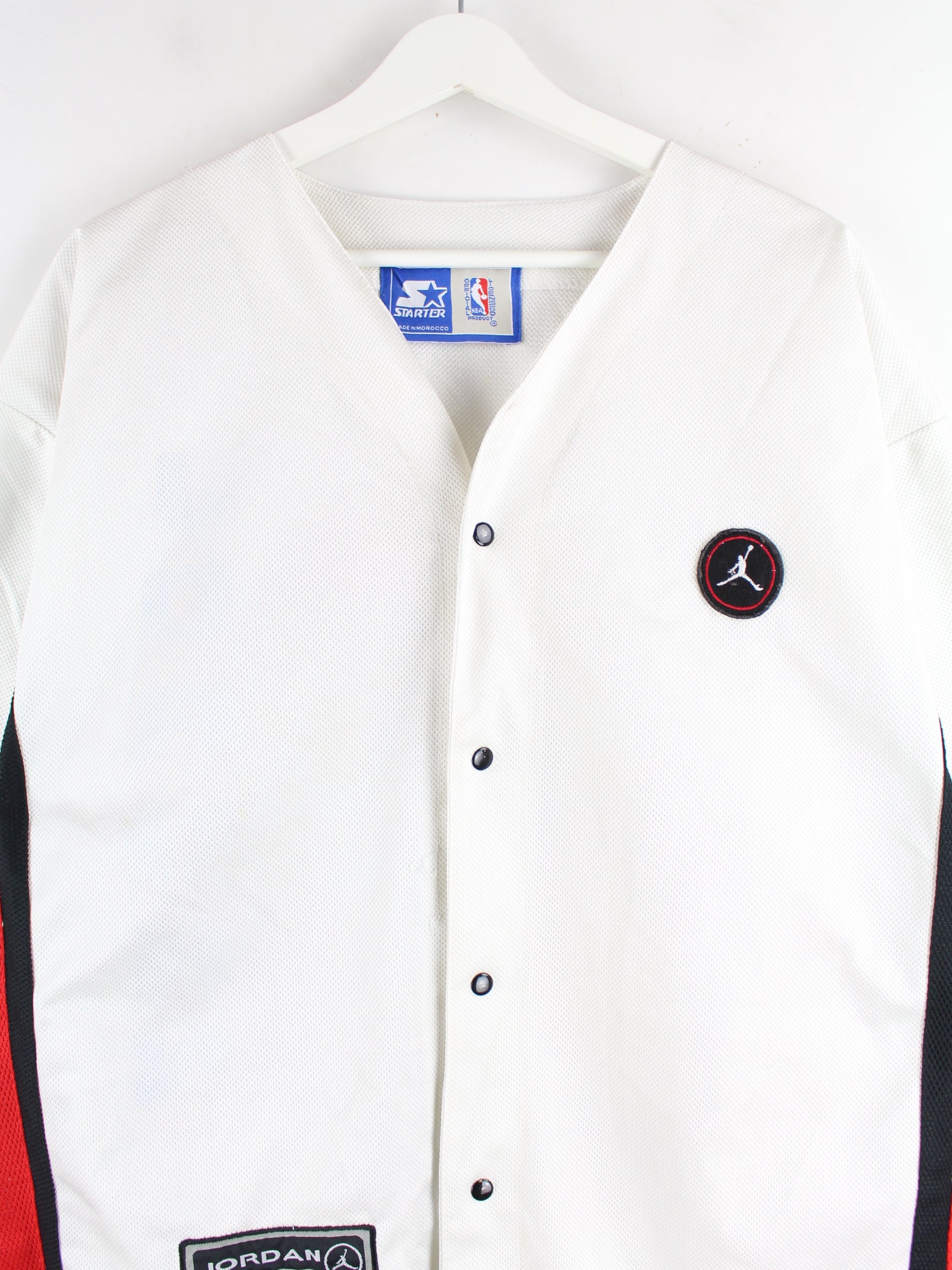 Jersey von Starter in Größe XL aus den 90'ern. Es ist aus Synthetik angefertigt und in Weiß bei uns vorrätig. Mit chiquem Jordan Print.
