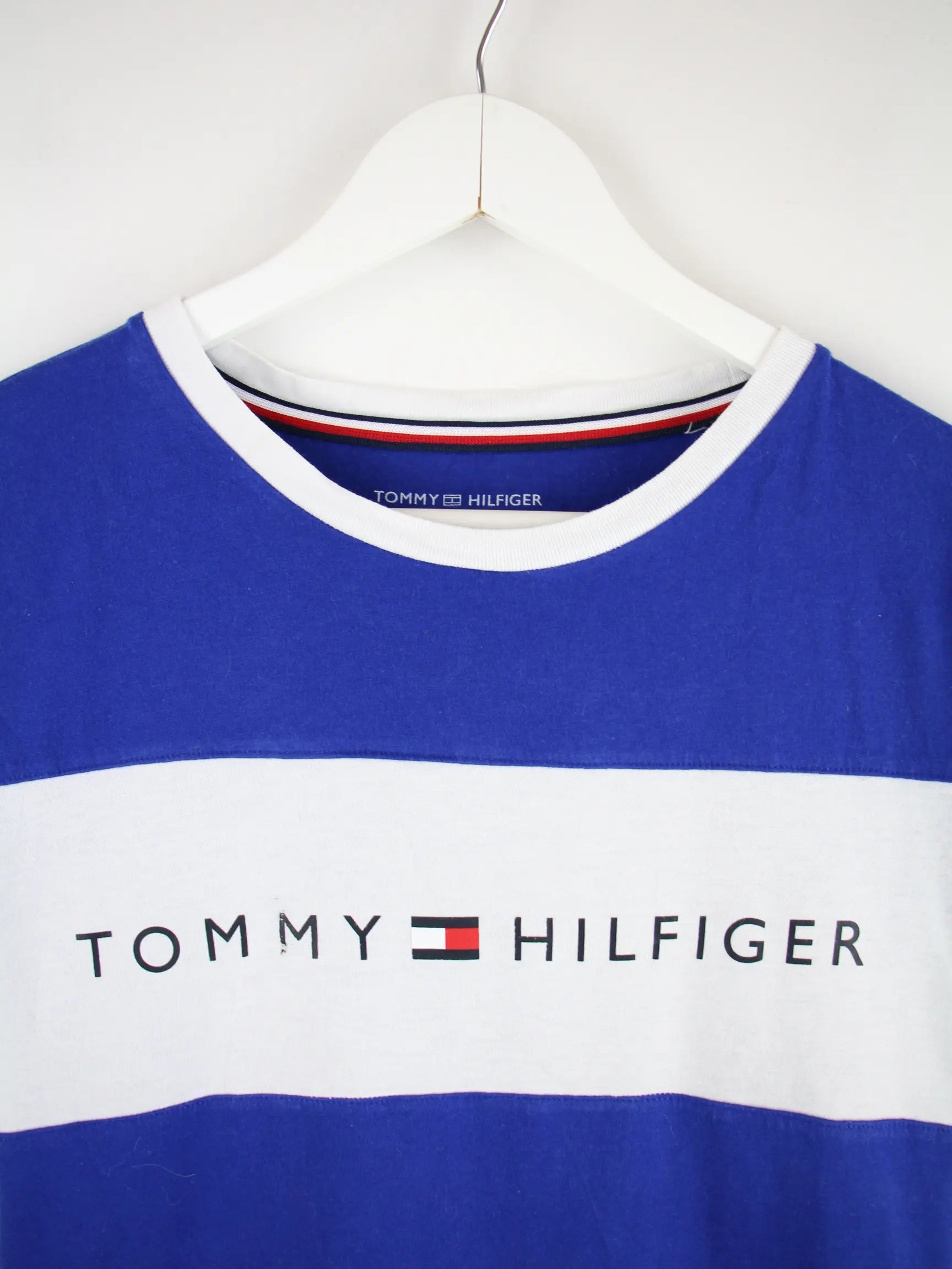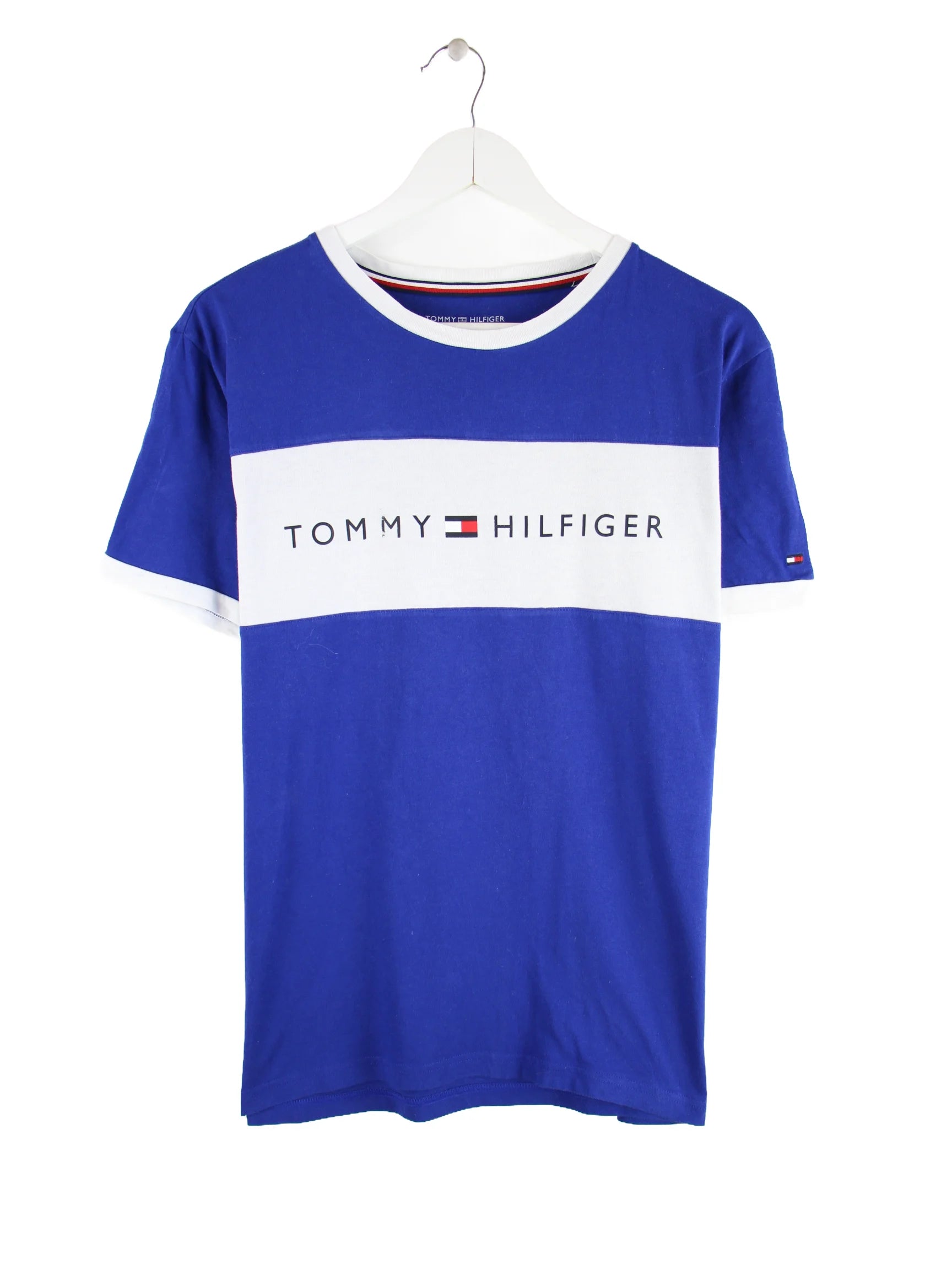Blaues T-Shirt der Marke Tommy Hilfiger in Größe M. Es ist aus Baumwolle gefertigt und in gutem Zustand bei uns zu bekommen. Mit chiquem Print.
