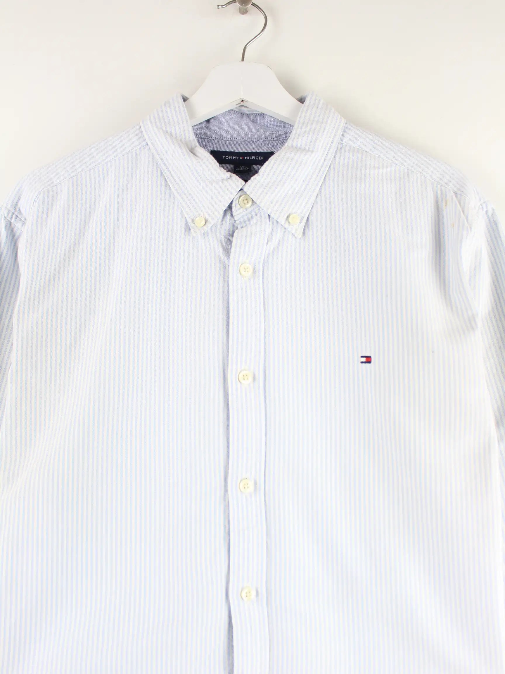 Blaues Hemd von Tommy Hilfiger in Größe L. Es ist aus Baumwolle produziert. Den Zustand würden wir als 'In Ordnung' bezeichnen (vergl. Bilder).